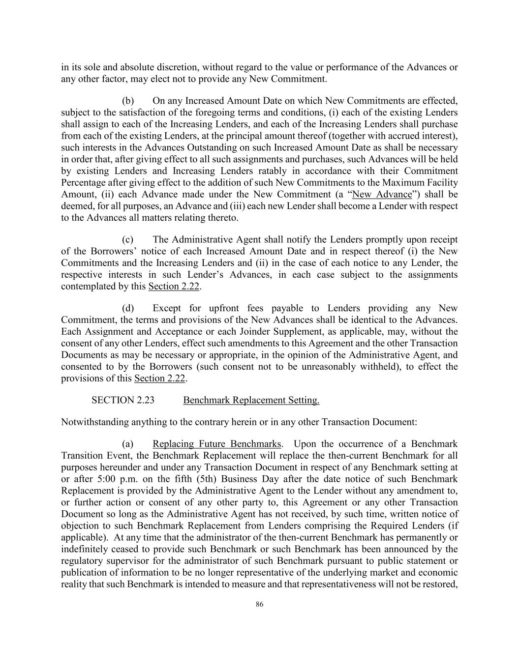 86 in its sole and absolute discretion, without regard to the value or performance of the Advances or any other factor, may elect not to provide any New Commitment. (b) On any Increased Amount Date on which New Commitments are effected, subject to the satisfaction of the foregoing terms and conditions, (i) each of the existing Lenders shall assign to each of the Increasing Lenders, and each of the Increasing Lenders shall purchase from each of the existing Lenders, at the principal amount thereof (together with accrued interest), such interests in the Advances Outstanding on such Increased Amount Date as shall be necessary in order that, after giving effect to all such assignments and purchases, such Advances will be held by existing Lenders and Increasing Lenders ratably in accordance with their Commitment Percentage after giving effect to the addition of such New Commitments to the Maximum Facility Amount, (ii) each Advance made under the New Commitment (a “New Advance”) shall be deemed, for all purposes, an Advance and (iii) each new Lender shall become a Lender with respect to the Advances all matters relating thereto. (c) The Administrative Agent shall notify the Lenders promptly upon receipt of the Borrowers’ notice of each Increased Amount Date and in respect thereof (i) the New Commitments and the Increasing Lenders and (ii) in the case of each notice to any Lender, the respective interests in such Lender’s Advances, in each case subject to the assignments contemplated by this Section 2.22. (d) Except for upfront fees payable to Lenders providing any New Commitment, the terms and provisions of the New Advances shall be identical to the Advances. Each Assignment and Acceptance or each Joinder Supplement, as applicable, may, without the consent of any other Lenders, effect such amendments to this Agreement and the other Transaction Documents as may be necessary or appropriate, in the opinion of the Administrative Agent, and consented to by the Borrowers (such consent not to be unreasonably withheld), to effect the provisions of this Section 2.22. SECTION 2.23 Benchmark Replacement Setting. Notwithstanding anything to the contrary herein or in any other Transaction Document: (a) Replacing Future Benchmarks. Upon the occurrence of a Benchmark Transition Event, the Benchmark Replacement will replace the then-current Benchmark for all purposes hereunder and under any Transaction Document in respect of any Benchmark setting at or after 5:00 p.m. on the fifth (5th) Business Day after the date notice of such Benchmark Replacement is provided by the Administrative Agent to the Lender without any amendment to, or further action or consent of any other party to, this Agreement or any other Transaction Document so long as the Administrative Agent has not received, by such time, written notice of objection to such Benchmark Replacement from Lenders comprising the Required Lenders (if applicable). At any time that the administrator of the then-current Benchmark has permanently or indefinitely ceased to provide such Benchmark or such Benchmark has been announced by the regulatory supervisor for the administrator of such Benchmark pursuant to public statement or publication of information to be no longer representative of the underlying market and economic reality that such Benchmark is intended to measure and that representativeness will not be restored,