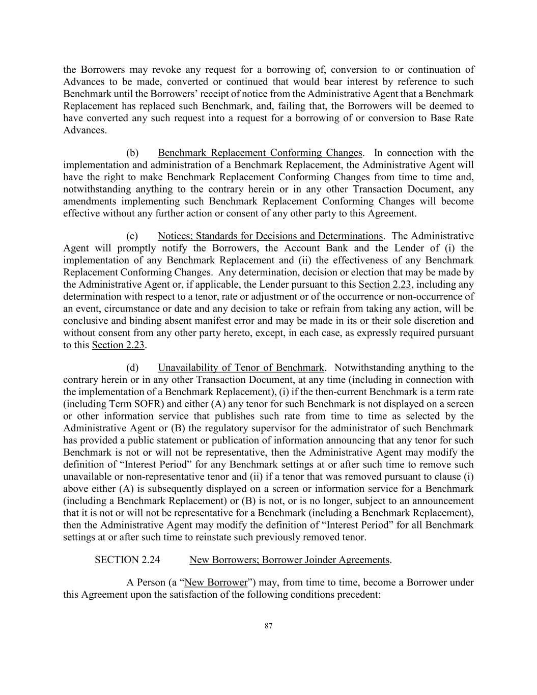 87 the Borrowers may revoke any request for a borrowing of, conversion to or continuation of Advances to be made, converted or continued that would bear interest by reference to such Benchmark until the Borrowers’ receipt of notice from the Administrative Agent that a Benchmark Replacement has replaced such Benchmark, and, failing that, the Borrowers will be deemed to have converted any such request into a request for a borrowing of or conversion to Base Rate Advances. (b) Benchmark Replacement Conforming Changes. In connection with the implementation and administration of a Benchmark Replacement, the Administrative Agent will have the right to make Benchmark Replacement Conforming Changes from time to time and, notwithstanding anything to the contrary herein or in any other Transaction Document, any amendments implementing such Benchmark Replacement Conforming Changes will become effective without any further action or consent of any other party to this Agreement. (c) Notices; Standards for Decisions and Determinations. The Administrative Agent will promptly notify the Borrowers, the Account Bank and the Lender of (i) the implementation of any Benchmark Replacement and (ii) the effectiveness of any Benchmark Replacement Conforming Changes. Any determination, decision or election that may be made by the Administrative Agent or, if applicable, the Lender pursuant to this Section 2.23, including any determination with respect to a tenor, rate or adjustment or of the occurrence or non-occurrence of an event, circumstance or date and any decision to take or refrain from taking any action, will be conclusive and binding absent manifest error and may be made in its or their sole discretion and without consent from any other party hereto, except, in each case, as expressly required pursuant to this Section 2.23. (d) Unavailability of Tenor of Benchmark. Notwithstanding anything to the contrary herein or in any other Transaction Document, at any time (including in connection with the implementation of a Benchmark Replacement), (i) if the then-current Benchmark is a term rate (including Term SOFR) and either (A) any tenor for such Benchmark is not displayed on a screen or other information service that publishes such rate from time to time as selected by the Administrative Agent or (B) the regulatory supervisor for the administrator of such Benchmark has provided a public statement or publication of information announcing that any tenor for such Benchmark is not or will not be representative, then the Administrative Agent may modify the definition of “Interest Period” for any Benchmark settings at or after such time to remove such unavailable or non-representative tenor and (ii) if a tenor that was removed pursuant to clause (i) above either (A) is subsequently displayed on a screen or information service for a Benchmark (including a Benchmark Replacement) or (B) is not, or is no longer, subject to an announcement that it is not or will not be representative for a Benchmark (including a Benchmark Replacement), then the Administrative Agent may modify the definition of “Interest Period” for all Benchmark settings at or after such time to reinstate such previously removed tenor. SECTION 2.24 New Borrowers; Borrower Joinder Agreements. A Person (a “New Borrower”) may, from time to time, become a Borrower under this Agreement upon the satisfaction of the following conditions precedent: