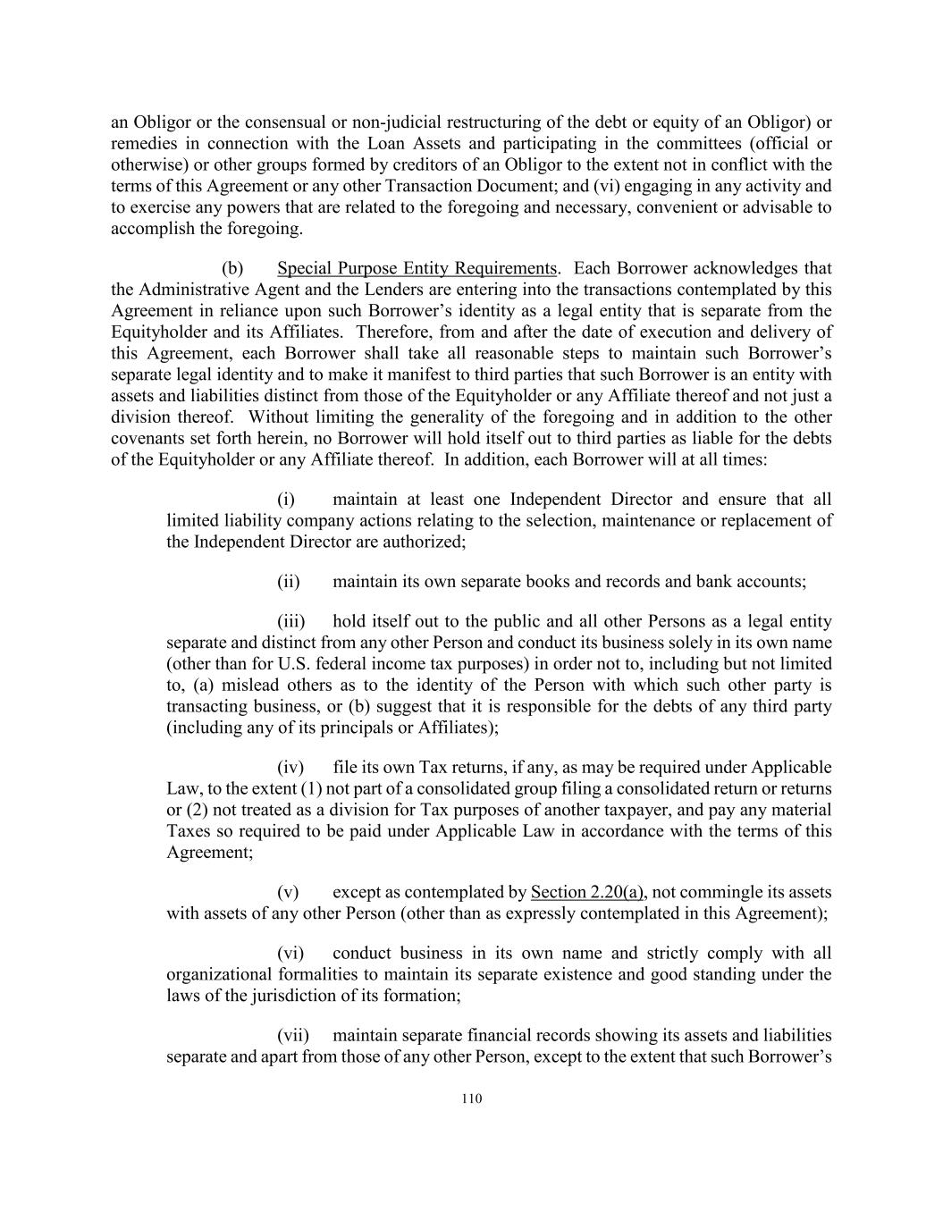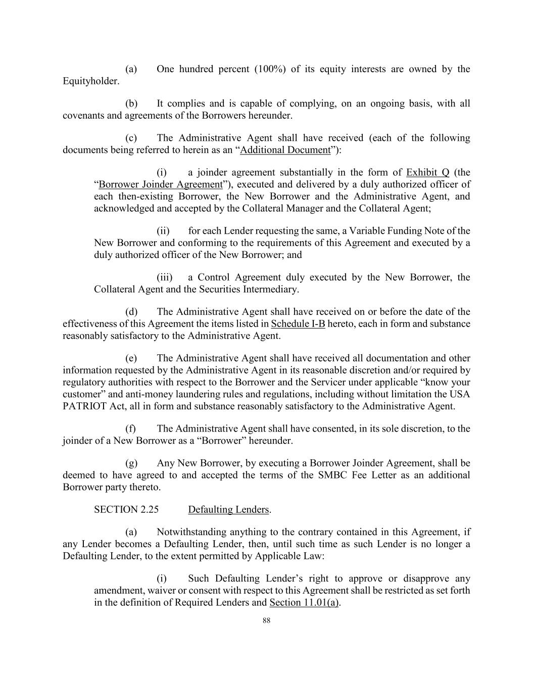 88 (a) One hundred percent (100%) of its equity interests are owned by the Equityholder. (b) It complies and is capable of complying, on an ongoing basis, with all covenants and agreements of the Borrowers hereunder. (c) The Administrative Agent shall have received (each of the following documents being referred to herein as an “Additional Document”): (i) a joinder agreement substantially in the form of Exhibit Q (the “Borrower Joinder Agreement”), executed and delivered by a duly authorized officer of each then-existing Borrower, the New Borrower and the Administrative Agent, and acknowledged and accepted by the Collateral Manager and the Collateral Agent; (ii) for each Lender requesting the same, a Variable Funding Note of the New Borrower and conforming to the requirements of this Agreement and executed by a duly authorized officer of the New Borrower; and (iii) a Control Agreement duly executed by the New Borrower, the Collateral Agent and the Securities Intermediary. (d) The Administrative Agent shall have received on or before the date of the effectiveness of this Agreement the items listed in Schedule I-B hereto, each in form and substance reasonably satisfactory to the Administrative Agent. (e) The Administrative Agent shall have received all documentation and other information requested by the Administrative Agent in its reasonable discretion and/or required by regulatory authorities with respect to the Borrower and the Servicer under applicable “know your customer” and anti-money laundering rules and regulations, including without limitation the USA PATRIOT Act, all in form and substance reasonably satisfactory to the Administrative Agent. (f) The Administrative Agent shall have consented, in its sole discretion, to the joinder of a New Borrower as a “Borrower” hereunder. (g) Any New Borrower, by executing a Borrower Joinder Agreement, shall be deemed to have agreed to and accepted the terms of the SMBC Fee Letter as an additional Borrower party thereto. SECTION 2.25 Defaulting Lenders. (a) Notwithstanding anything to the contrary contained in this Agreement, if any Lender becomes a Defaulting Lender, then, until such time as such Lender is no longer a Defaulting Lender, to the extent permitted by Applicable Law: (i) Such Defaulting Lender’s right to approve or disapprove any amendment, waiver or consent with respect to this Agreement shall be restricted as set forth in the definition of Required Lenders and Section 11.01(a).