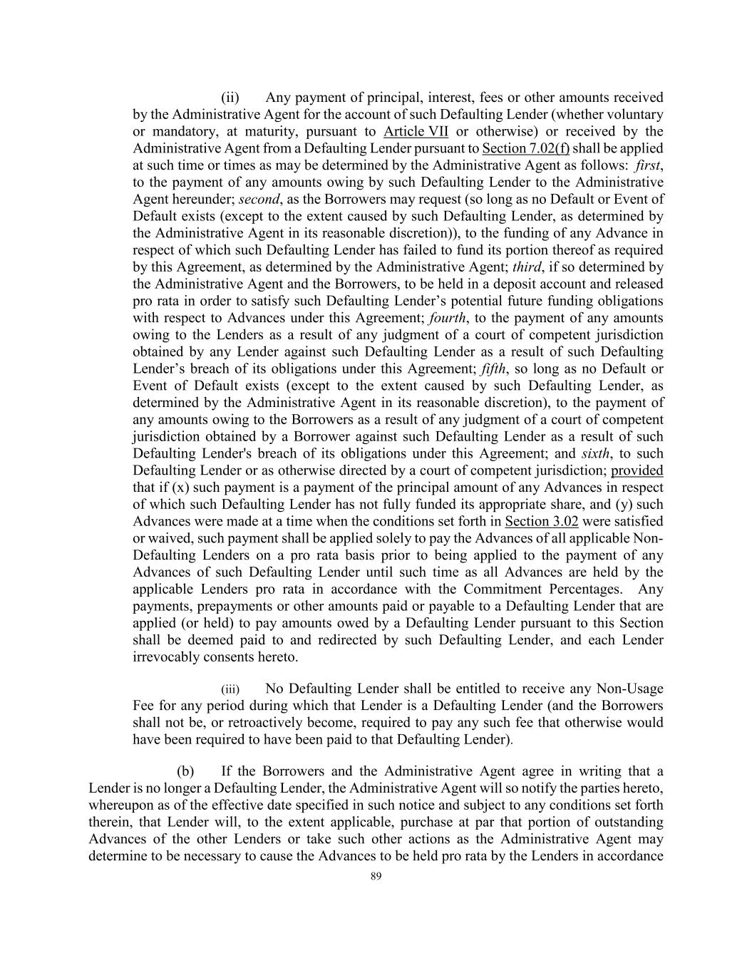 89 (ii) Any payment of principal, interest, fees or other amounts received by the Administrative Agent for the account of such Defaulting Lender (whether voluntary or mandatory, at maturity, pursuant to Article VII or otherwise) or received by the Administrative Agent from a Defaulting Lender pursuant to Section 7.02(f) shall be applied at such time or times as may be determined by the Administrative Agent as follows: first, to the payment of any amounts owing by such Defaulting Lender to the Administrative Agent hereunder; second, as the Borrowers may request (so long as no Default or Event of Default exists (except to the extent caused by such Defaulting Lender, as determined by the Administrative Agent in its reasonable discretion)), to the funding of any Advance in respect of which such Defaulting Lender has failed to fund its portion thereof as required by this Agreement, as determined by the Administrative Agent; third, if so determined by the Administrative Agent and the Borrowers, to be held in a deposit account and released pro rata in order to satisfy such Defaulting Lender’s potential future funding obligations with respect to Advances under this Agreement; fourth, to the payment of any amounts owing to the Lenders as a result of any judgment of a court of competent jurisdiction obtained by any Lender against such Defaulting Lender as a result of such Defaulting Lender’s breach of its obligations under this Agreement; fifth, so long as no Default or Event of Default exists (except to the extent caused by such Defaulting Lender, as determined by the Administrative Agent in its reasonable discretion), to the payment of any amounts owing to the Borrowers as a result of any judgment of a court of competent jurisdiction obtained by a Borrower against such Defaulting Lender as a result of such Defaulting Lender's breach of its obligations under this Agreement; and sixth, to such Defaulting Lender or as otherwise directed by a court of competent jurisdiction; provided that if (x) such payment is a payment of the principal amount of any Advances in respect of which such Defaulting Lender has not fully funded its appropriate share, and (y) such Advances were made at a time when the conditions set forth in Section 3.02 were satisfied or waived, such payment shall be applied solely to pay the Advances of all applicable Non- Defaulting Lenders on a pro rata basis prior to being applied to the payment of any Advances of such Defaulting Lender until such time as all Advances are held by the applicable Lenders pro rata in accordance with the Commitment Percentages. Any payments, prepayments or other amounts paid or payable to a Defaulting Lender that are applied (or held) to pay amounts owed by a Defaulting Lender pursuant to this Section shall be deemed paid to and redirected by such Defaulting Lender, and each Lender irrevocably consents hereto. (iii) No Defaulting Lender shall be entitled to receive any Non-Usage Fee for any period during which that Lender is a Defaulting Lender (and the Borrowers shall not be, or retroactively become, required to pay any such fee that otherwise would have been required to have been paid to that Defaulting Lender). (b) If the Borrowers and the Administrative Agent agree in writing that a Lender is no longer a Defaulting Lender, the Administrative Agent will so notify the parties hereto, whereupon as of the effective date specified in such notice and subject to any conditions set forth therein, that Lender will, to the extent applicable, purchase at par that portion of outstanding Advances of the other Lenders or take such other actions as the Administrative Agent may determine to be necessary to cause the Advances to be held pro rata by the Lenders in accordance
