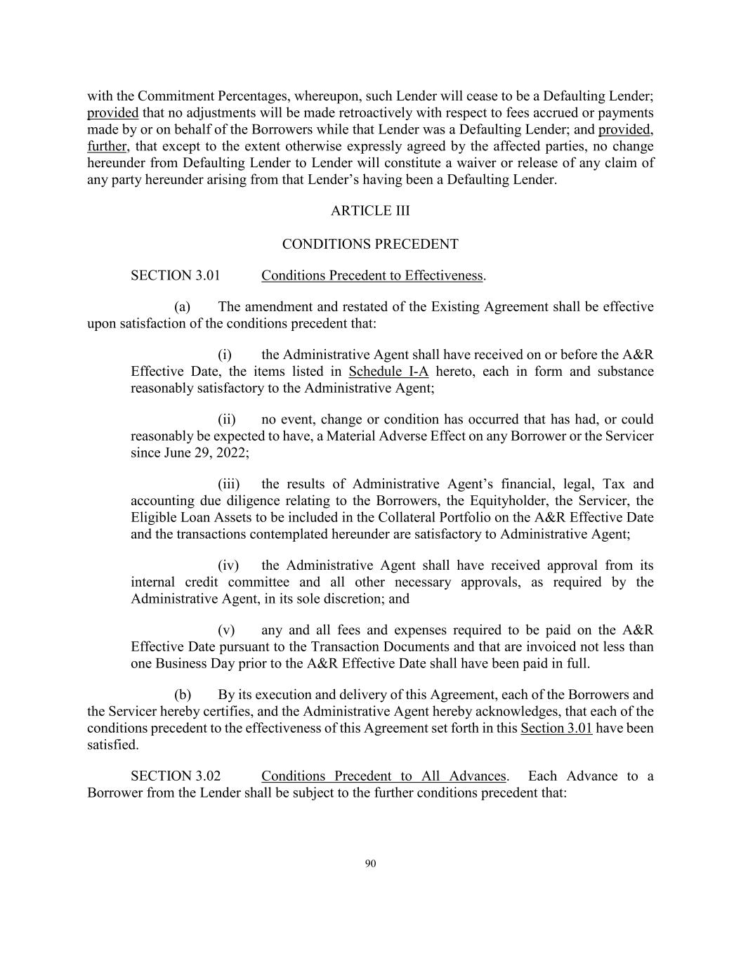 90 with the Commitment Percentages, whereupon, such Lender will cease to be a Defaulting Lender; provided that no adjustments will be made retroactively with respect to fees accrued or payments made by or on behalf of the Borrowers while that Lender was a Defaulting Lender; and provided, further, that except to the extent otherwise expressly agreed by the affected parties, no change hereunder from Defaulting Lender to Lender will constitute a waiver or release of any claim of any party hereunder arising from that Lender’s having been a Defaulting Lender. ARTICLE III CONDITIONS PRECEDENT SECTION 3.01 Conditions Precedent to Effectiveness. (a) The amendment and restated of the Existing Agreement shall be effective upon satisfaction of the conditions precedent that: (i) the Administrative Agent shall have received on or before the A&R Effective Date, the items listed in Schedule I-A hereto, each in form and substance reasonably satisfactory to the Administrative Agent; (ii) no event, change or condition has occurred that has had, or could reasonably be expected to have, a Material Adverse Effect on any Borrower or the Servicer since June 29, 2022; (iii) the results of Administrative Agent’s financial, legal, Tax and accounting due diligence relating to the Borrowers, the Equityholder, the Servicer, the Eligible Loan Assets to be included in the Collateral Portfolio on the A&R Effective Date and the transactions contemplated hereunder are satisfactory to Administrative Agent; (iv) the Administrative Agent shall have received approval from its internal credit committee and all other necessary approvals, as required by the Administrative Agent, in its sole discretion; and (v) any and all fees and expenses required to be paid on the A&R Effective Date pursuant to the Transaction Documents and that are invoiced not less than one Business Day prior to the A&R Effective Date shall have been paid in full. (b) By its execution and delivery of this Agreement, each of the Borrowers and the Servicer hereby certifies, and the Administrative Agent hereby acknowledges, that each of the conditions precedent to the effectiveness of this Agreement set forth in this Section 3.01 have been satisfied. SECTION 3.02 Conditions Precedent to All Advances. Each Advance to a Borrower from the Lender shall be subject to the further conditions precedent that:
