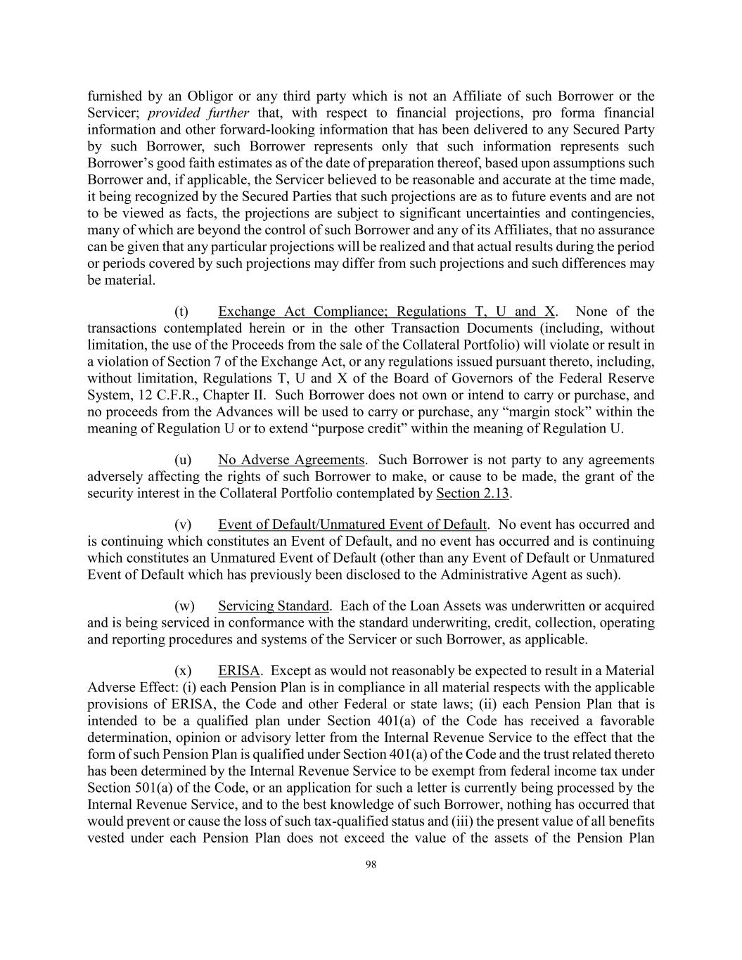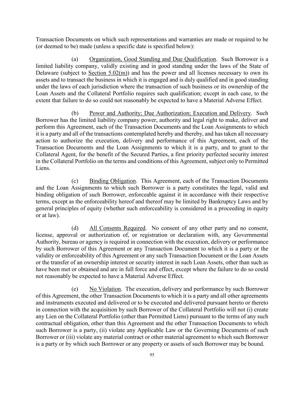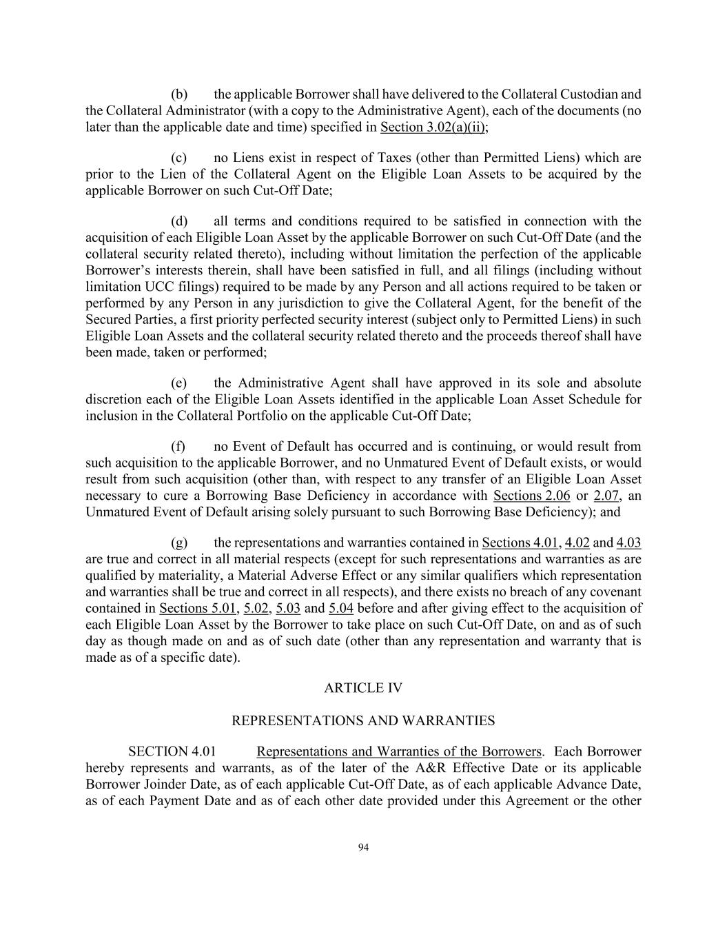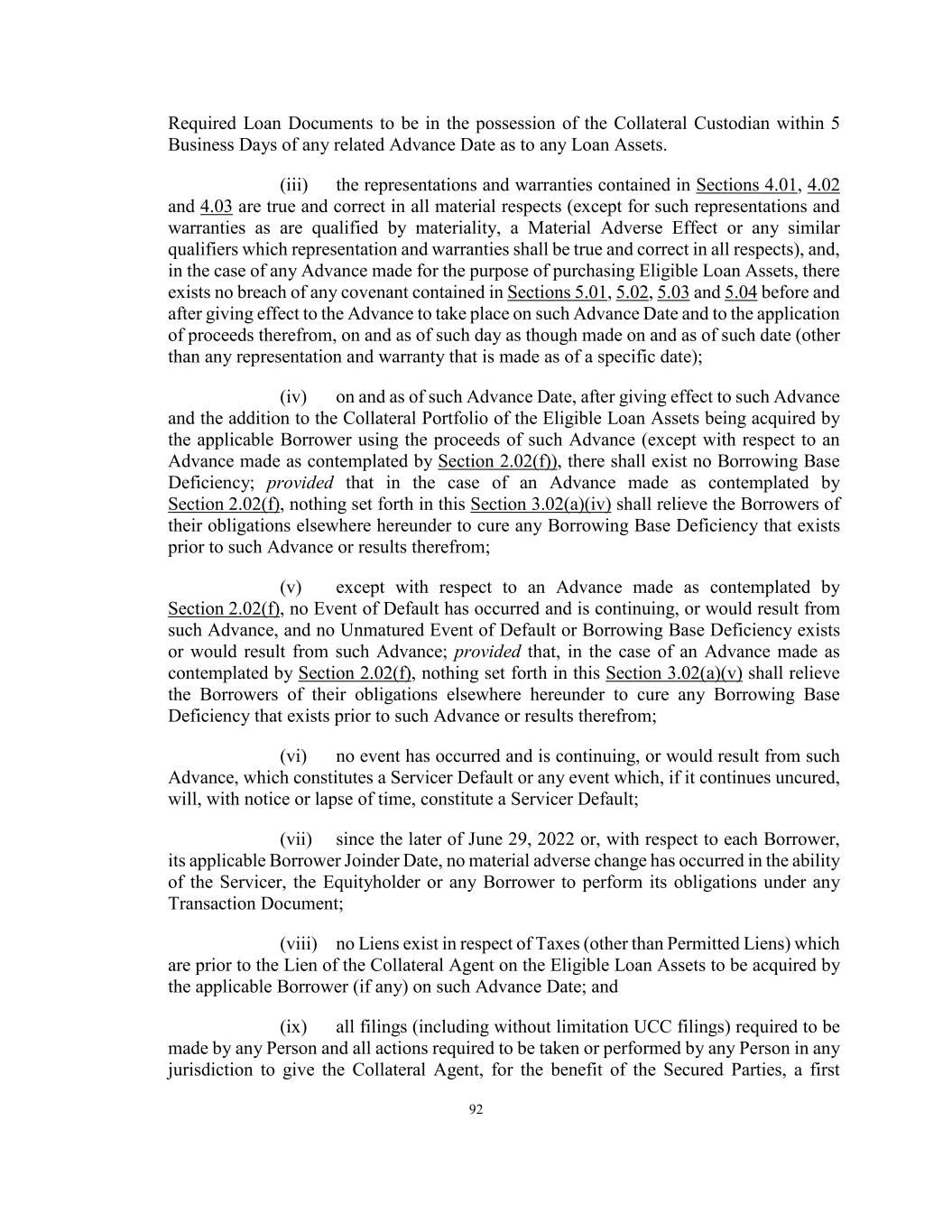 92 Required Loan Documents to be in the possession of the Collateral Custodian within 5 Business Days of any related Advance Date as to any Loan Assets. (iii) the representations and warranties contained in Sections 4.01, 4.02 and 4.03 are true and correct in all material respects (except for such representations and warranties as are qualified by materiality, a Material Adverse Effect or any similar qualifiers which representation and warranties shall be true and correct in all respects), and, in the case of any Advance made for the purpose of purchasing Eligible Loan Assets, there exists no breach of any covenant contained in Sections 5.01, 5.02, 5.03 and 5.04 before and after giving effect to the Advance to take place on such Advance Date and to the application of proceeds therefrom, on and as of such day as though made on and as of such date (other than any representation and warranty that is made as of a specific date); (iv) on and as of such Advance Date, after giving effect to such Advance and the addition to the Collateral Portfolio of the Eligible Loan Assets being acquired by the applicable Borrower using the proceeds of such Advance (except with respect to an Advance made as contemplated by Section 2.02(f)), there shall exist no Borrowing Base Deficiency; provided that in the case of an Advance made as contemplated by Section 2.02(f), nothing set forth in this Section 3.02(a)(iv) shall relieve the Borrowers of their obligations elsewhere hereunder to cure any Borrowing Base Deficiency that exists prior to such Advance or results therefrom; (v) except with respect to an Advance made as contemplated by Section 2.02(f), no Event of Default has occurred and is continuing, or would result from such Advance, and no Unmatured Event of Default or Borrowing Base Deficiency exists or would result from such Advance; provided that, in the case of an Advance made as contemplated by Section 2.02(f), nothing set forth in this Section 3.02(a)(v) shall relieve the Borrowers of their obligations elsewhere hereunder to cure any Borrowing Base Deficiency that exists prior to such Advance or results therefrom; (vi) no event has occurred and is continuing, or would result from such Advance, which constitutes a Servicer Default or any event which, if it continues uncured, will, with notice or lapse of time, constitute a Servicer Default; (vii) since the later of June 29, 2022 or, with respect to each Borrower, its applicable Borrower Joinder Date, no material adverse change has occurred in the ability of the Servicer, the Equityholder or any Borrower to perform its obligations under any Transaction Document; (viii) no Liens exist in respect of Taxes (other than Permitted Liens) which are prior to the Lien of the Collateral Agent on the Eligible Loan Assets to be acquired by the applicable Borrower (if any) on such Advance Date; and (ix) all filings (including without limitation UCC filings) required to be made by any Person and all actions required to be taken or performed by any Person in any jurisdiction to give the Collateral Agent, for the benefit of the Secured Parties, a first