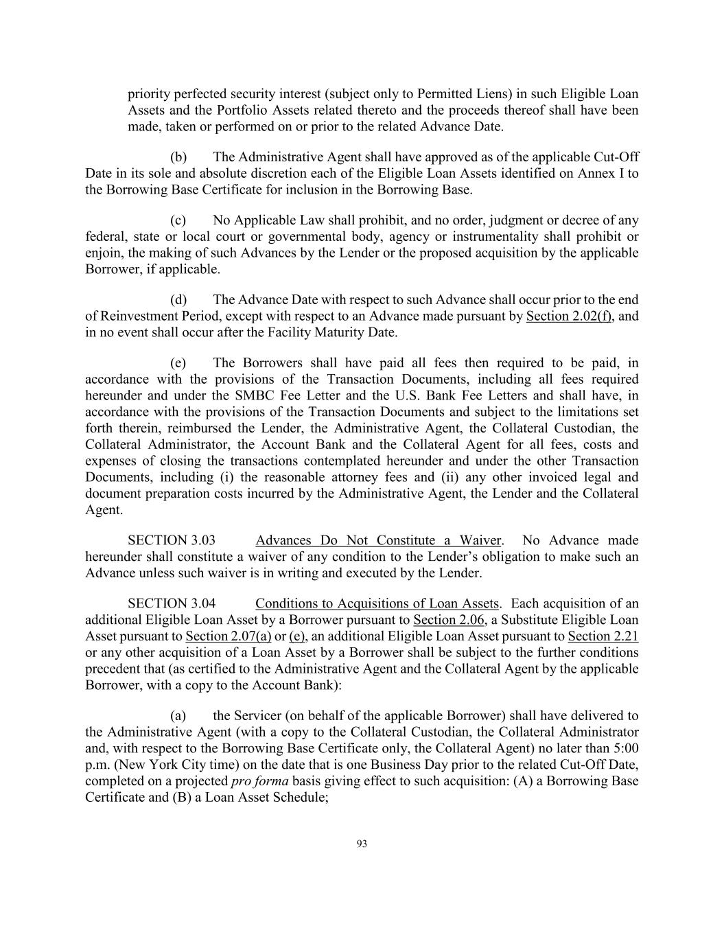 93 priority perfected security interest (subject only to Permitted Liens) in such Eligible Loan Assets and the Portfolio Assets related thereto and the proceeds thereof shall have been made, taken or performed on or prior to the related Advance Date. (b) The Administrative Agent shall have approved as of the applicable Cut-Off Date in its sole and absolute discretion each of the Eligible Loan Assets identified on Annex I to the Borrowing Base Certificate for inclusion in the Borrowing Base. (c) No Applicable Law shall prohibit, and no order, judgment or decree of any federal, state or local court or governmental body, agency or instrumentality shall prohibit or enjoin, the making of such Advances by the Lender or the proposed acquisition by the applicable Borrower, if applicable. (d) The Advance Date with respect to such Advance shall occur prior to the end of Reinvestment Period, except with respect to an Advance made pursuant by Section 2.02(f), and in no event shall occur after the Facility Maturity Date. (e) The Borrowers shall have paid all fees then required to be paid, in accordance with the provisions of the Transaction Documents, including all fees required hereunder and under the SMBC Fee Letter and the U.S. Bank Fee Letters and shall have, in accordance with the provisions of the Transaction Documents and subject to the limitations set forth therein, reimbursed the Lender, the Administrative Agent, the Collateral Custodian, the Collateral Administrator, the Account Bank and the Collateral Agent for all fees, costs and expenses of closing the transactions contemplated hereunder and under the other Transaction Documents, including (i) the reasonable attorney fees and (ii) any other invoiced legal and document preparation costs incurred by the Administrative Agent, the Lender and the Collateral Agent. SECTION 3.03 Advances Do Not Constitute a Waiver. No Advance made hereunder shall constitute a waiver of any condition to the Lender’s obligation to make such an Advance unless such waiver is in writing and executed by the Lender. SECTION 3.04 Conditions to Acquisitions of Loan Assets. Each acquisition of an additional Eligible Loan Asset by a Borrower pursuant to Section 2.06, a Substitute Eligible Loan Asset pursuant to Section 2.07(a) or (e), an additional Eligible Loan Asset pursuant to Section 2.21 or any other acquisition of a Loan Asset by a Borrower shall be subject to the further conditions precedent that (as certified to the Administrative Agent and the Collateral Agent by the applicable Borrower, with a copy to the Account Bank): (a) the Servicer (on behalf of the applicable Borrower) shall have delivered to the Administrative Agent (with a copy to the Collateral Custodian, the Collateral Administrator and, with respect to the Borrowing Base Certificate only, the Collateral Agent) no later than 5:00 p.m. (New York City time) on the date that is one Business Day prior to the related Cut-Off Date, completed on a projected pro forma basis giving effect to such acquisition: (A) a Borrowing Base Certificate and (B) a Loan Asset Schedule;