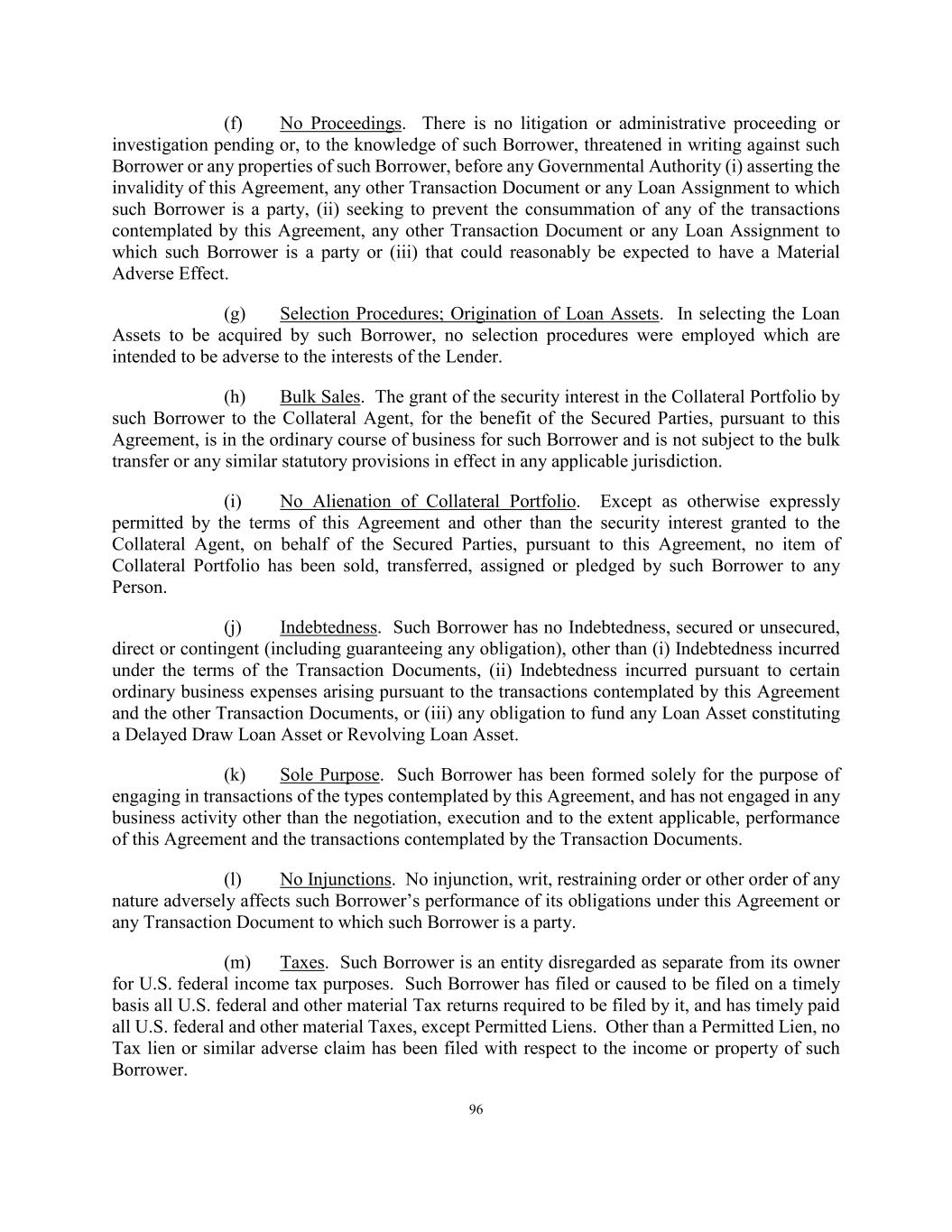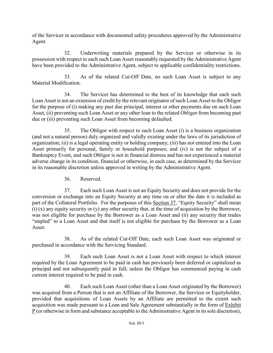 Sch. III-5 of the Servicer in accordance with documented safety procedures approved by the Administrative Agent. 32. Underwriting materials prepared by the Servicer or otherwise in its possession with respect to each such Loan Asset reasonably requested by the Administrative Agent have been provided to the Administrative Agent, subject to applicable confidentiality restrictions. 33. As of the related Cut-Off Date, no such Loan Asset is subject to any Material Modification. 34. The Servicer has determined to the best of its knowledge that each such Loan Asset is not an extension of credit by the relevant originator of such Loan Asset to the Obligor for the purpose of (i) making any past due principal, interest or other payments due on such Loan Asset, (ii) preventing such Loan Asset or any other loan to the related Obligor from becoming past due or (iii) preventing such Loan Asset from becoming defaulted. 35. The Obligor with respect to such Loan Asset (i) is a business organization (and not a natural person) duly organized and validly existing under the laws of its jurisdiction of organization; (ii) is a legal operating entity or holding company; (iii) has not entered into the Loan Asset primarily for personal, family or household purposes; and (iv) is not the subject of a Bankruptcy Event, and such Obligor is not in financial distress and has not experienced a material adverse change in its condition, financial or otherwise, in each case, as determined by the Servicer in its reasonable discretion unless approved in writing by the Administrative Agent. 36. Reserved. 37. Each such Loan Asset is not an Equity Security and does not provide for the conversion or exchange into an Equity Security at any time on or after the date it is included as part of the Collateral Portfolio. For the purposes of this Section 37, “Equity Security” shall mean (i) (x) any equity security or (y) any other security that, at the time of acquisition by the Borrower, was not eligible for purchase by the Borrower as a Loan Asset and (ii) any security that trades “stapled” to a Loan Asset and that itself is not eligible for purchase by the Borrower as a Loan Asset. 38. As of the related Cut-Off Date, each such Loan Asset was originated or purchased in accordance with the Servicing Standard. 39. Each such Loan Asset is not a Loan Asset with respect to which interest required by the Loan Agreement to be paid in cash has previously been deferred or capitalized as principal and not subsequently paid in full; unless the Obligor has commenced paying in cash current interest required to be paid in cash. 40. Each such Loan Asset (other than a Loan Asset originated by the Borrower) was acquired from a Person that is not an Affiliate of the Borrower, the Servicer or Equityholder, provided that acquisitions of Loan Assets by an Affiliate are permitted to the extent such acquisition was made pursuant to a Loan and Sale Agreement substantially in the form of Exhibit P (or otherwise in form and substance acceptable to the Administrative Agent in its sole discretion),