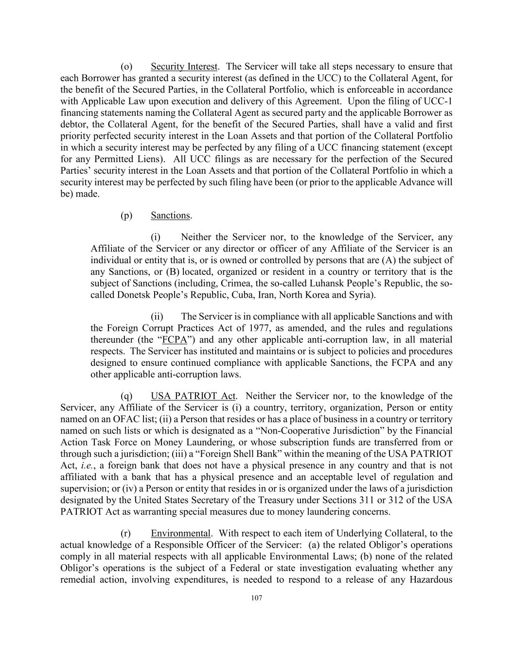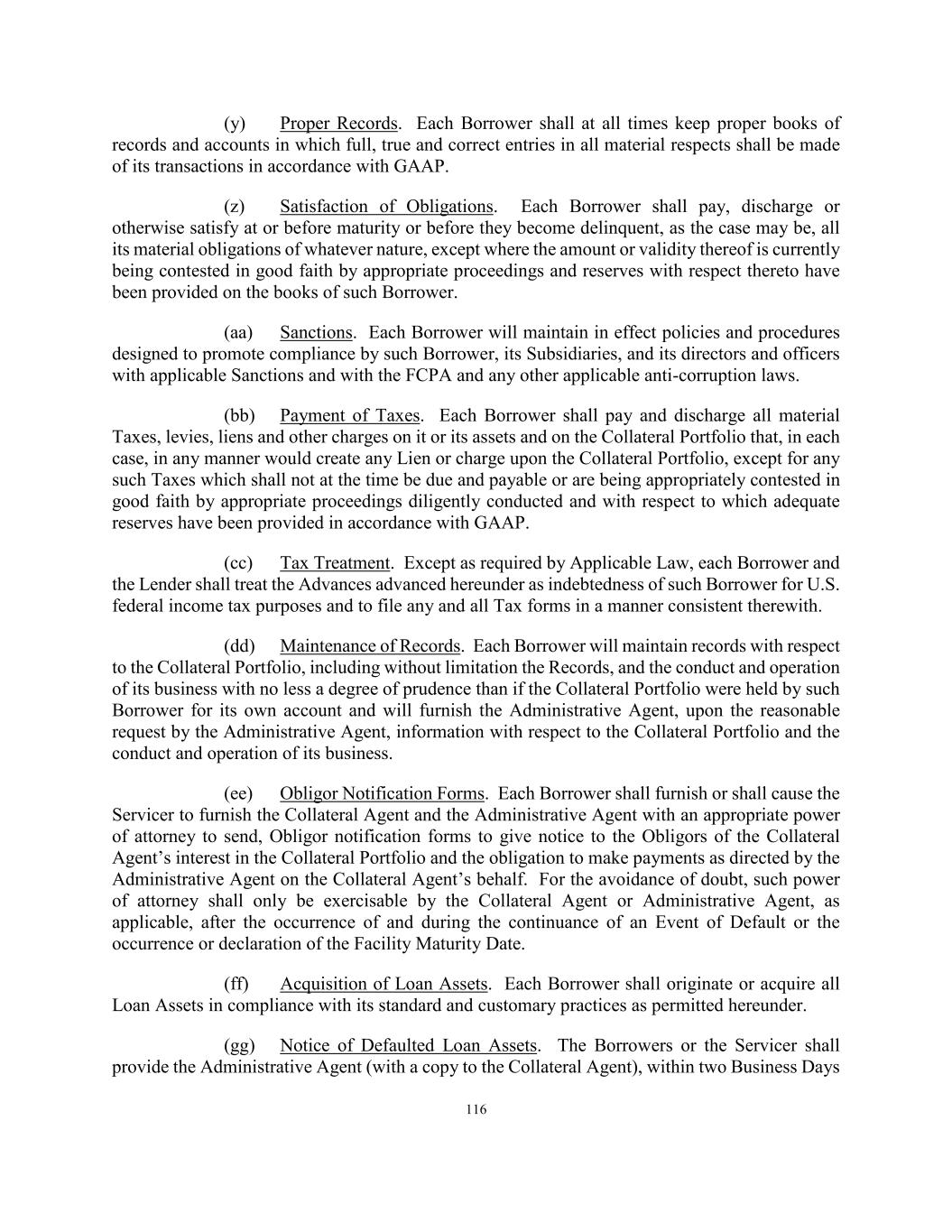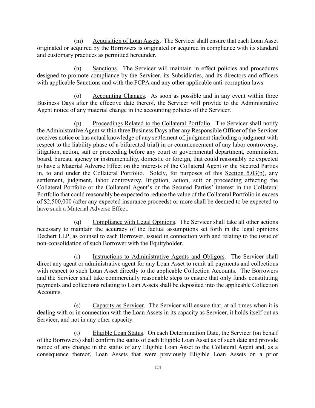 124 (m) Acquisition of Loan Assets. The Servicer shall ensure that each Loan Asset originated or acquired by the Borrowers is originated or acquired in compliance with its standard and customary practices as permitted hereunder. (n) Sanctions. The Servicer will maintain in effect policies and procedures designed to promote compliance by the Servicer, its Subsidiaries, and its directors and officers with applicable Sanctions and with the FCPA and any other applicable anti-corruption laws. (o) Accounting Changes. As soon as possible and in any event within three Business Days after the effective date thereof, the Servicer will provide to the Administrative Agent notice of any material change in the accounting policies of the Servicer. (p) Proceedings Related to the Collateral Portfolio. The Servicer shall notify the Administrative Agent within three Business Days after any Responsible Officer of the Servicer receives notice or has actual knowledge of any settlement of, judgment (including a judgment with respect to the liability phase of a bifurcated trial) in or commencement of any labor controversy, litigation, action, suit or proceeding before any court or governmental department, commission, board, bureau, agency or instrumentality, domestic or foreign, that could reasonably be expected to have a Material Adverse Effect on the interests of the Collateral Agent or the Secured Parties in, to and under the Collateral Portfolio. Solely, for purposes of this Section 5.03(p), any settlement, judgment, labor controversy, litigation, action, suit or proceeding affecting the Collateral Portfolio or the Collateral Agent’s or the Secured Parties’ interest in the Collateral Portfolio that could reasonably be expected to reduce the value of the Collateral Portfolio in excess of $2,500,000 (after any expected insurance proceeds) or more shall be deemed to be expected to have such a Material Adverse Effect. (q) Compliance with Legal Opinions. The Servicer shall take all other actions necessary to maintain the accuracy of the factual assumptions set forth in the legal opinions Dechert LLP, as counsel to each Borrower, issued in connection with and relating to the issue of non-consolidation of such Borrower with the Equityholder. (r) Instructions to Administrative Agents and Obligors. The Servicer shall direct any agent or administrative agent for any Loan Asset to remit all payments and collections with respect to such Loan Asset directly to the applicable Collection Accounts. The Borrowers and the Servicer shall take commercially reasonable steps to ensure that only funds constituting payments and collections relating to Loan Assets shall be deposited into the applicable Collection Accounts. (s) Capacity as Servicer. The Servicer will ensure that, at all times when it is dealing with or in connection with the Loan Assets in its capacity as Servicer, it holds itself out as Servicer, and not in any other capacity. (t) Eligible Loan Status. On each Determination Date, the Servicer (on behalf of the Borrowers) shall confirm the status of each Eligible Loan Asset as of such date and provide notice of any change in the status of any Eligible Loan Asset to the Collateral Agent and, as a consequence thereof, Loan Assets that were previously Eligible Loan Assets on a prior