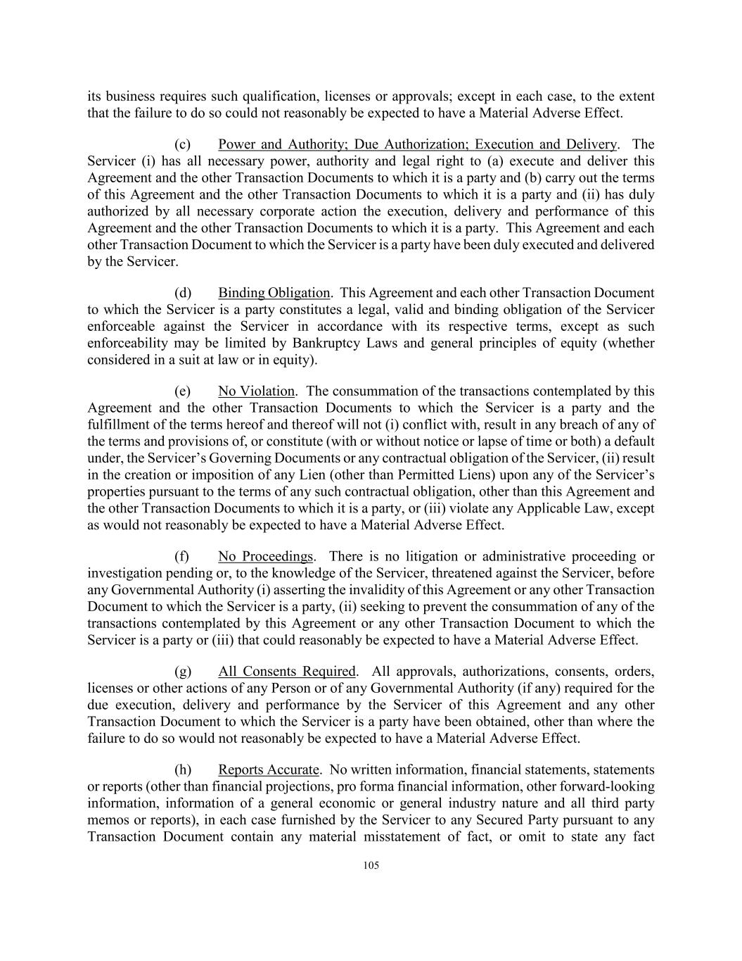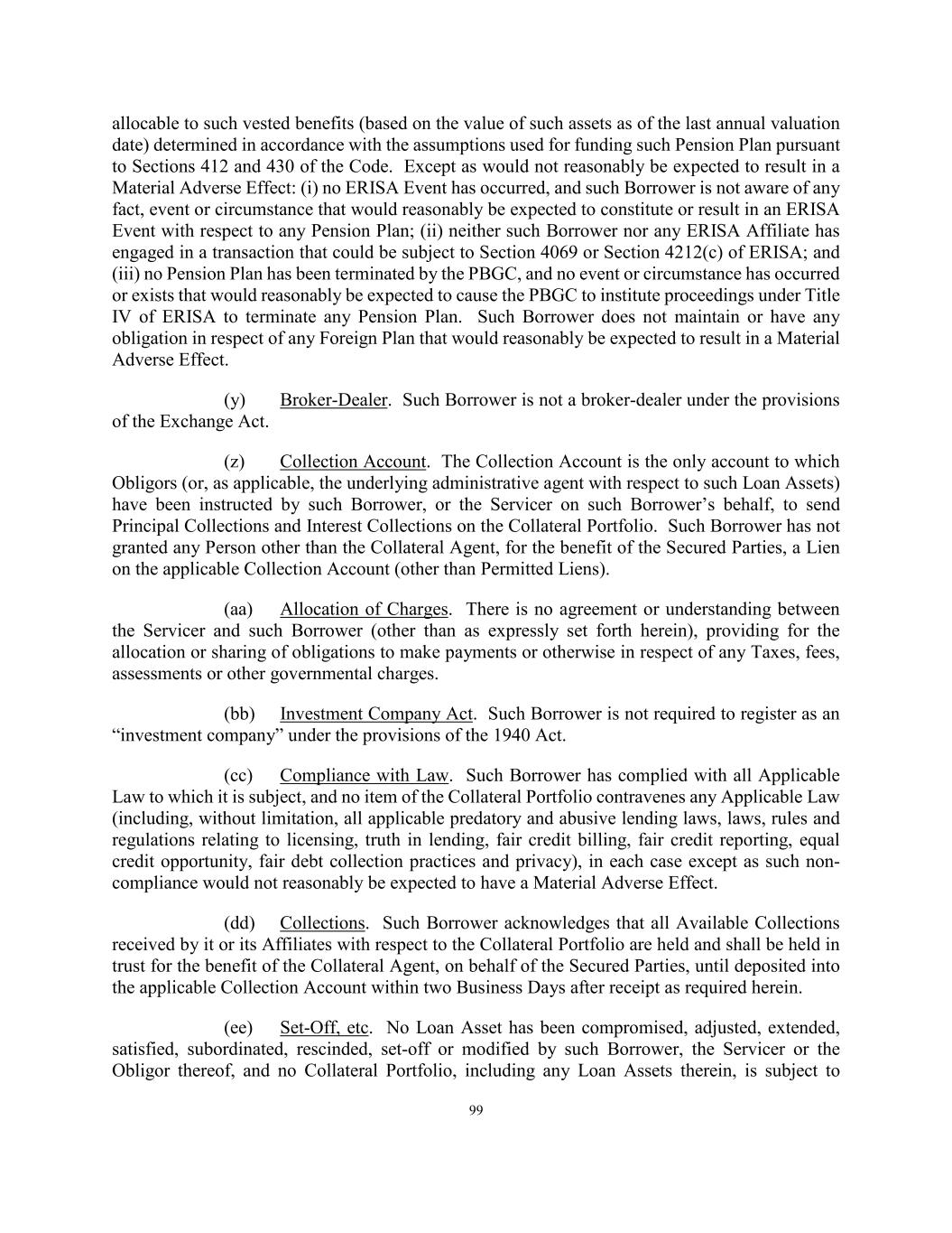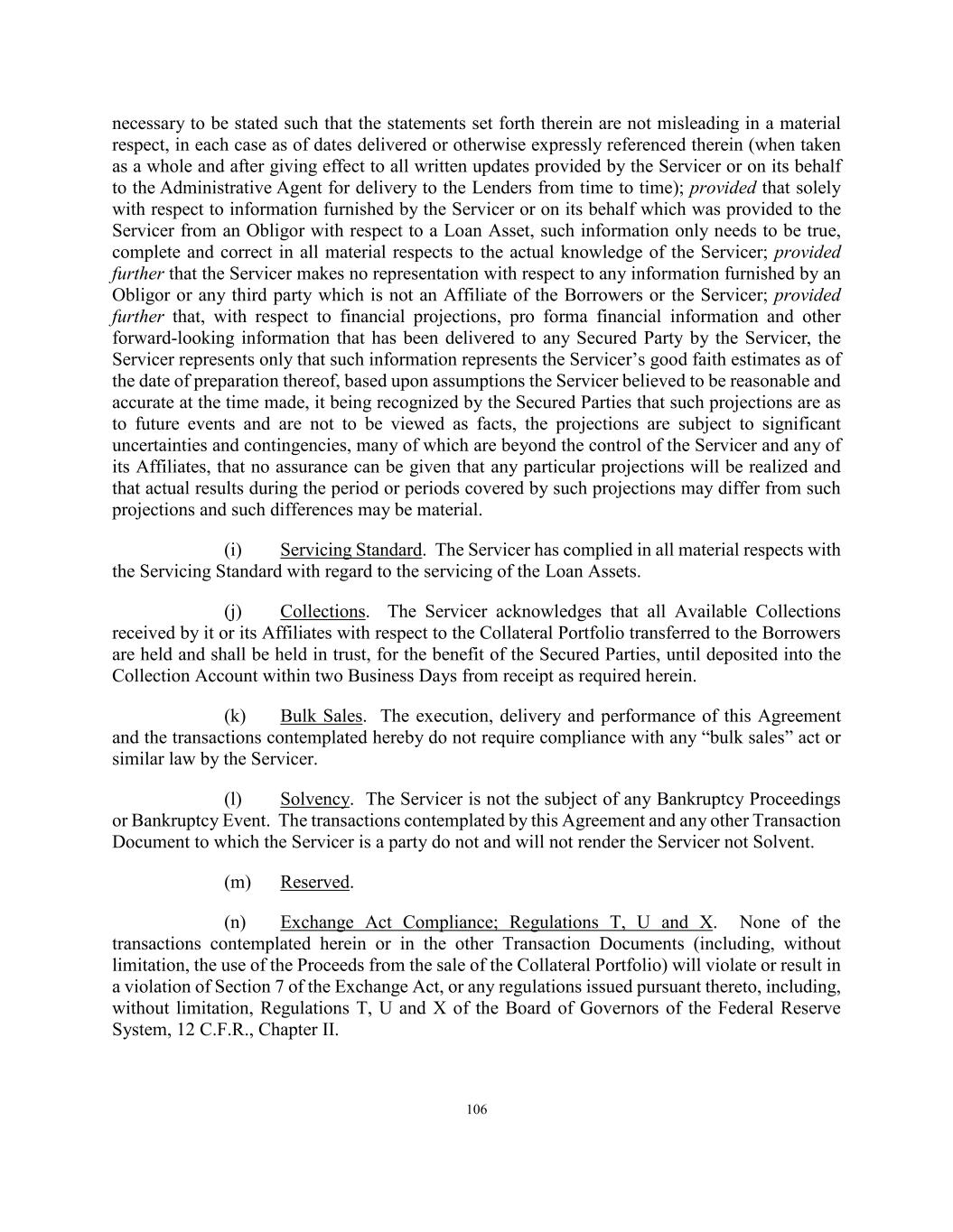 124 (m) Acquisition of Loan Assets. The Servicer shall ensure that each Loan Asset originated or acquired by the Borrowers is originated or acquired in compliance with its standard and customary practices as permitted hereunder. (n) Sanctions. The Servicer will maintain in effect policies and procedures designed to promote compliance by the Servicer, its Subsidiaries, and its directors and officers with applicable Sanctions and with the FCPA and any other applicable anti-corruption laws. (o) Accounting Changes. As soon as possible and in any event within three Business Days after the effective date thereof, the Servicer will provide to the Administrative Agent notice of any material change in the accounting policies of the Servicer. (p) Proceedings Related to the Collateral Portfolio. The Servicer shall notify the Administrative Agent within three Business Days after any Responsible Officer of the Servicer receives notice or has actual knowledge of any settlement of, judgment (including a judgment with respect to the liability phase of a bifurcated trial) in or commencement of any labor controversy, litigation, action, suit or proceeding before any court or governmental department, commission, board, bureau, agency or instrumentality, domestic or foreign, that could reasonably be expected to have a Material Adverse Effect on the interests of the Collateral Agent or the Secured Parties in, to and under the Collateral Portfolio. Solely, for purposes of this Section 5.03(p), any settlement, judgment, labor controversy, litigation, action, suit or proceeding affecting the Collateral Portfolio or the Collateral Agent’s or the Secured Parties’ interest in the Collateral Portfolio that could reasonably be expected to reduce the value of the Collateral Portfolio in excess of $2,500,000 (after any expected insurance proceeds) or more shall be deemed to be expected to have such a Material Adverse Effect. (q) Compliance with Legal Opinions. The Servicer shall take all other actions necessary to maintain the accuracy of the factual assumptions set forth in the legal opinions Dechert LLP, as counsel to each Borrower, issued in connection with and relating to the issue of non-consolidation of such Borrower with the Equityholder. (r) Instructions to Administrative Agents and Obligors. The Servicer shall direct any agent or administrative agent for any Loan Asset to remit all payments and collections with respect to such Loan Asset directly to the applicable Collection Accounts. The Borrowers and the Servicer shall take commercially reasonable steps to ensure that only funds constituting payments and collections relating to Loan Assets shall be deposited into the applicable Collection Accounts. (s) Capacity as Servicer. The Servicer will ensure that, at all times when it is dealing with or in connection with the Loan Assets in its capacity as Servicer, it holds itself out as Servicer, and not in any other capacity. (t) Eligible Loan Status. On each Determination Date, the Servicer (on behalf of the Borrowers) shall confirm the status of each Eligible Loan Asset as of such date and provide notice of any change in the status of any Eligible Loan Asset to the Collateral Agent and, as a consequence thereof, Loan Assets that were previously Eligible Loan Assets on a prior