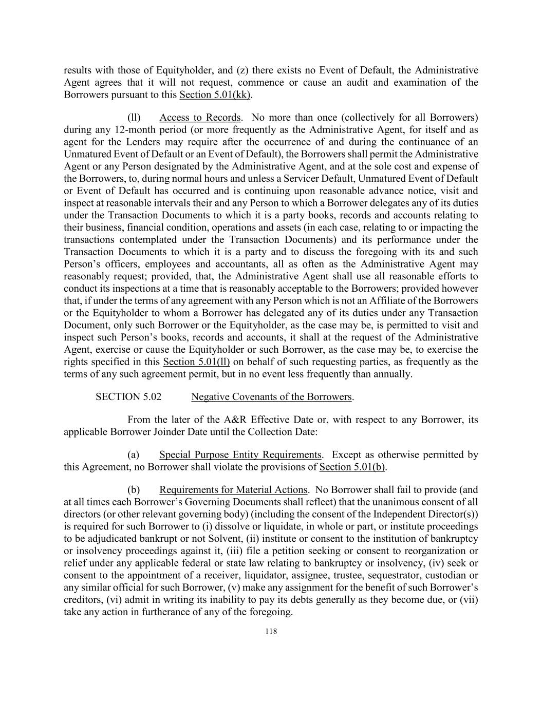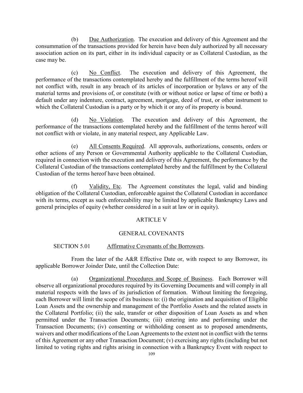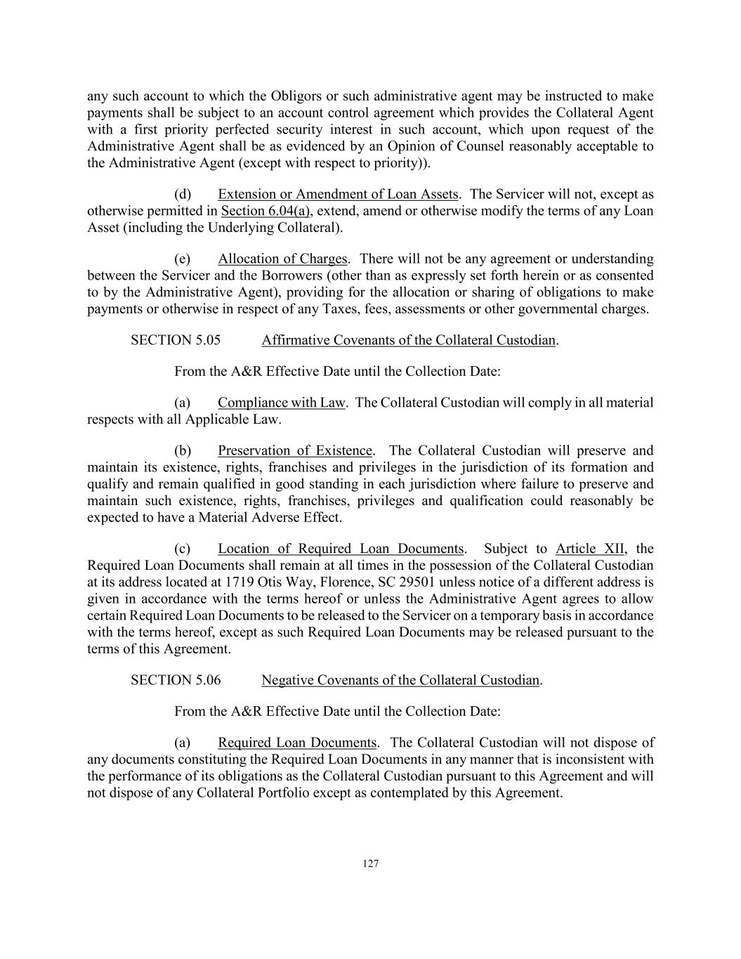 127 any such account to which the Obligors or such administrative agent may be instructed to make payments shall be subject to an account control agreement which provides the Collateral Agent with a first priority perfected security interest in such account, which upon request of the Administrative Agent shall be as evidenced by an Opinion of Counsel reasonably acceptable to the Administrative Agent (except with respect to priority)). (d) Extension or Amendment of Loan Assets. The Servicer will not, except as otherwise permitted in Section 6.04(a), extend, amend or otherwise modify the terms of any Loan Asset (including the Underlying Collateral). (e) Allocation of Charges. There will not be any agreement or understanding between the Servicer and the Borrowers (other than as expressly set forth herein or as consented to by the Administrative Agent), providing for the allocation or sharing of obligations to make payments or otherwise in respect of any Taxes, fees, assessments or other governmental charges. SECTION 5.05 Affirmative Covenants of the Collateral Custodian. From the A&R Effective Date until the Collection Date: (a) Compliance with Law. The Collateral Custodian will comply in all material respects with all Applicable Law. (b) Preservation of Existence. The Collateral Custodian will preserve and maintain its existence, rights, franchises and privileges in the jurisdiction of its formation and qualify and remain qualified in good standing in each jurisdiction where failure to preserve and maintain such existence, rights, franchises, privileges and qualification could reasonably be expected to have a Material Adverse Effect. (c) Location of Required Loan Documents. Subject to Article XII, the Required Loan Documents shall remain at all times in the possession of the Collateral Custodian at its address located at 1719 Otis Way, Florence, SC 29501 unless notice of a different address is given in accordance with the terms hereof or unless the Administrative Agent agrees to allow certain Required Loan Documents to be released to the Servicer on a temporary basis in accordance with the terms hereof, except as such Required Loan Documents may be released pursuant to the terms of this Agreement. SECTION 5.06 Negative Covenants of the Collateral Custodian. From the A&R Effective Date until the Collection Date: (a) Required Loan Documents. The Collateral Custodian will not dispose of any documents constituting the Required Loan Documents in any manner that is inconsistent with the performance of its obligations as the Collateral Custodian pursuant to this Agreement and will not dispose of any Collateral Portfolio except as contemplated by this Agreement.