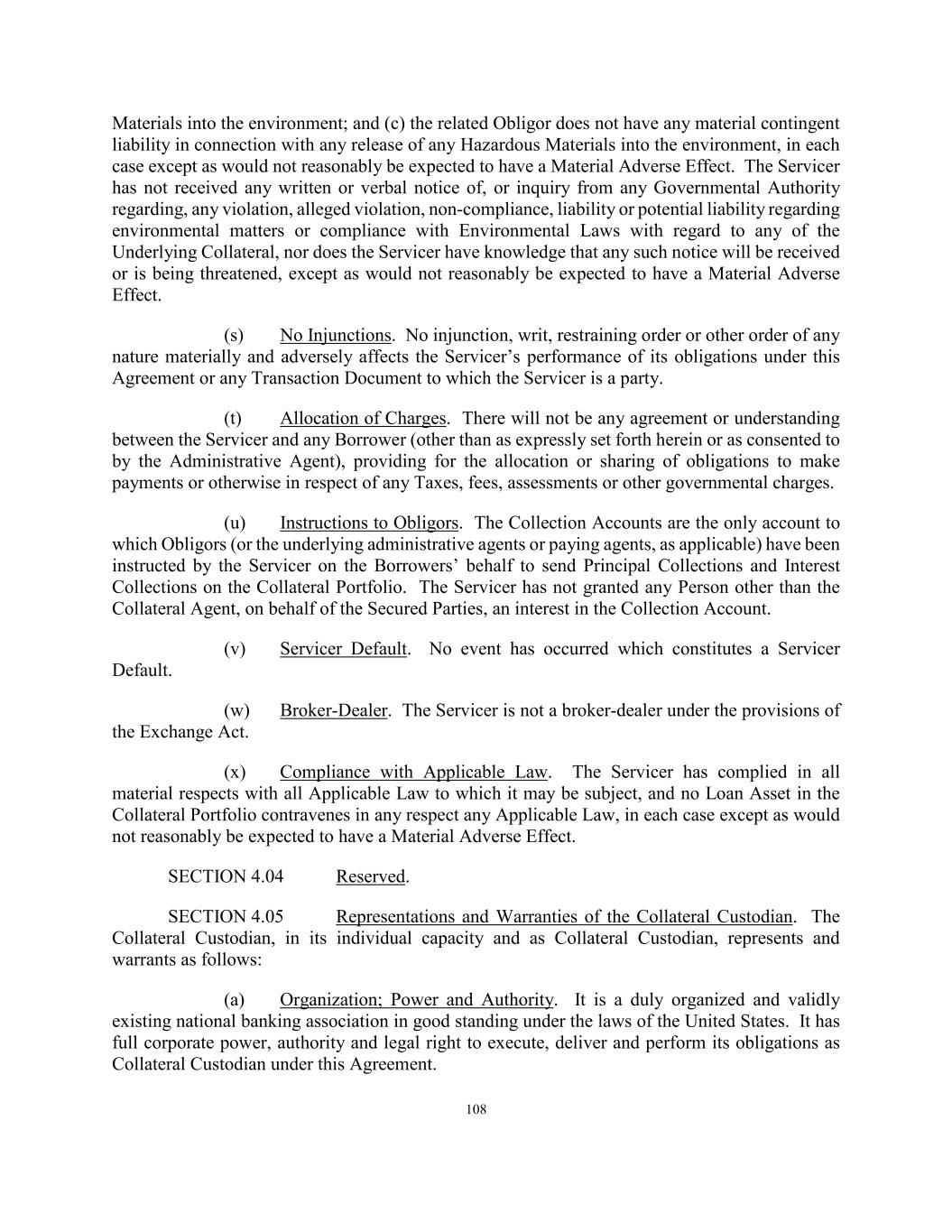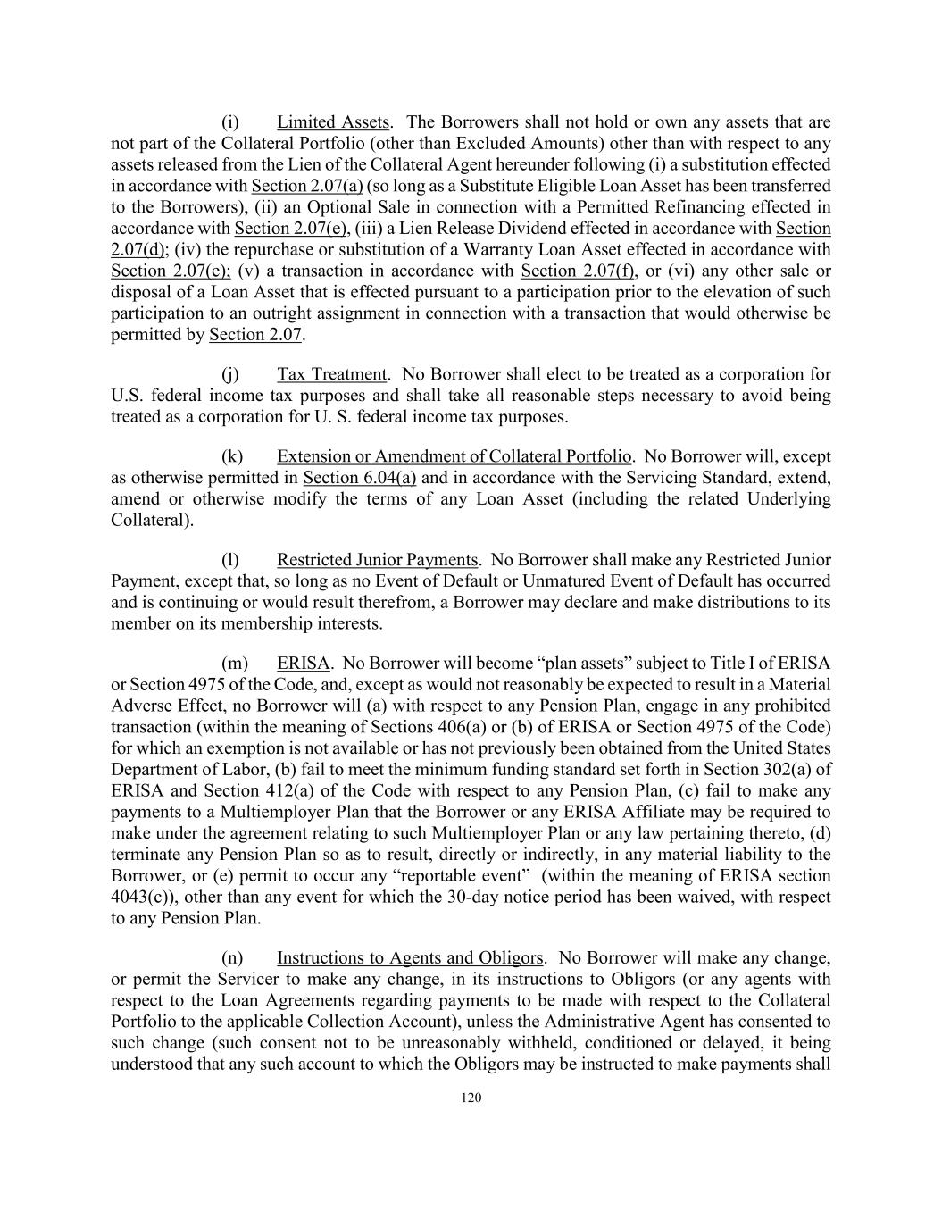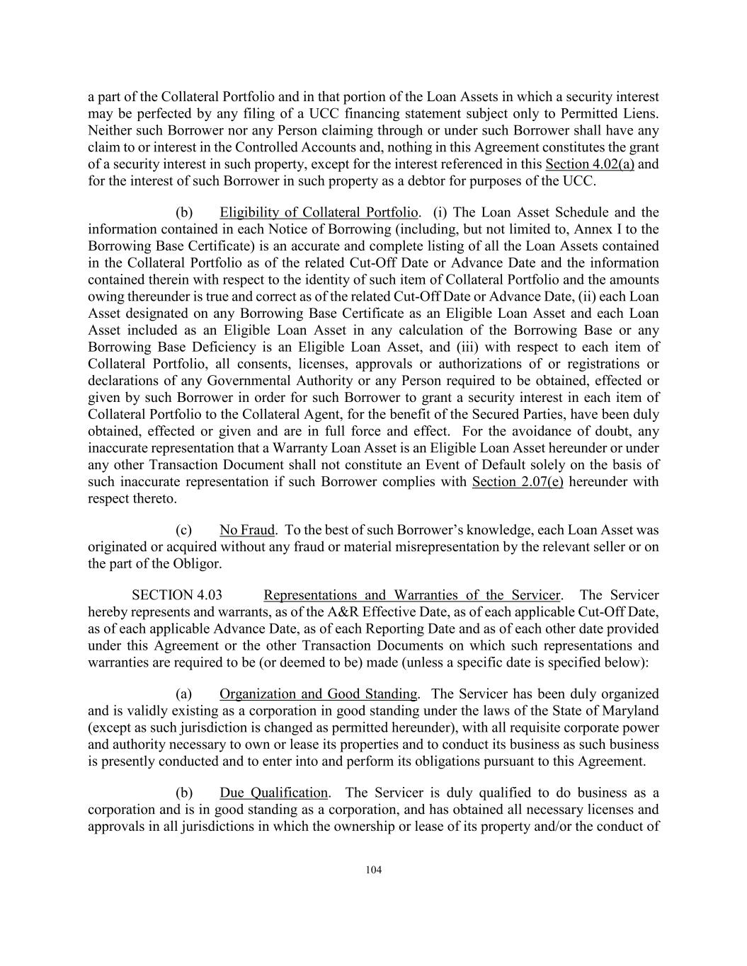 127 any such account to which the Obligors or such administrative agent may be instructed to make payments shall be subject to an account control agreement which provides the Collateral Agent with a first priority perfected security interest in such account, which upon request of the Administrative Agent shall be as evidenced by an Opinion of Counsel reasonably acceptable to the Administrative Agent (except with respect to priority)). (d) Extension or Amendment of Loan Assets. The Servicer will not, except as otherwise permitted in Section 6.04(a), extend, amend or otherwise modify the terms of any Loan Asset (including the Underlying Collateral). (e) Allocation of Charges. There will not be any agreement or understanding between the Servicer and the Borrowers (other than as expressly set forth herein or as consented to by the Administrative Agent), providing for the allocation or sharing of obligations to make payments or otherwise in respect of any Taxes, fees, assessments or other governmental charges. SECTION 5.05 Affirmative Covenants of the Collateral Custodian. From the A&R Effective Date until the Collection Date: (a) Compliance with Law. The Collateral Custodian will comply in all material respects with all Applicable Law. (b) Preservation of Existence. The Collateral Custodian will preserve and maintain its existence, rights, franchises and privileges in the jurisdiction of its formation and qualify and remain qualified in good standing in each jurisdiction where failure to preserve and maintain such existence, rights, franchises, privileges and qualification could reasonably be expected to have a Material Adverse Effect. (c) Location of Required Loan Documents. Subject to Article XII, the Required Loan Documents shall remain at all times in the possession of the Collateral Custodian at its address located at 1719 Otis Way, Florence, SC 29501 unless notice of a different address is given in accordance with the terms hereof or unless the Administrative Agent agrees to allow certain Required Loan Documents to be released to the Servicer on a temporary basis in accordance with the terms hereof, except as such Required Loan Documents may be released pursuant to the terms of this Agreement. SECTION 5.06 Negative Covenants of the Collateral Custodian. From the A&R Effective Date until the Collection Date: (a) Required Loan Documents. The Collateral Custodian will not dispose of any documents constituting the Required Loan Documents in any manner that is inconsistent with the performance of its obligations as the Collateral Custodian pursuant to this Agreement and will not dispose of any Collateral Portfolio except as contemplated by this Agreement.