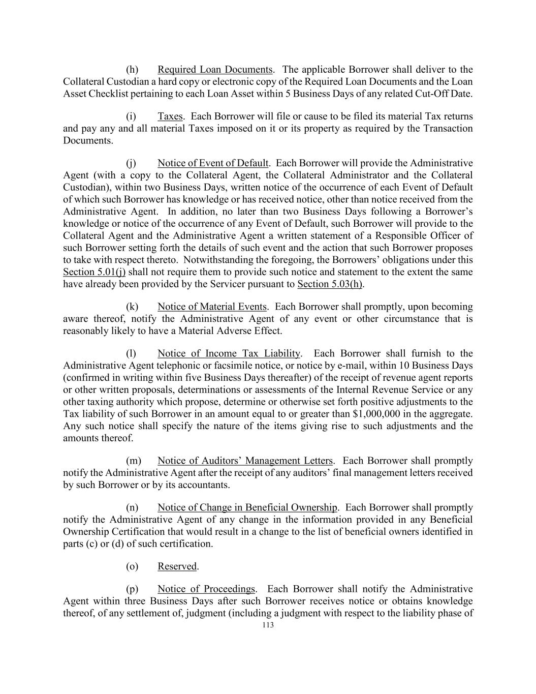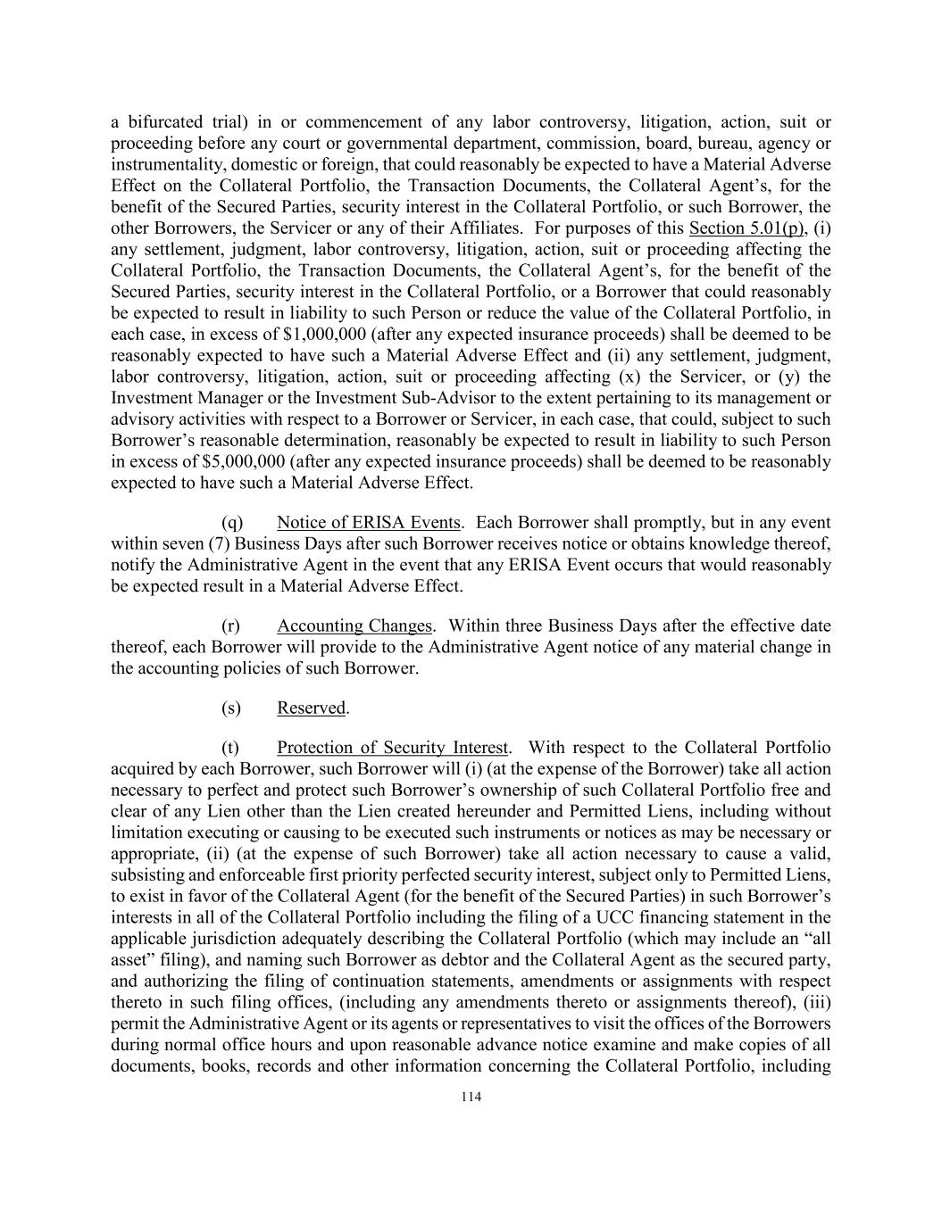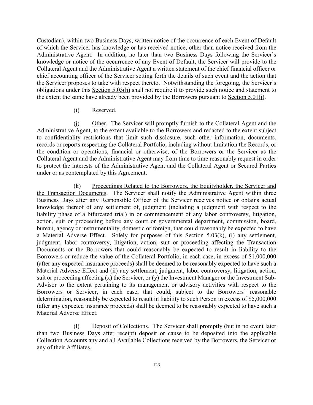 123 Custodian), within two Business Days, written notice of the occurrence of each Event of Default of which the Servicer has knowledge or has received notice, other than notice received from the Administrative Agent. In addition, no later than two Business Days following the Servicer’s knowledge or notice of the occurrence of any Event of Default, the Servicer will provide to the Collateral Agent and the Administrative Agent a written statement of the chief financial officer or chief accounting officer of the Servicer setting forth the details of such event and the action that the Servicer proposes to take with respect thereto. Notwithstanding the foregoing, the Servicer’s obligations under this Section 5.03(h) shall not require it to provide such notice and statement to the extent the same have already been provided by the Borrowers pursuant to Section 5.01(j). (i) Reserved. (j) Other. The Servicer will promptly furnish to the Collateral Agent and the Administrative Agent, to the extent available to the Borrowers and redacted to the extent subject to confidentiality restrictions that limit such disclosure, such other information, documents, records or reports respecting the Collateral Portfolio, including without limitation the Records, or the condition or operations, financial or otherwise, of the Borrowers or the Servicer as the Collateral Agent and the Administrative Agent may from time to time reasonably request in order to protect the interests of the Administrative Agent and the Collateral Agent or Secured Parties under or as contemplated by this Agreement. (k) Proceedings Related to the Borrowers, the Equityholder, the Servicer and the Transaction Documents. The Servicer shall notify the Administrative Agent within three Business Days after any Responsible Officer of the Servicer receives notice or obtains actual knowledge thereof of any settlement of, judgment (including a judgment with respect to the liability phase of a bifurcated trial) in or commencement of any labor controversy, litigation, action, suit or proceeding before any court or governmental department, commission, board, bureau, agency or instrumentality, domestic or foreign, that could reasonably be expected to have a Material Adverse Effect. Solely for purposes of this Section 5.03(k), (i) any settlement, judgment, labor controversy, litigation, action, suit or proceeding affecting the Transaction Documents or the Borrowers that could reasonably be expected to result in liability to the Borrowers or reduce the value of the Collateral Portfolio, in each case, in excess of $1,000,000 (after any expected insurance proceeds) shall be deemed to be reasonably expected to have such a Material Adverse Effect and (ii) any settlement, judgment, labor controversy, litigation, action, suit or proceeding affecting (x) the Servicer, or (y) the Investment Manager or the Investment Sub- Advisor to the extent pertaining to its management or advisory activities with respect to the Borrowers or Servicer, in each case, that could, subject to the Borrowers’ reasonable determination, reasonably be expected to result in liability to such Person in excess of $5,000,000 (after any expected insurance proceeds) shall be deemed to be reasonably expected to have such a Material Adverse Effect. (l) Deposit of Collections. The Servicer shall promptly (but in no event later than two Business Days after receipt) deposit or cause to be deposited into the applicable Collection Accounts any and all Available Collections received by the Borrowers, the Servicer or any of their Affiliates.