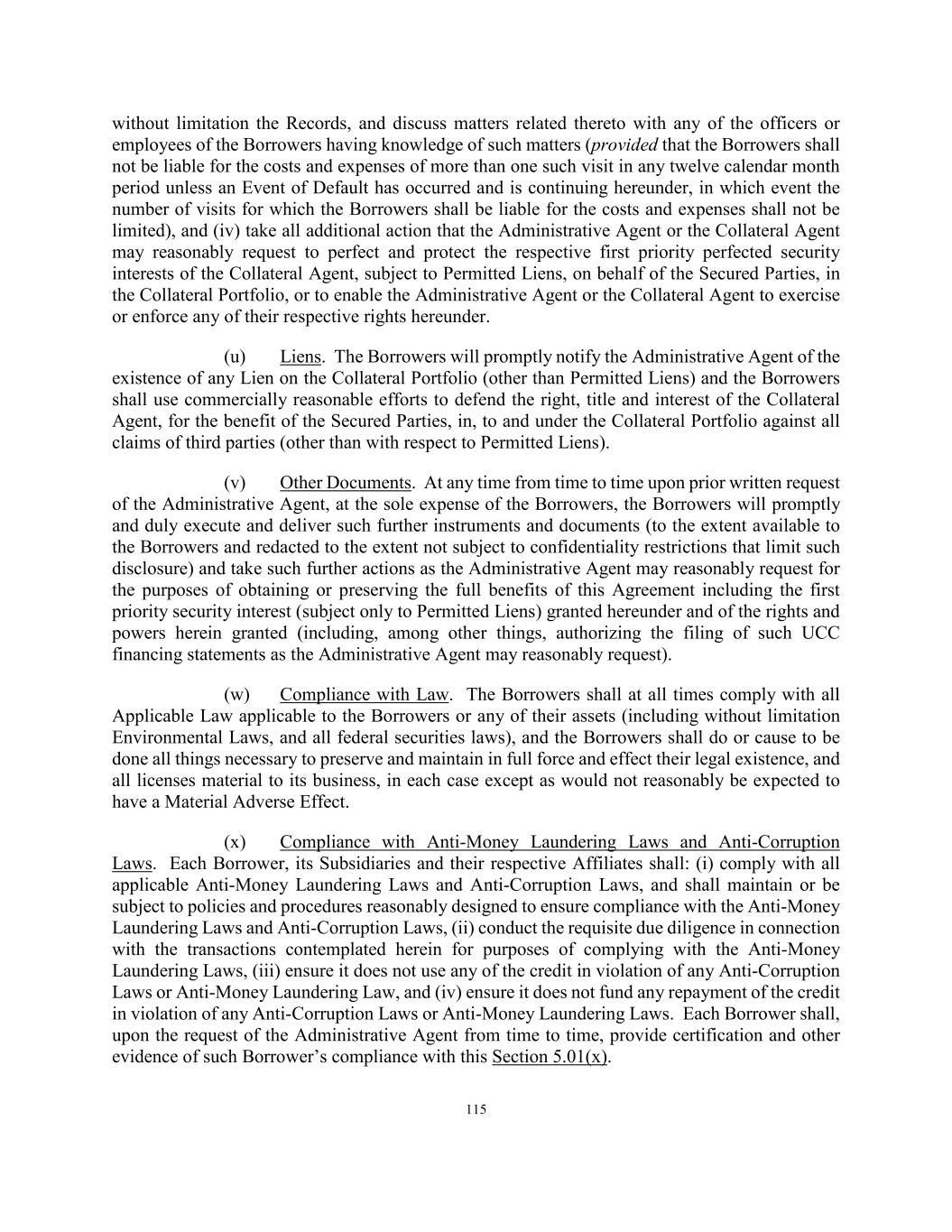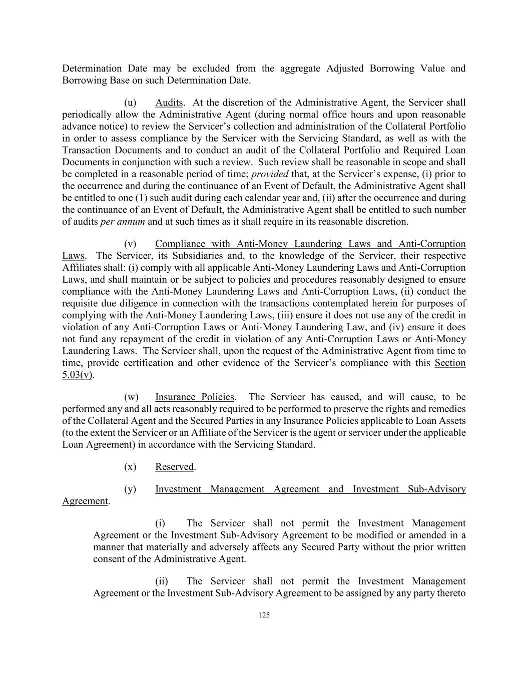 125 Determination Date may be excluded from the aggregate Adjusted Borrowing Value and Borrowing Base on such Determination Date. (u) Audits. At the discretion of the Administrative Agent, the Servicer shall periodically allow the Administrative Agent (during normal office hours and upon reasonable advance notice) to review the Servicer’s collection and administration of the Collateral Portfolio in order to assess compliance by the Servicer with the Servicing Standard, as well as with the Transaction Documents and to conduct an audit of the Collateral Portfolio and Required Loan Documents in conjunction with such a review. Such review shall be reasonable in scope and shall be completed in a reasonable period of time; provided that, at the Servicer’s expense, (i) prior to the occurrence and during the continuance of an Event of Default, the Administrative Agent shall be entitled to one (1) such audit during each calendar year and, (ii) after the occurrence and during the continuance of an Event of Default, the Administrative Agent shall be entitled to such number of audits per annum and at such times as it shall require in its reasonable discretion. (v) Compliance with Anti-Money Laundering Laws and Anti-Corruption Laws. The Servicer, its Subsidiaries and, to the knowledge of the Servicer, their respective Affiliates shall: (i) comply with all applicable Anti-Money Laundering Laws and Anti-Corruption Laws, and shall maintain or be subject to policies and procedures reasonably designed to ensure compliance with the Anti-Money Laundering Laws and Anti-Corruption Laws, (ii) conduct the requisite due diligence in connection with the transactions contemplated herein for purposes of complying with the Anti-Money Laundering Laws, (iii) ensure it does not use any of the credit in violation of any Anti-Corruption Laws or Anti-Money Laundering Law, and (iv) ensure it does not fund any repayment of the credit in violation of any Anti-Corruption Laws or Anti-Money Laundering Laws. The Servicer shall, upon the request of the Administrative Agent from time to time, provide certification and other evidence of the Servicer’s compliance with this Section 5.03(v). (w) Insurance Policies. The Servicer has caused, and will cause, to be performed any and all acts reasonably required to be performed to preserve the rights and remedies of the Collateral Agent and the Secured Parties in any Insurance Policies applicable to Loan Assets (to the extent the Servicer or an Affiliate of the Servicer is the agent or servicer under the applicable Loan Agreement) in accordance with the Servicing Standard. (x) Reserved. (y) Investment Management Agreement and Investment Sub-Advisory Agreement. (i) The Servicer shall not permit the Investment Management Agreement or the Investment Sub-Advisory Agreement to be modified or amended in a manner that materially and adversely affects any Secured Party without the prior written consent of the Administrative Agent. (ii) The Servicer shall not permit the Investment Management Agreement or the Investment Sub-Advisory Agreement to be assigned by any party thereto