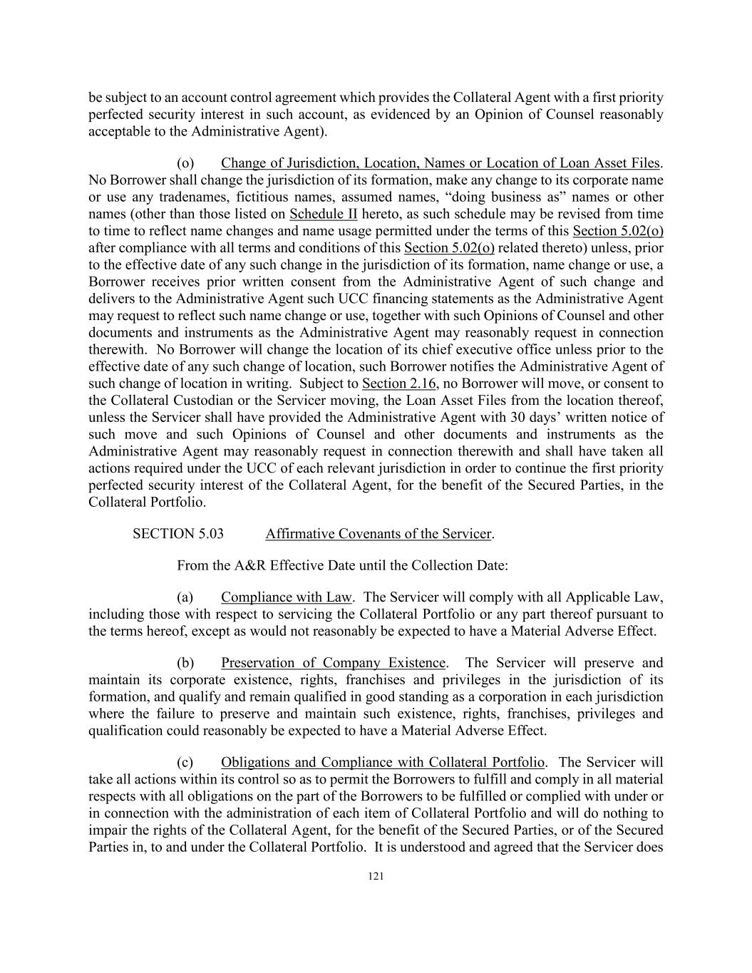 121 be subject to an account control agreement which provides the Collateral Agent with a first priority perfected security interest in such account, as evidenced by an Opinion of Counsel reasonably acceptable to the Administrative Agent). (o) Change of Jurisdiction, Location, Names or Location of Loan Asset Files. No Borrower shall change the jurisdiction of its formation, make any change to its corporate name or use any tradenames, fictitious names, assumed names, “doing business as” names or other names (other than those listed on Schedule II hereto, as such schedule may be revised from time to time to reflect name changes and name usage permitted under the terms of this Section 5.02(o) after compliance with all terms and conditions of this Section 5.02(o) related thereto) unless, prior to the effective date of any such change in the jurisdiction of its formation, name change or use, a Borrower receives prior written consent from the Administrative Agent of such change and delivers to the Administrative Agent such UCC financing statements as the Administrative Agent may request to reflect such name change or use, together with such Opinions of Counsel and other documents and instruments as the Administrative Agent may reasonably request in connection therewith. No Borrower will change the location of its chief executive office unless prior to the effective date of any such change of location, such Borrower notifies the Administrative Agent of such change of location in writing. Subject to Section 2.16, no Borrower will move, or consent to the Collateral Custodian or the Servicer moving, the Loan Asset Files from the location thereof, unless the Servicer shall have provided the Administrative Agent with 30 days’ written notice of such move and such Opinions of Counsel and other documents and instruments as the Administrative Agent may reasonably request in connection therewith and shall have taken all actions required under the UCC of each relevant jurisdiction in order to continue the first priority perfected security interest of the Collateral Agent, for the benefit of the Secured Parties, in the Collateral Portfolio. SECTION 5.03 Affirmative Covenants of the Servicer. From the A&R Effective Date until the Collection Date: (a) Compliance with Law. The Servicer will comply with all Applicable Law, including those with respect to servicing the Collateral Portfolio or any part thereof pursuant to the terms hereof, except as would not reasonably be expected to have a Material Adverse Effect. (b) Preservation of Company Existence. The Servicer will preserve and maintain its corporate existence, rights, franchises and privileges in the jurisdiction of its formation, and qualify and remain qualified in good standing as a corporation in each jurisdiction where the failure to preserve and maintain such existence, rights, franchises, privileges and qualification could reasonably be expected to have a Material Adverse Effect. (c) Obligations and Compliance with Collateral Portfolio. The Servicer will take all actions within its control so as to permit the Borrowers to fulfill and comply in all material respects with all obligations on the part of the Borrowers to be fulfilled or complied with under or in connection with the administration of each item of Collateral Portfolio and will do nothing to impair the rights of the Collateral Agent, for the benefit of the Secured Parties, or of the Secured Parties in, to and under the Collateral Portfolio. It is understood and agreed that the Servicer does