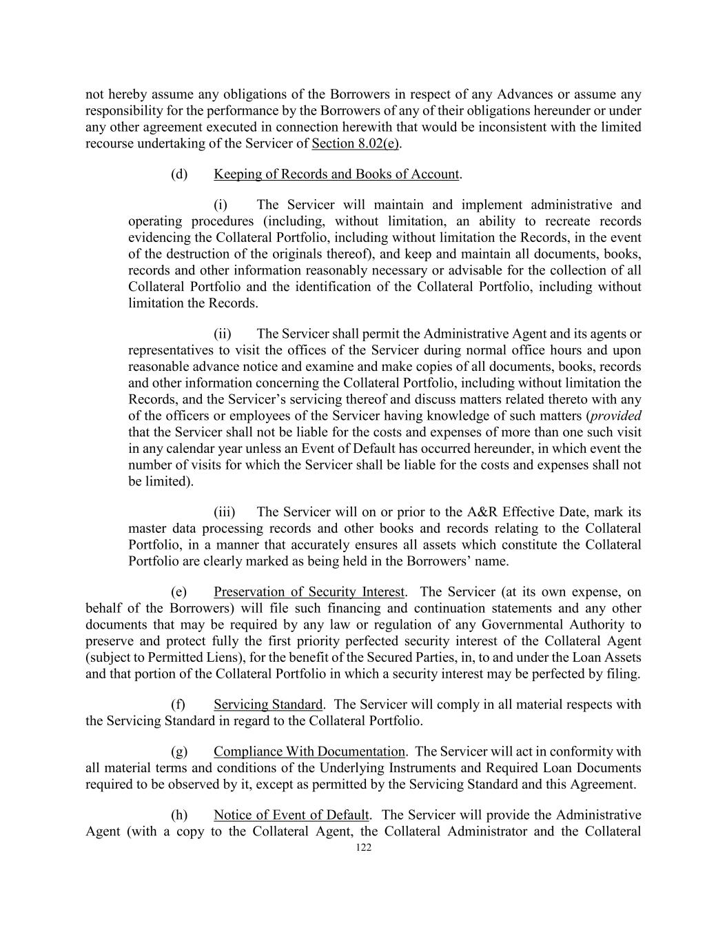 122 not hereby assume any obligations of the Borrowers in respect of any Advances or assume any responsibility for the performance by the Borrowers of any of their obligations hereunder or under any other agreement executed in connection herewith that would be inconsistent with the limited recourse undertaking of the Servicer of Section 8.02(e). (d) Keeping of Records and Books of Account. (i) The Servicer will maintain and implement administrative and operating procedures (including, without limitation, an ability to recreate records evidencing the Collateral Portfolio, including without limitation the Records, in the event of the destruction of the originals thereof), and keep and maintain all documents, books, records and other information reasonably necessary or advisable for the collection of all Collateral Portfolio and the identification of the Collateral Portfolio, including without limitation the Records. (ii) The Servicer shall permit the Administrative Agent and its agents or representatives to visit the offices of the Servicer during normal office hours and upon reasonable advance notice and examine and make copies of all documents, books, records and other information concerning the Collateral Portfolio, including without limitation the Records, and the Servicer’s servicing thereof and discuss matters related thereto with any of the officers or employees of the Servicer having knowledge of such matters (provided that the Servicer shall not be liable for the costs and expenses of more than one such visit in any calendar year unless an Event of Default has occurred hereunder, in which event the number of visits for which the Servicer shall be liable for the costs and expenses shall not be limited). (iii) The Servicer will on or prior to the A&R Effective Date, mark its master data processing records and other books and records relating to the Collateral Portfolio, in a manner that accurately ensures all assets which constitute the Collateral Portfolio are clearly marked as being held in the Borrowers’ name. (e) Preservation of Security Interest. The Servicer (at its own expense, on behalf of the Borrowers) will file such financing and continuation statements and any other documents that may be required by any law or regulation of any Governmental Authority to preserve and protect fully the first priority perfected security interest of the Collateral Agent (subject to Permitted Liens), for the benefit of the Secured Parties, in, to and under the Loan Assets and that portion of the Collateral Portfolio in which a security interest may be perfected by filing. (f) Servicing Standard. The Servicer will comply in all material respects with the Servicing Standard in regard to the Collateral Portfolio. (g) Compliance With Documentation. The Servicer will act in conformity with all material terms and conditions of the Underlying Instruments and Required Loan Documents required to be observed by it, except as permitted by the Servicing Standard and this Agreement. (h) Notice of Event of Default. The Servicer will provide the Administrative Agent (with a copy to the Collateral Agent, the Collateral Administrator and the Collateral