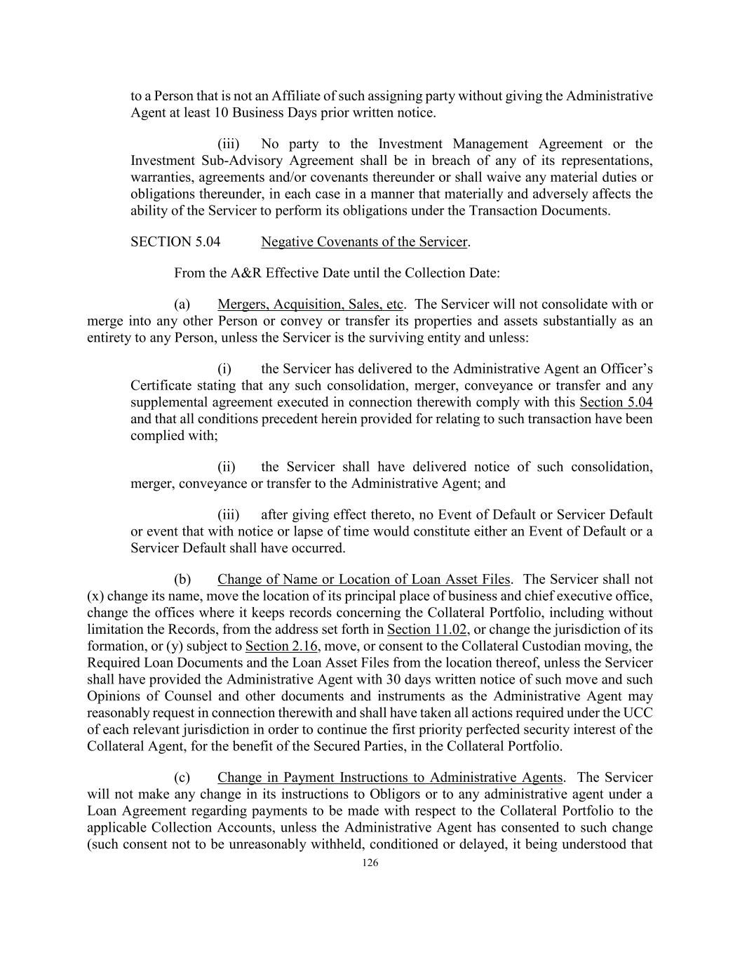 126 to a Person that is not an Affiliate of such assigning party without giving the Administrative Agent at least 10 Business Days prior written notice. (iii) No party to the Investment Management Agreement or the Investment Sub-Advisory Agreement shall be in breach of any of its representations, warranties, agreements and/or covenants thereunder or shall waive any material duties or obligations thereunder, in each case in a manner that materially and adversely affects the ability of the Servicer to perform its obligations under the Transaction Documents. SECTION 5.04 Negative Covenants of the Servicer. From the A&R Effective Date until the Collection Date: (a) Mergers, Acquisition, Sales, etc. The Servicer will not consolidate with or merge into any other Person or convey or transfer its properties and assets substantially as an entirety to any Person, unless the Servicer is the surviving entity and unless: (i) the Servicer has delivered to the Administrative Agent an Officer’s Certificate stating that any such consolidation, merger, conveyance or transfer and any supplemental agreement executed in connection therewith comply with this Section 5.04 and that all conditions precedent herein provided for relating to such transaction have been complied with; (ii) the Servicer shall have delivered notice of such consolidation, merger, conveyance or transfer to the Administrative Agent; and (iii) after giving effect thereto, no Event of Default or Servicer Default or event that with notice or lapse of time would constitute either an Event of Default or a Servicer Default shall have occurred. (b) Change of Name or Location of Loan Asset Files. The Servicer shall not (x) change its name, move the location of its principal place of business and chief executive office, change the offices where it keeps records concerning the Collateral Portfolio, including without limitation the Records, from the address set forth in Section 11.02, or change the jurisdiction of its formation, or (y) subject to Section 2.16, move, or consent to the Collateral Custodian moving, the Required Loan Documents and the Loan Asset Files from the location thereof, unless the Servicer shall have provided the Administrative Agent with 30 days written notice of such move and such Opinions of Counsel and other documents and instruments as the Administrative Agent may reasonably request in connection therewith and shall have taken all actions required under the UCC of each relevant jurisdiction in order to continue the first priority perfected security interest of the Collateral Agent, for the benefit of the Secured Parties, in the Collateral Portfolio. (c) Change in Payment Instructions to Administrative Agents. The Servicer will not make any change in its instructions to Obligors or to any administrative agent under a Loan Agreement regarding payments to be made with respect to the Collateral Portfolio to the applicable Collection Accounts, unless the Administrative Agent has consented to such change (such consent not to be unreasonably withheld, conditioned or delayed, it being understood that