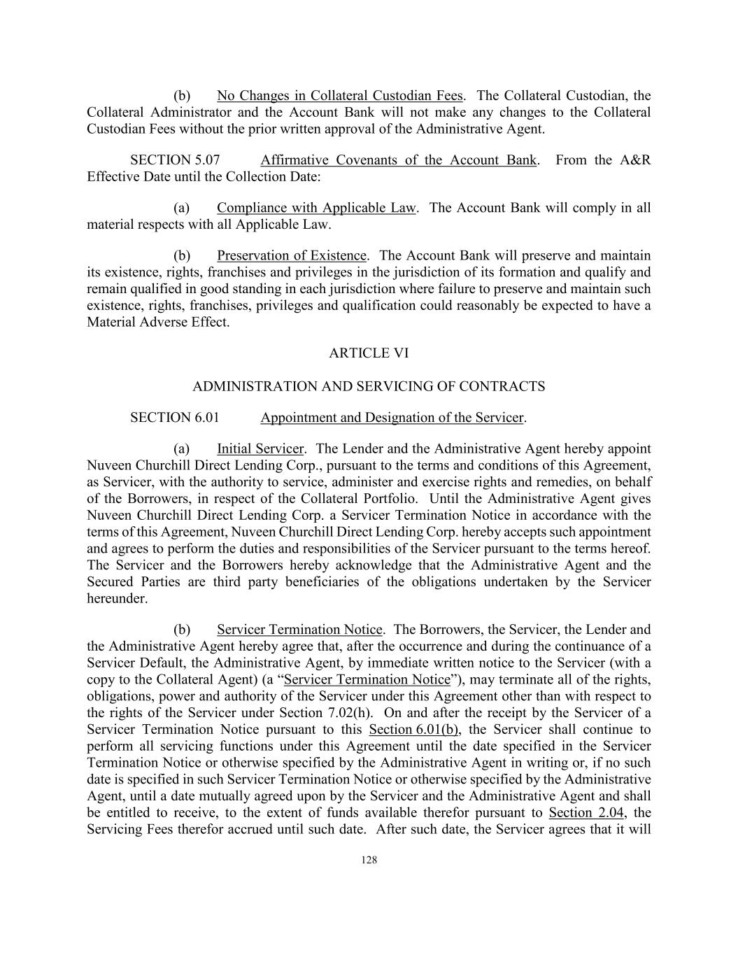 128 (b) No Changes in Collateral Custodian Fees. The Collateral Custodian, the Collateral Administrator and the Account Bank will not make any changes to the Collateral Custodian Fees without the prior written approval of the Administrative Agent. SECTION 5.07 Affirmative Covenants of the Account Bank. From the A&R Effective Date until the Collection Date: (a) Compliance with Applicable Law. The Account Bank will comply in all material respects with all Applicable Law. (b) Preservation of Existence. The Account Bank will preserve and maintain its existence, rights, franchises and privileges in the jurisdiction of its formation and qualify and remain qualified in good standing in each jurisdiction where failure to preserve and maintain such existence, rights, franchises, privileges and qualification could reasonably be expected to have a Material Adverse Effect. ARTICLE VI ADMINISTRATION AND SERVICING OF CONTRACTS SECTION 6.01 Appointment and Designation of the Servicer. (a) Initial Servicer. The Lender and the Administrative Agent hereby appoint Nuveen Churchill Direct Lending Corp., pursuant to the terms and conditions of this Agreement, as Servicer, with the authority to service, administer and exercise rights and remedies, on behalf of the Borrowers, in respect of the Collateral Portfolio. Until the Administrative Agent gives Nuveen Churchill Direct Lending Corp. a Servicer Termination Notice in accordance with the terms of this Agreement, Nuveen Churchill Direct Lending Corp. hereby accepts such appointment and agrees to perform the duties and responsibilities of the Servicer pursuant to the terms hereof. The Servicer and the Borrowers hereby acknowledge that the Administrative Agent and the Secured Parties are third party beneficiaries of the obligations undertaken by the Servicer hereunder. (b) Servicer Termination Notice. The Borrowers, the Servicer, the Lender and the Administrative Agent hereby agree that, after the occurrence and during the continuance of a Servicer Default, the Administrative Agent, by immediate written notice to the Servicer (with a copy to the Collateral Agent) (a “Servicer Termination Notice”), may terminate all of the rights, obligations, power and authority of the Servicer under this Agreement other than with respect to the rights of the Servicer under Section 7.02(h). On and after the receipt by the Servicer of a Servicer Termination Notice pursuant to this Section 6.01(b), the Servicer shall continue to perform all servicing functions under this Agreement until the date specified in the Servicer Termination Notice or otherwise specified by the Administrative Agent in writing or, if no such date is specified in such Servicer Termination Notice or otherwise specified by the Administrative Agent, until a date mutually agreed upon by the Servicer and the Administrative Agent and shall be entitled to receive, to the extent of funds available therefor pursuant to Section 2.04, the Servicing Fees therefor accrued until such date. After such date, the Servicer agrees that it will