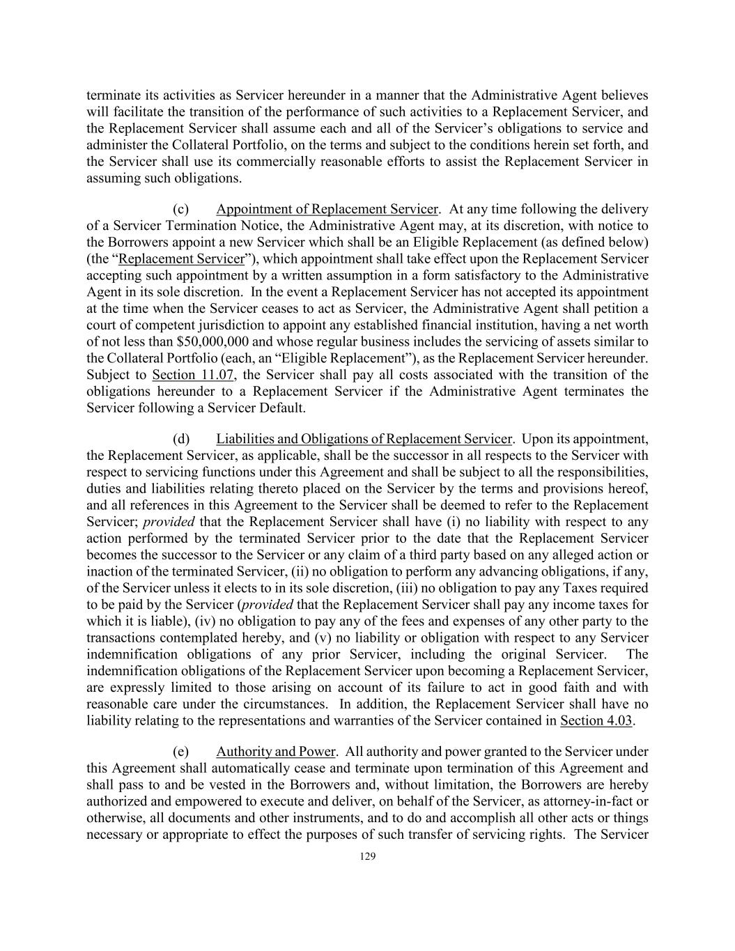 129 terminate its activities as Servicer hereunder in a manner that the Administrative Agent believes will facilitate the transition of the performance of such activities to a Replacement Servicer, and the Replacement Servicer shall assume each and all of the Servicer’s obligations to service and administer the Collateral Portfolio, on the terms and subject to the conditions herein set forth, and the Servicer shall use its commercially reasonable efforts to assist the Replacement Servicer in assuming such obligations. (c) Appointment of Replacement Servicer. At any time following the delivery of a Servicer Termination Notice, the Administrative Agent may, at its discretion, with notice to the Borrowers appoint a new Servicer which shall be an Eligible Replacement (as defined below) (the “Replacement Servicer”), which appointment shall take effect upon the Replacement Servicer accepting such appointment by a written assumption in a form satisfactory to the Administrative Agent in its sole discretion. In the event a Replacement Servicer has not accepted its appointment at the time when the Servicer ceases to act as Servicer, the Administrative Agent shall petition a court of competent jurisdiction to appoint any established financial institution, having a net worth of not less than $50,000,000 and whose regular business includes the servicing of assets similar to the Collateral Portfolio (each, an “Eligible Replacement”), as the Replacement Servicer hereunder. Subject to Section 11.07, the Servicer shall pay all costs associated with the transition of the obligations hereunder to a Replacement Servicer if the Administrative Agent terminates the Servicer following a Servicer Default. (d) Liabilities and Obligations of Replacement Servicer. Upon its appointment, the Replacement Servicer, as applicable, shall be the successor in all respects to the Servicer with respect to servicing functions under this Agreement and shall be subject to all the responsibilities, duties and liabilities relating thereto placed on the Servicer by the terms and provisions hereof, and all references in this Agreement to the Servicer shall be deemed to refer to the Replacement Servicer; provided that the Replacement Servicer shall have (i) no liability with respect to any action performed by the terminated Servicer prior to the date that the Replacement Servicer becomes the successor to the Servicer or any claim of a third party based on any alleged action or inaction of the terminated Servicer, (ii) no obligation to perform any advancing obligations, if any, of the Servicer unless it elects to in its sole discretion, (iii) no obligation to pay any Taxes required to be paid by the Servicer (provided that the Replacement Servicer shall pay any income taxes for which it is liable), (iv) no obligation to pay any of the fees and expenses of any other party to the transactions contemplated hereby, and (v) no liability or obligation with respect to any Servicer indemnification obligations of any prior Servicer, including the original Servicer. The indemnification obligations of the Replacement Servicer upon becoming a Replacement Servicer, are expressly limited to those arising on account of its failure to act in good faith and with reasonable care under the circumstances. In addition, the Replacement Servicer shall have no liability relating to the representations and warranties of the Servicer contained in Section 4.03. (e) Authority and Power. All authority and power granted to the Servicer under this Agreement shall automatically cease and terminate upon termination of this Agreement and shall pass to and be vested in the Borrowers and, without limitation, the Borrowers are hereby authorized and empowered to execute and deliver, on behalf of the Servicer, as attorney-in-fact or otherwise, all documents and other instruments, and to do and accomplish all other acts or things necessary or appropriate to effect the purposes of such transfer of servicing rights. The Servicer