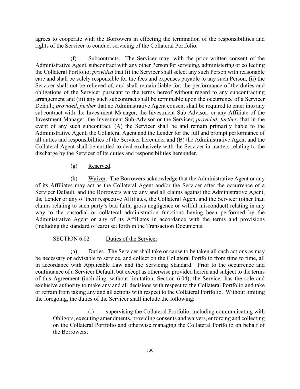 130 agrees to cooperate with the Borrowers in effecting the termination of the responsibilities and rights of the Servicer to conduct servicing of the Collateral Portfolio. (f) Subcontracts. The Servicer may, with the prior written consent of the Administrative Agent, subcontract with any other Person for servicing, administering or collecting the Collateral Portfolio; provided that (i) the Servicer shall select any such Person with reasonable care and shall be solely responsible for the fees and expenses payable to any such Person, (ii) the Servicer shall not be relieved of, and shall remain liable for, the performance of the duties and obligations of the Servicer pursuant to the terms hereof without regard to any subcontracting arrangement and (iii) any such subcontract shall be terminable upon the occurrence of a Servicer Default; provided, further that no Administrative Agent consent shall be required to enter into any subcontract with the Investment Manager, the Investment Sub-Advisor, or any Affiliate of the Investment Manager, the Investment Sub-Advisor or the Servicer; provided, further, that in the event of any such subcontract, (A) the Servicer shall be and remain primarily liable to the Administrative Agent, the Collateral Agent and the Lender for the full and prompt performance of all duties and responsibilities of the Servicer hereunder and (B) the Administrative Agent and the Collateral Agent shall be entitled to deal exclusively with the Servicer in matters relating to the discharge by the Servicer of its duties and responsibilities hereunder. (g) Reserved. (h) Waiver. The Borrowers acknowledge that the Administrative Agent or any of its Affiliates may act as the Collateral Agent and/or the Servicer after the occurrence of a Servicer Default, and the Borrowers waive any and all claims against the Administrative Agent, the Lender or any of their respective Affiliates, the Collateral Agent and the Servicer (other than claims relating to such party’s bad faith, gross negligence or willful misconduct) relating in any way to the custodial or collateral administration functions having been performed by the Administrative Agent or any of its Affiliates in accordance with the terms and provisions (including the standard of care) set forth in the Transaction Documents. SECTION 6.02 Duties of the Servicer. (a) Duties. The Servicer shall take or cause to be taken all such actions as may be necessary or advisable to service, and collect on the Collateral Portfolio from time to time, all in accordance with Applicable Law and the Servicing Standard. Prior to the occurrence and continuance of a Servicer Default, but except as otherwise provided herein and subject to the terms of this Agreement (including, without limitation, Section 6.04), the Servicer has the sole and exclusive authority to make any and all decisions with respect to the Collateral Portfolio and take or refrain from taking any and all actions with respect to the Collateral Portfolio. Without limiting the foregoing, the duties of the Servicer shall include the following: (i) supervising the Collateral Portfolio, including communicating with Obligors, executing amendments, providing consents and waivers, enforcing and collecting on the Collateral Portfolio and otherwise managing the Collateral Portfolio on behalf of the Borrowers;