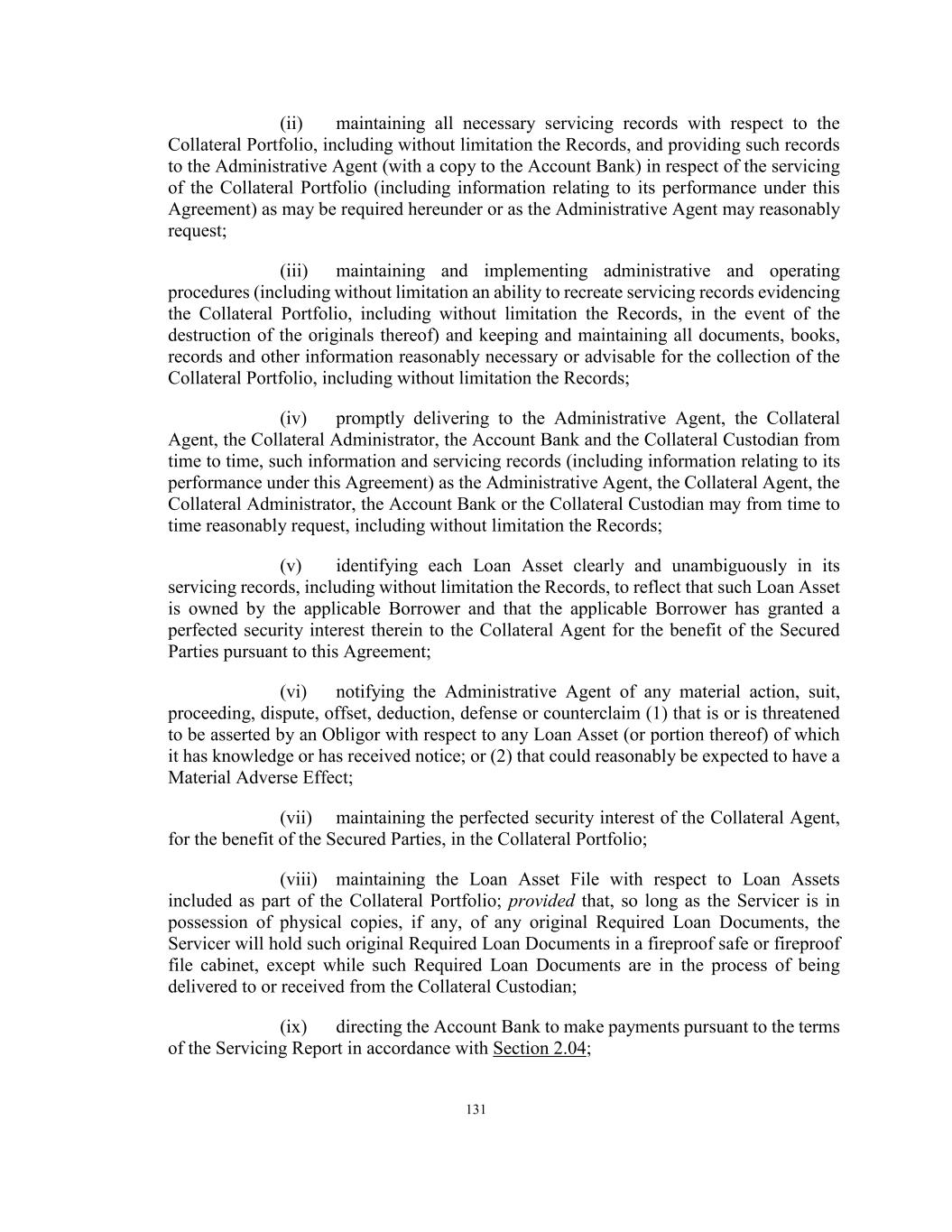 131 (ii) maintaining all necessary servicing records with respect to the Collateral Portfolio, including without limitation the Records, and providing such records to the Administrative Agent (with a copy to the Account Bank) in respect of the servicing of the Collateral Portfolio (including information relating to its performance under this Agreement) as may be required hereunder or as the Administrative Agent may reasonably request; (iii) maintaining and implementing administrative and operating procedures (including without limitation an ability to recreate servicing records evidencing the Collateral Portfolio, including without limitation the Records, in the event of the destruction of the originals thereof) and keeping and maintaining all documents, books, records and other information reasonably necessary or advisable for the collection of the Collateral Portfolio, including without limitation the Records; (iv) promptly delivering to the Administrative Agent, the Collateral Agent, the Collateral Administrator, the Account Bank and the Collateral Custodian from time to time, such information and servicing records (including information relating to its performance under this Agreement) as the Administrative Agent, the Collateral Agent, the Collateral Administrator, the Account Bank or the Collateral Custodian may from time to time reasonably request, including without limitation the Records; (v) identifying each Loan Asset clearly and unambiguously in its servicing records, including without limitation the Records, to reflect that such Loan Asset is owned by the applicable Borrower and that the applicable Borrower has granted a perfected security interest therein to the Collateral Agent for the benefit of the Secured Parties pursuant to this Agreement; (vi) notifying the Administrative Agent of any material action, suit, proceeding, dispute, offset, deduction, defense or counterclaim (1) that is or is threatened to be asserted by an Obligor with respect to any Loan Asset (or portion thereof) of which it has knowledge or has received notice; or (2) that could reasonably be expected to have a Material Adverse Effect; (vii) maintaining the perfected security interest of the Collateral Agent, for the benefit of the Secured Parties, in the Collateral Portfolio; (viii) maintaining the Loan Asset File with respect to Loan Assets included as part of the Collateral Portfolio; provided that, so long as the Servicer is in possession of physical copies, if any, of any original Required Loan Documents, the Servicer will hold such original Required Loan Documents in a fireproof safe or fireproof file cabinet, except while such Required Loan Documents are in the process of being delivered to or received from the Collateral Custodian; (ix) directing the Account Bank to make payments pursuant to the terms of the Servicing Report in accordance with Section 2.04;