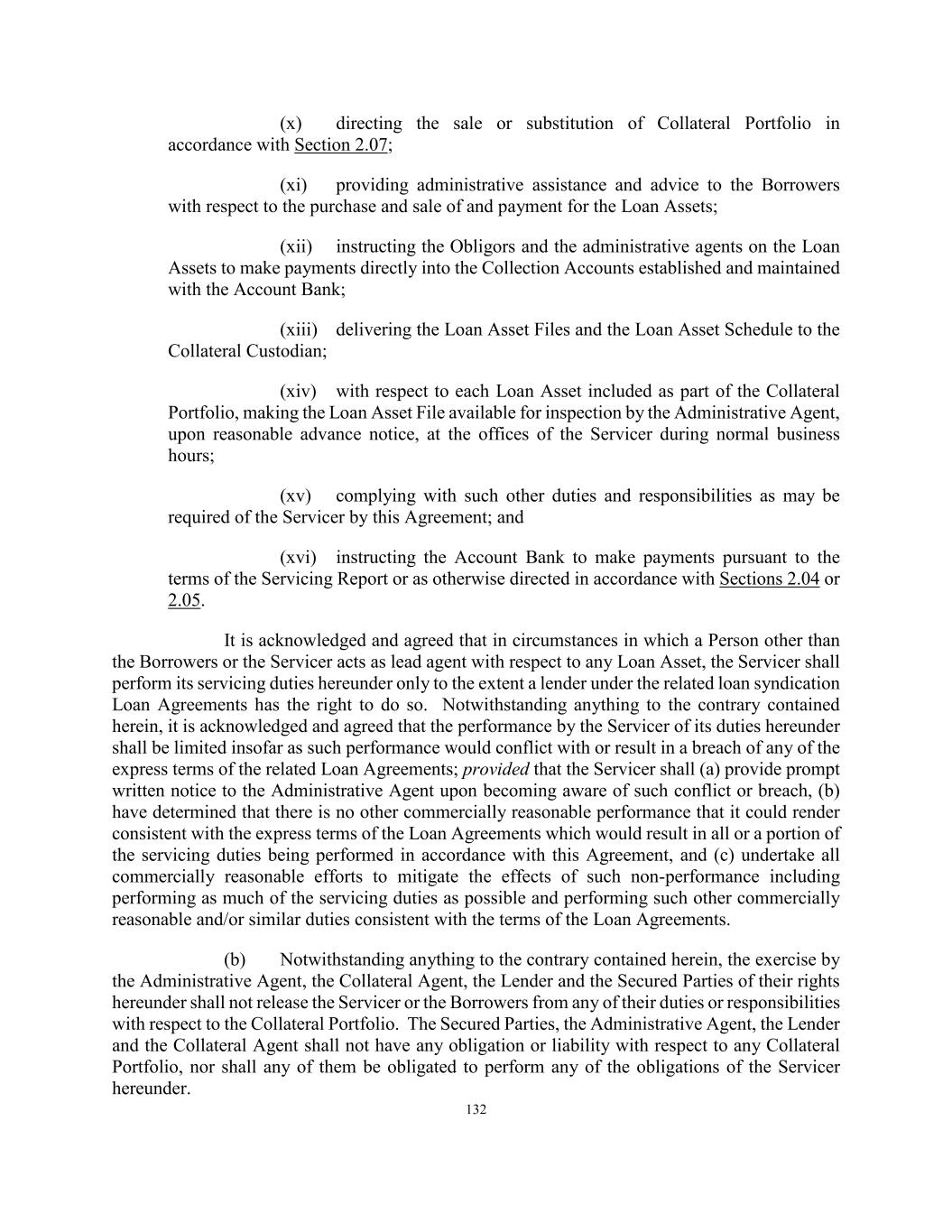 132 (x) directing the sale or substitution of Collateral Portfolio in accordance with Section 2.07; (xi) providing administrative assistance and advice to the Borrowers with respect to the purchase and sale of and payment for the Loan Assets; (xii) instructing the Obligors and the administrative agents on the Loan Assets to make payments directly into the Collection Accounts established and maintained with the Account Bank; (xiii) delivering the Loan Asset Files and the Loan Asset Schedule to the Collateral Custodian; (xiv) with respect to each Loan Asset included as part of the Collateral Portfolio, making the Loan Asset File available for inspection by the Administrative Agent, upon reasonable advance notice, at the offices of the Servicer during normal business hours; (xv) complying with such other duties and responsibilities as may be required of the Servicer by this Agreement; and (xvi) instructing the Account Bank to make payments pursuant to the terms of the Servicing Report or as otherwise directed in accordance with Sections 2.04 or 2.05. It is acknowledged and agreed that in circumstances in which a Person other than the Borrowers or the Servicer acts as lead agent with respect to any Loan Asset, the Servicer shall perform its servicing duties hereunder only to the extent a lender under the related loan syndication Loan Agreements has the right to do so. Notwithstanding anything to the contrary contained herein, it is acknowledged and agreed that the performance by the Servicer of its duties hereunder shall be limited insofar as such performance would conflict with or result in a breach of any of the express terms of the related Loan Agreements; provided that the Servicer shall (a) provide prompt written notice to the Administrative Agent upon becoming aware of such conflict or breach, (b) have determined that there is no other commercially reasonable performance that it could render consistent with the express terms of the Loan Agreements which would result in all or a portion of the servicing duties being performed in accordance with this Agreement, and (c) undertake all commercially reasonable efforts to mitigate the effects of such non-performance including performing as much of the servicing duties as possible and performing such other commercially reasonable and/or similar duties consistent with the terms of the Loan Agreements. (b) Notwithstanding anything to the contrary contained herein, the exercise by the Administrative Agent, the Collateral Agent, the Lender and the Secured Parties of their rights hereunder shall not release the Servicer or the Borrowers from any of their duties or responsibilities with respect to the Collateral Portfolio. The Secured Parties, the Administrative Agent, the Lender and the Collateral Agent shall not have any obligation or liability with respect to any Collateral Portfolio, nor shall any of them be obligated to perform any of the obligations of the Servicer hereunder.