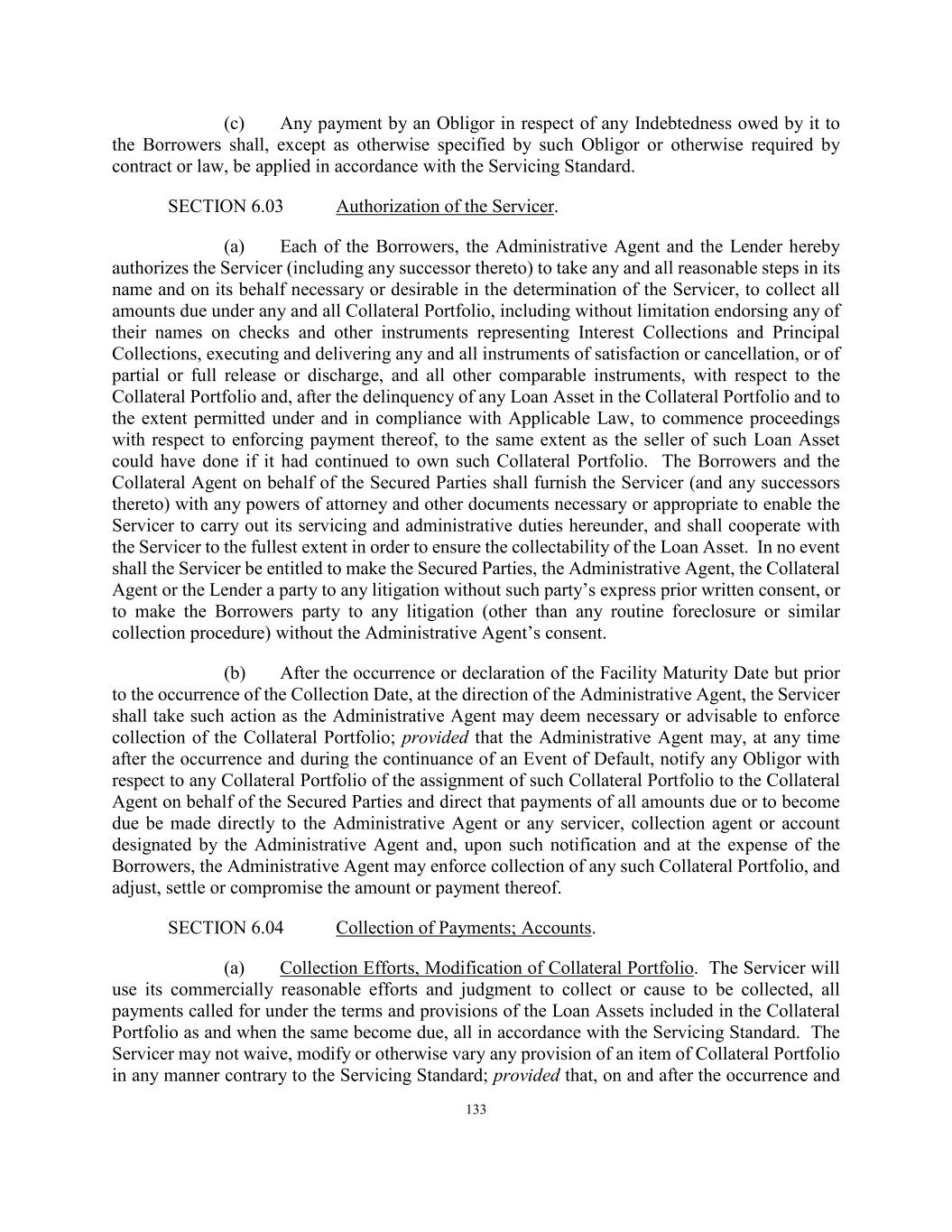 133 (c) Any payment by an Obligor in respect of any Indebtedness owed by it to the Borrowers shall, except as otherwise specified by such Obligor or otherwise required by contract or law, be applied in accordance with the Servicing Standard. SECTION 6.03 Authorization of the Servicer. (a) Each of the Borrowers, the Administrative Agent and the Lender hereby authorizes the Servicer (including any successor thereto) to take any and all reasonable steps in its name and on its behalf necessary or desirable in the determination of the Servicer, to collect all amounts due under any and all Collateral Portfolio, including without limitation endorsing any of their names on checks and other instruments representing Interest Collections and Principal Collections, executing and delivering any and all instruments of satisfaction or cancellation, or of partial or full release or discharge, and all other comparable instruments, with respect to the Collateral Portfolio and, after the delinquency of any Loan Asset in the Collateral Portfolio and to the extent permitted under and in compliance with Applicable Law, to commence proceedings with respect to enforcing payment thereof, to the same extent as the seller of such Loan Asset could have done if it had continued to own such Collateral Portfolio. The Borrowers and the Collateral Agent on behalf of the Secured Parties shall furnish the Servicer (and any successors thereto) with any powers of attorney and other documents necessary or appropriate to enable the Servicer to carry out its servicing and administrative duties hereunder, and shall cooperate with the Servicer to the fullest extent in order to ensure the collectability of the Loan Asset. In no event shall the Servicer be entitled to make the Secured Parties, the Administrative Agent, the Collateral Agent or the Lender a party to any litigation without such party’s express prior written consent, or to make the Borrowers party to any litigation (other than any routine foreclosure or similar collection procedure) without the Administrative Agent’s consent. (b) After the occurrence or declaration of the Facility Maturity Date but prior to the occurrence of the Collection Date, at the direction of the Administrative Agent, the Servicer shall take such action as the Administrative Agent may deem necessary or advisable to enforce collection of the Collateral Portfolio; provided that the Administrative Agent may, at any time after the occurrence and during the continuance of an Event of Default, notify any Obligor with respect to any Collateral Portfolio of the assignment of such Collateral Portfolio to the Collateral Agent on behalf of the Secured Parties and direct that payments of all amounts due or to become due be made directly to the Administrative Agent or any servicer, collection agent or account designated by the Administrative Agent and, upon such notification and at the expense of the Borrowers, the Administrative Agent may enforce collection of any such Collateral Portfolio, and adjust, settle or compromise the amount or payment thereof. SECTION 6.04 Collection of Payments; Accounts. (a) Collection Efforts, Modification of Collateral Portfolio. The Servicer will use its commercially reasonable efforts and judgment to collect or cause to be collected, all payments called for under the terms and provisions of the Loan Assets included in the Collateral Portfolio as and when the same become due, all in accordance with the Servicing Standard. The Servicer may not waive, modify or otherwise vary any provision of an item of Collateral Portfolio in any manner contrary to the Servicing Standard; provided that, on and after the occurrence and