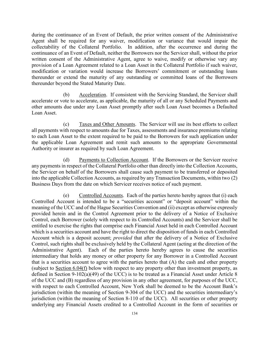 134 during the continuance of an Event of Default, the prior written consent of the Administrative Agent shall be required for any waiver, modification or variance that would impair the collectability of the Collateral Portfolio. In addition, after the occurrence and during the continuance of an Event of Default, neither the Borrowers nor the Servicer shall, without the prior written consent of the Administrative Agent, agree to waive, modify or otherwise vary any provision of a Loan Agreement related to a Loan Asset in the Collateral Portfolio if such waiver, modification or variation would increase the Borrowers’ commitment or outstanding loans thereunder or extend the maturity of any outstanding or committed loans of the Borrowers thereunder beyond the Stated Maturity Date. (b) Acceleration. If consistent with the Servicing Standard, the Servicer shall accelerate or vote to accelerate, as applicable, the maturity of all or any Scheduled Payments and other amounts due under any Loan Asset promptly after such Loan Asset becomes a Defaulted Loan Asset. (c) Taxes and Other Amounts. The Servicer will use its best efforts to collect all payments with respect to amounts due for Taxes, assessments and insurance premiums relating to each Loan Asset to the extent required to be paid to the Borrowers for such application under the applicable Loan Agreement and remit such amounts to the appropriate Governmental Authority or insurer as required by such Loan Agreement. (d) Payments to Collection Account. If the Borrowers or the Servicer receive any payments in respect of the Collateral Portfolio other than directly into the Collection Accounts, the Servicer on behalf of the Borrowers shall cause such payment to be transferred or deposited into the applicable Collection Accounts, as required by any Transaction Documents, within two (2) Business Days from the date on which Servicer receives notice of such payment. (e) Controlled Accounts. Each of the parties hereto hereby agrees that (i) each Controlled Account is intended to be a “securities account” or “deposit account” within the meaning of the UCC and of the Hague Securities Convention and (ii) except as otherwise expressly provided herein and in the Control Agreement prior to the delivery of a Notice of Exclusive Control, each Borrower (solely with respect to its Controlled Accounts) and the Servicer shall be entitled to exercise the rights that comprise each Financial Asset held in each Controlled Account which is a securities account and have the right to direct the disposition of funds in each Controlled Account which is a deposit account; provided that after the delivery of a Notice of Exclusive Control, such rights shall be exclusively held by the Collateral Agent (acting at the direction of the Administrative Agent). Each of the parties hereto hereby agrees to cause the securities intermediary that holds any money or other property for any Borrower in a Controlled Account that is a securities account to agree with the parties hereto that (A) the cash and other property (subject to Section 6.04(f) below with respect to any property other than investment property, as defined in Section 9-102(a)(49) of the UCC) is to be treated as a Financial Asset under Article 8 of the UCC and (B) regardless of any provision in any other agreement, for purposes of the UCC, with respect to each Controlled Account, New York shall be deemed to be the Account Bank’s jurisdiction (within the meaning of Section 9-304 of the UCC) and the securities intermediary’s jurisdiction (within the meaning of Section 8-110 of the UCC). All securities or other property underlying any Financial Assets credited to a Controlled Account in the form of securities or