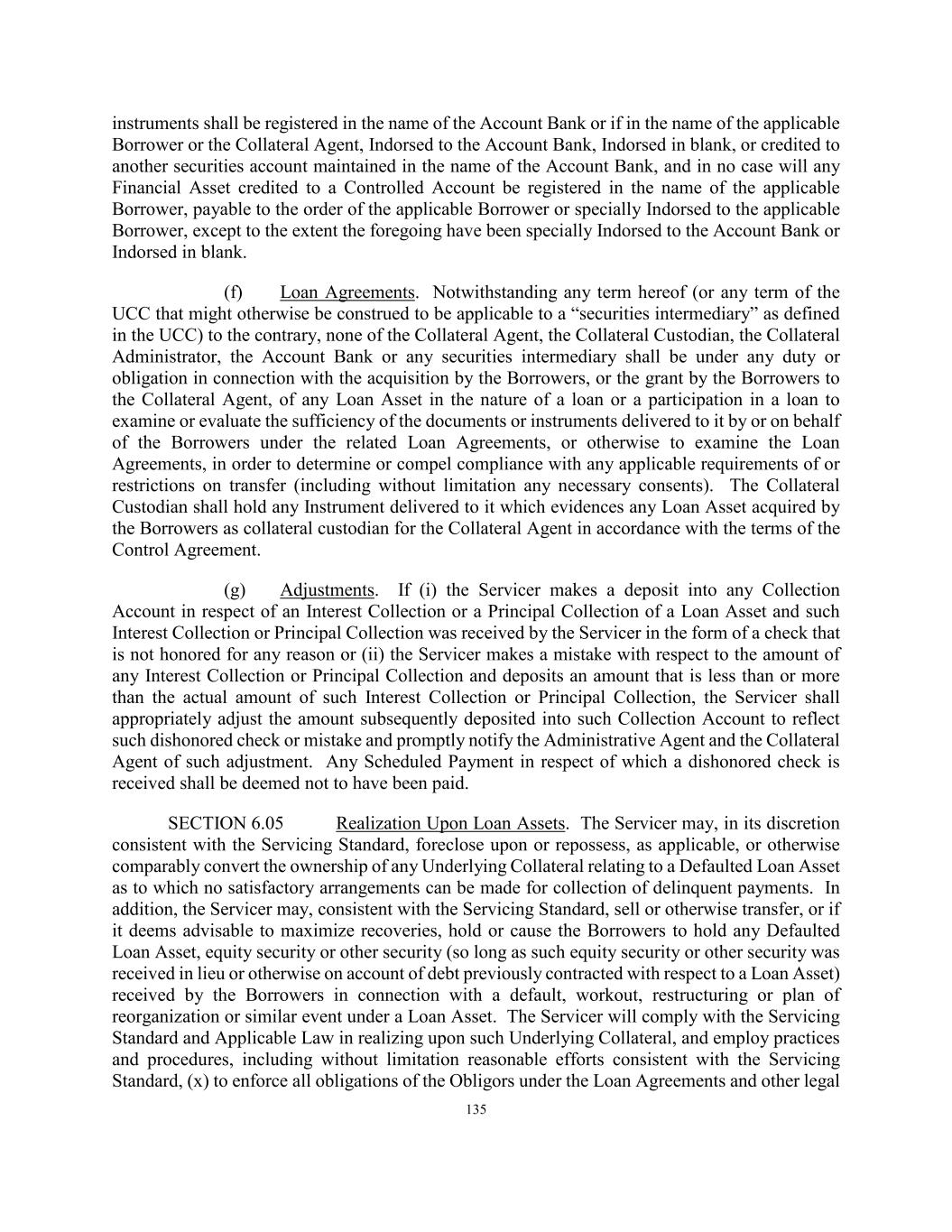 135 instruments shall be registered in the name of the Account Bank or if in the name of the applicable Borrower or the Collateral Agent, Indorsed to the Account Bank, Indorsed in blank, or credited to another securities account maintained in the name of the Account Bank, and in no case will any Financial Asset credited to a Controlled Account be registered in the name of the applicable Borrower, payable to the order of the applicable Borrower or specially Indorsed to the applicable Borrower, except to the extent the foregoing have been specially Indorsed to the Account Bank or Indorsed in blank. (f) Loan Agreements. Notwithstanding any term hereof (or any term of the UCC that might otherwise be construed to be applicable to a “securities intermediary” as defined in the UCC) to the contrary, none of the Collateral Agent, the Collateral Custodian, the Collateral Administrator, the Account Bank or any securities intermediary shall be under any duty or obligation in connection with the acquisition by the Borrowers, or the grant by the Borrowers to the Collateral Agent, of any Loan Asset in the nature of a loan or a participation in a loan to examine or evaluate the sufficiency of the documents or instruments delivered to it by or on behalf of the Borrowers under the related Loan Agreements, or otherwise to examine the Loan Agreements, in order to determine or compel compliance with any applicable requirements of or restrictions on transfer (including without limitation any necessary consents). The Collateral Custodian shall hold any Instrument delivered to it which evidences any Loan Asset acquired by the Borrowers as collateral custodian for the Collateral Agent in accordance with the terms of the Control Agreement. (g) Adjustments. If (i) the Servicer makes a deposit into any Collection Account in respect of an Interest Collection or a Principal Collection of a Loan Asset and such Interest Collection or Principal Collection was received by the Servicer in the form of a check that is not honored for any reason or (ii) the Servicer makes a mistake with respect to the amount of any Interest Collection or Principal Collection and deposits an amount that is less than or more than the actual amount of such Interest Collection or Principal Collection, the Servicer shall appropriately adjust the amount subsequently deposited into such Collection Account to reflect such dishonored check or mistake and promptly notify the Administrative Agent and the Collateral Agent of such adjustment. Any Scheduled Payment in respect of which a dishonored check is received shall be deemed not to have been paid. SECTION 6.05 Realization Upon Loan Assets. The Servicer may, in its discretion consistent with the Servicing Standard, foreclose upon or repossess, as applicable, or otherwise comparably convert the ownership of any Underlying Collateral relating to a Defaulted Loan Asset as to which no satisfactory arrangements can be made for collection of delinquent payments. In addition, the Servicer may, consistent with the Servicing Standard, sell or otherwise transfer, or if it deems advisable to maximize recoveries, hold or cause the Borrowers to hold any Defaulted Loan Asset, equity security or other security (so long as such equity security or other security was received in lieu or otherwise on account of debt previously contracted with respect to a Loan Asset) received by the Borrowers in connection with a default, workout, restructuring or plan of reorganization or similar event under a Loan Asset. The Servicer will comply with the Servicing Standard and Applicable Law in realizing upon such Underlying Collateral, and employ practices and procedures, including without limitation reasonable efforts consistent with the Servicing Standard, (x) to enforce all obligations of the Obligors under the Loan Agreements and other legal