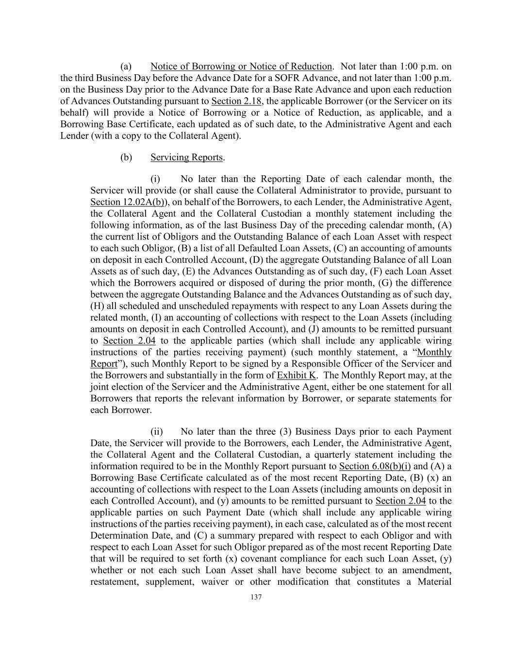 137 (a) Notice of Borrowing or Notice of Reduction. Not later than 1:00 p.m. on the third Business Day before the Advance Date for a SOFR Advance, and not later than 1:00 p.m. on the Business Day prior to the Advance Date for a Base Rate Advance and upon each reduction of Advances Outstanding pursuant to Section 2.18, the applicable Borrower (or the Servicer on its behalf) will provide a Notice of Borrowing or a Notice of Reduction, as applicable, and a Borrowing Base Certificate, each updated as of such date, to the Administrative Agent and each Lender (with a copy to the Collateral Agent). (b) Servicing Reports. (i) No later than the Reporting Date of each calendar month, the Servicer will provide (or shall cause the Collateral Administrator to provide, pursuant to Section 12.02A(b)), on behalf of the Borrowers, to each Lender, the Administrative Agent, the Collateral Agent and the Collateral Custodian a monthly statement including the following information, as of the last Business Day of the preceding calendar month, (A) the current list of Obligors and the Outstanding Balance of each Loan Asset with respect to each such Obligor, (B) a list of all Defaulted Loan Assets, (C) an accounting of amounts on deposit in each Controlled Account, (D) the aggregate Outstanding Balance of all Loan Assets as of such day, (E) the Advances Outstanding as of such day, (F) each Loan Asset which the Borrowers acquired or disposed of during the prior month, (G) the difference between the aggregate Outstanding Balance and the Advances Outstanding as of such day, (H) all scheduled and unscheduled repayments with respect to any Loan Assets during the related month, (I) an accounting of collections with respect to the Loan Assets (including amounts on deposit in each Controlled Account), and (J) amounts to be remitted pursuant to Section 2.04 to the applicable parties (which shall include any applicable wiring instructions of the parties receiving payment) (such monthly statement, a “Monthly Report”), such Monthly Report to be signed by a Responsible Officer of the Servicer and the Borrowers and substantially in the form of Exhibit K. The Monthly Report may, at the joint election of the Servicer and the Administrative Agent, either be one statement for all Borrowers that reports the relevant information by Borrower, or separate statements for each Borrower. (ii) No later than the three (3) Business Days prior to each Payment Date, the Servicer will provide to the Borrowers, each Lender, the Administrative Agent, the Collateral Agent and the Collateral Custodian, a quarterly statement including the information required to be in the Monthly Report pursuant to Section 6.08(b)(i) and (A) a Borrowing Base Certificate calculated as of the most recent Reporting Date, (B) (x) an accounting of collections with respect to the Loan Assets (including amounts on deposit in each Controlled Account), and (y) amounts to be remitted pursuant to Section 2.04 to the applicable parties on such Payment Date (which shall include any applicable wiring instructions of the parties receiving payment), in each case, calculated as of the most recent Determination Date, and (C) a summary prepared with respect to each Obligor and with respect to each Loan Asset for such Obligor prepared as of the most recent Reporting Date that will be required to set forth (x) covenant compliance for each such Loan Asset, (y) whether or not each such Loan Asset shall have become subject to an amendment, restatement, supplement, waiver or other modification that constitutes a Material