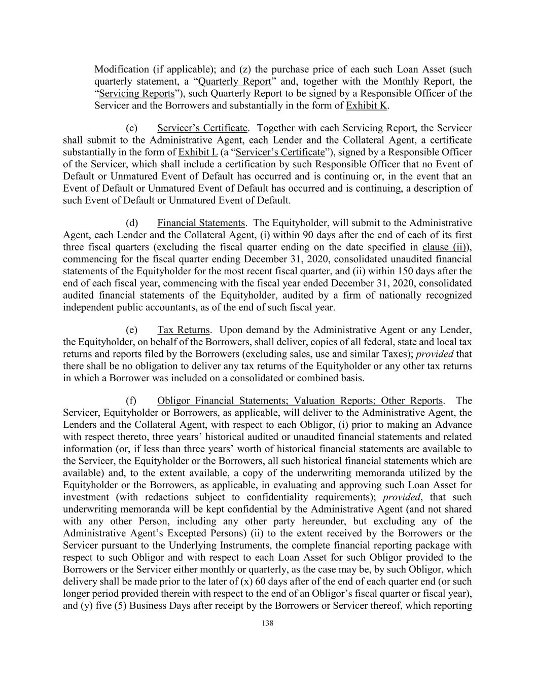 138 Modification (if applicable); and (z) the purchase price of each such Loan Asset (such quarterly statement, a “Quarterly Report” and, together with the Monthly Report, the “Servicing Reports”), such Quarterly Report to be signed by a Responsible Officer of the Servicer and the Borrowers and substantially in the form of Exhibit K. (c) Servicer’s Certificate. Together with each Servicing Report, the Servicer shall submit to the Administrative Agent, each Lender and the Collateral Agent, a certificate substantially in the form of Exhibit L (a “Servicer’s Certificate”), signed by a Responsible Officer of the Servicer, which shall include a certification by such Responsible Officer that no Event of Default or Unmatured Event of Default has occurred and is continuing or, in the event that an Event of Default or Unmatured Event of Default has occurred and is continuing, a description of such Event of Default or Unmatured Event of Default. (d) Financial Statements. The Equityholder, will submit to the Administrative Agent, each Lender and the Collateral Agent, (i) within 90 days after the end of each of its first three fiscal quarters (excluding the fiscal quarter ending on the date specified in clause (ii)), commencing for the fiscal quarter ending December 31, 2020, consolidated unaudited financial statements of the Equityholder for the most recent fiscal quarter, and (ii) within 150 days after the end of each fiscal year, commencing with the fiscal year ended December 31, 2020, consolidated audited financial statements of the Equityholder, audited by a firm of nationally recognized independent public accountants, as of the end of such fiscal year. (e) Tax Returns. Upon demand by the Administrative Agent or any Lender, the Equityholder, on behalf of the Borrowers, shall deliver, copies of all federal, state and local tax returns and reports filed by the Borrowers (excluding sales, use and similar Taxes); provided that there shall be no obligation to deliver any tax returns of the Equityholder or any other tax returns in which a Borrower was included on a consolidated or combined basis. (f) Obligor Financial Statements; Valuation Reports; Other Reports. The Servicer, Equityholder or Borrowers, as applicable, will deliver to the Administrative Agent, the Lenders and the Collateral Agent, with respect to each Obligor, (i) prior to making an Advance with respect thereto, three years’ historical audited or unaudited financial statements and related information (or, if less than three years’ worth of historical financial statements are available to the Servicer, the Equityholder or the Borrowers, all such historical financial statements which are available) and, to the extent available, a copy of the underwriting memoranda utilized by the Equityholder or the Borrowers, as applicable, in evaluating and approving such Loan Asset for investment (with redactions subject to confidentiality requirements); provided, that such underwriting memoranda will be kept confidential by the Administrative Agent (and not shared with any other Person, including any other party hereunder, but excluding any of the Administrative Agent’s Excepted Persons) (ii) to the extent received by the Borrowers or the Servicer pursuant to the Underlying Instruments, the complete financial reporting package with respect to such Obligor and with respect to each Loan Asset for such Obligor provided to the Borrowers or the Servicer either monthly or quarterly, as the case may be, by such Obligor, which delivery shall be made prior to the later of (x) 60 days after of the end of each quarter end (or such longer period provided therein with respect to the end of an Obligor’s fiscal quarter or fiscal year), and (y) five (5) Business Days after receipt by the Borrowers or Servicer thereof, which reporting