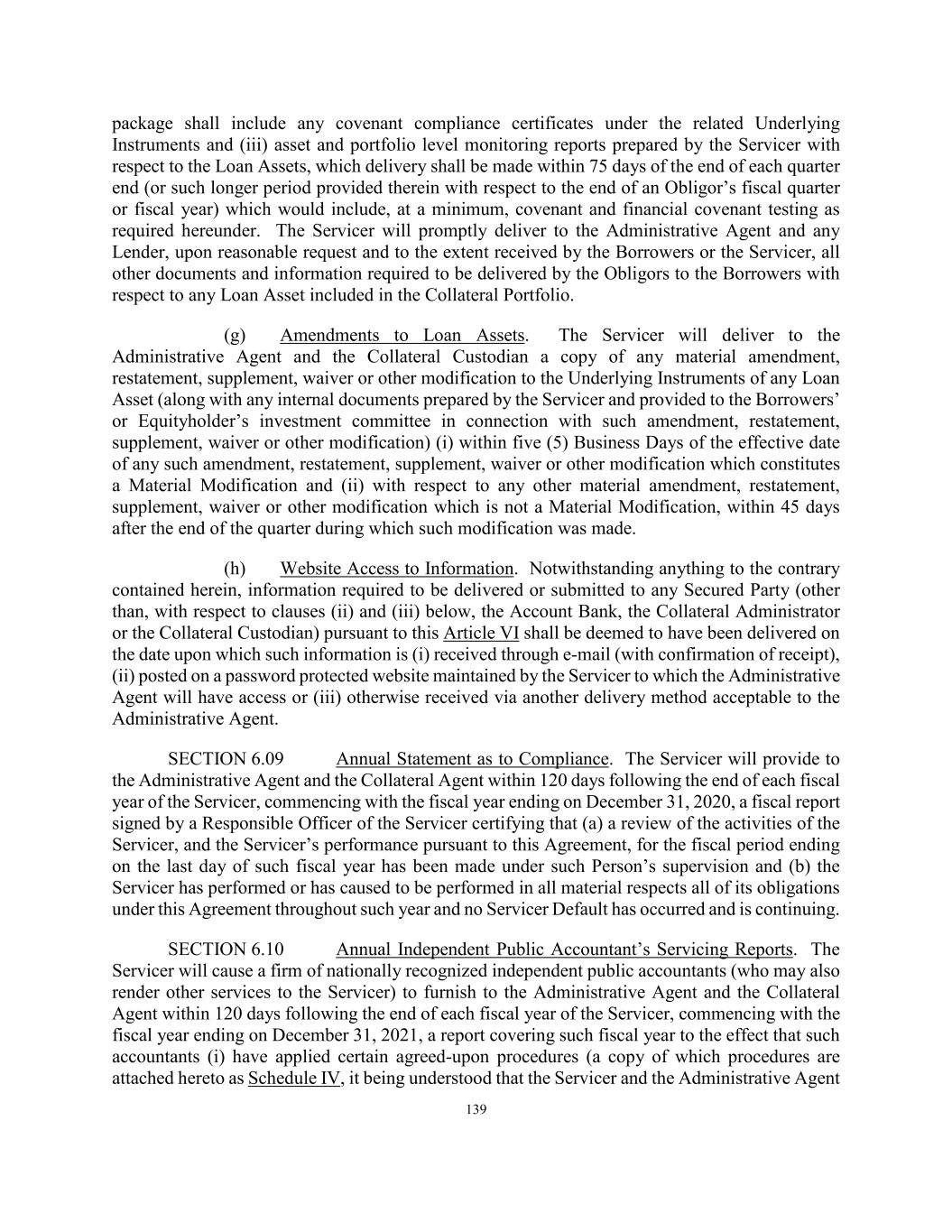 139 package shall include any covenant compliance certificates under the related Underlying Instruments and (iii) asset and portfolio level monitoring reports prepared by the Servicer with respect to the Loan Assets, which delivery shall be made within 75 days of the end of each quarter end (or such longer period provided therein with respect to the end of an Obligor’s fiscal quarter or fiscal year) which would include, at a minimum, covenant and financial covenant testing as required hereunder. The Servicer will promptly deliver to the Administrative Agent and any Lender, upon reasonable request and to the extent received by the Borrowers or the Servicer, all other documents and information required to be delivered by the Obligors to the Borrowers with respect to any Loan Asset included in the Collateral Portfolio. (g) Amendments to Loan Assets. The Servicer will deliver to the Administrative Agent and the Collateral Custodian a copy of any material amendment, restatement, supplement, waiver or other modification to the Underlying Instruments of any Loan Asset (along with any internal documents prepared by the Servicer and provided to the Borrowers’ or Equityholder’s investment committee in connection with such amendment, restatement, supplement, waiver or other modification) (i) within five (5) Business Days of the effective date of any such amendment, restatement, supplement, waiver or other modification which constitutes a Material Modification and (ii) with respect to any other material amendment, restatement, supplement, waiver or other modification which is not a Material Modification, within 45 days after the end of the quarter during which such modification was made. (h) Website Access to Information. Notwithstanding anything to the contrary contained herein, information required to be delivered or submitted to any Secured Party (other than, with respect to clauses (ii) and (iii) below, the Account Bank, the Collateral Administrator or the Collateral Custodian) pursuant to this Article VI shall be deemed to have been delivered on the date upon which such information is (i) received through e-mail (with confirmation of receipt), (ii) posted on a password protected website maintained by the Servicer to which the Administrative Agent will have access or (iii) otherwise received via another delivery method acceptable to the Administrative Agent. SECTION 6.09 Annual Statement as to Compliance. The Servicer will provide to the Administrative Agent and the Collateral Agent within 120 days following the end of each fiscal year of the Servicer, commencing with the fiscal year ending on December 31, 2020, a fiscal report signed by a Responsible Officer of the Servicer certifying that (a) a review of the activities of the Servicer, and the Servicer’s performance pursuant to this Agreement, for the fiscal period ending on the last day of such fiscal year has been made under such Person’s supervision and (b) the Servicer has performed or has caused to be performed in all material respects all of its obligations under this Agreement throughout such year and no Servicer Default has occurred and is continuing. SECTION 6.10 Annual Independent Public Accountant’s Servicing Reports. The Servicer will cause a firm of nationally recognized independent public accountants (who may also render other services to the Servicer) to furnish to the Administrative Agent and the Collateral Agent within 120 days following the end of each fiscal year of the Servicer, commencing with the fiscal year ending on December 31, 2021, a report covering such fiscal year to the effect that such accountants (i) have applied certain agreed-upon procedures (a copy of which procedures are attached hereto as Schedule IV, it being understood that the Servicer and the Administrative Agent