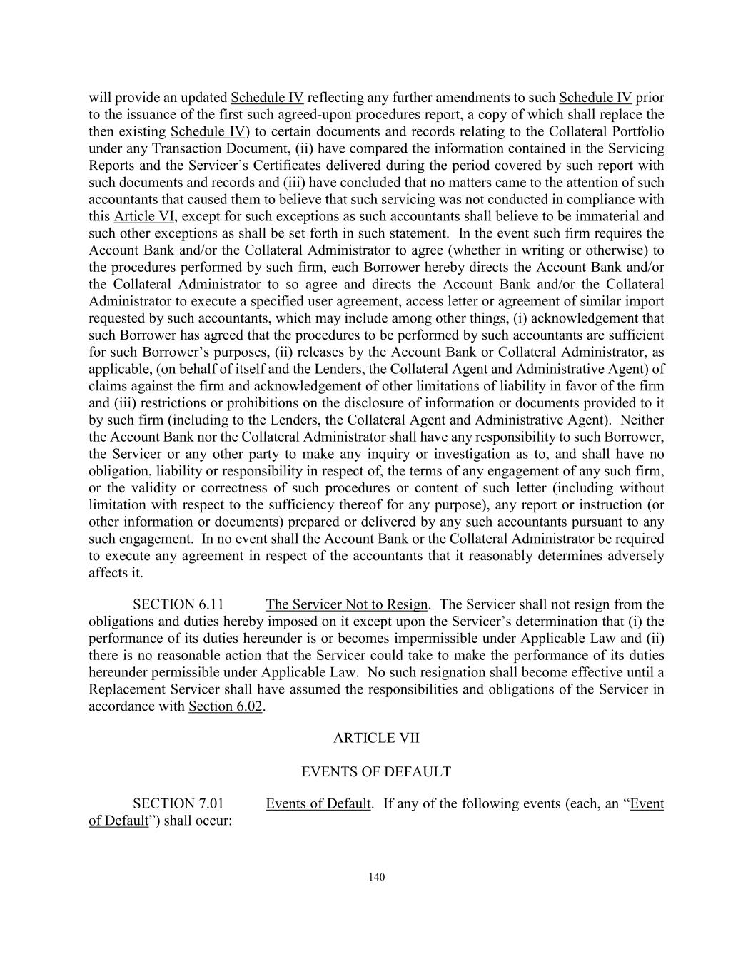 140 will provide an updated Schedule IV reflecting any further amendments to such Schedule IV prior to the issuance of the first such agreed-upon procedures report, a copy of which shall replace the then existing Schedule IV) to certain documents and records relating to the Collateral Portfolio under any Transaction Document, (ii) have compared the information contained in the Servicing Reports and the Servicer’s Certificates delivered during the period covered by such report with such documents and records and (iii) have concluded that no matters came to the attention of such accountants that caused them to believe that such servicing was not conducted in compliance with this Article VI, except for such exceptions as such accountants shall believe to be immaterial and such other exceptions as shall be set forth in such statement. In the event such firm requires the Account Bank and/or the Collateral Administrator to agree (whether in writing or otherwise) to the procedures performed by such firm, each Borrower hereby directs the Account Bank and/or the Collateral Administrator to so agree and directs the Account Bank and/or the Collateral Administrator to execute a specified user agreement, access letter or agreement of similar import requested by such accountants, which may include among other things, (i) acknowledgement that such Borrower has agreed that the procedures to be performed by such accountants are sufficient for such Borrower’s purposes, (ii) releases by the Account Bank or Collateral Administrator, as applicable, (on behalf of itself and the Lenders, the Collateral Agent and Administrative Agent) of claims against the firm and acknowledgement of other limitations of liability in favor of the firm and (iii) restrictions or prohibitions on the disclosure of information or documents provided to it by such firm (including to the Lenders, the Collateral Agent and Administrative Agent). Neither the Account Bank nor the Collateral Administrator shall have any responsibility to such Borrower, the Servicer or any other party to make any inquiry or investigation as to, and shall have no obligation, liability or responsibility in respect of, the terms of any engagement of any such firm, or the validity or correctness of such procedures or content of such letter (including without limitation with respect to the sufficiency thereof for any purpose), any report or instruction (or other information or documents) prepared or delivered by any such accountants pursuant to any such engagement. In no event shall the Account Bank or the Collateral Administrator be required to execute any agreement in respect of the accountants that it reasonably determines adversely affects it. SECTION 6.11 The Servicer Not to Resign. The Servicer shall not resign from the obligations and duties hereby imposed on it except upon the Servicer’s determination that (i) the performance of its duties hereunder is or becomes impermissible under Applicable Law and (ii) there is no reasonable action that the Servicer could take to make the performance of its duties hereunder permissible under Applicable Law. No such resignation shall become effective until a Replacement Servicer shall have assumed the responsibilities and obligations of the Servicer in accordance with Section 6.02. ARTICLE VII EVENTS OF DEFAULT SECTION 7.01 Events of Default. If any of the following events (each, an “Event of Default”) shall occur: