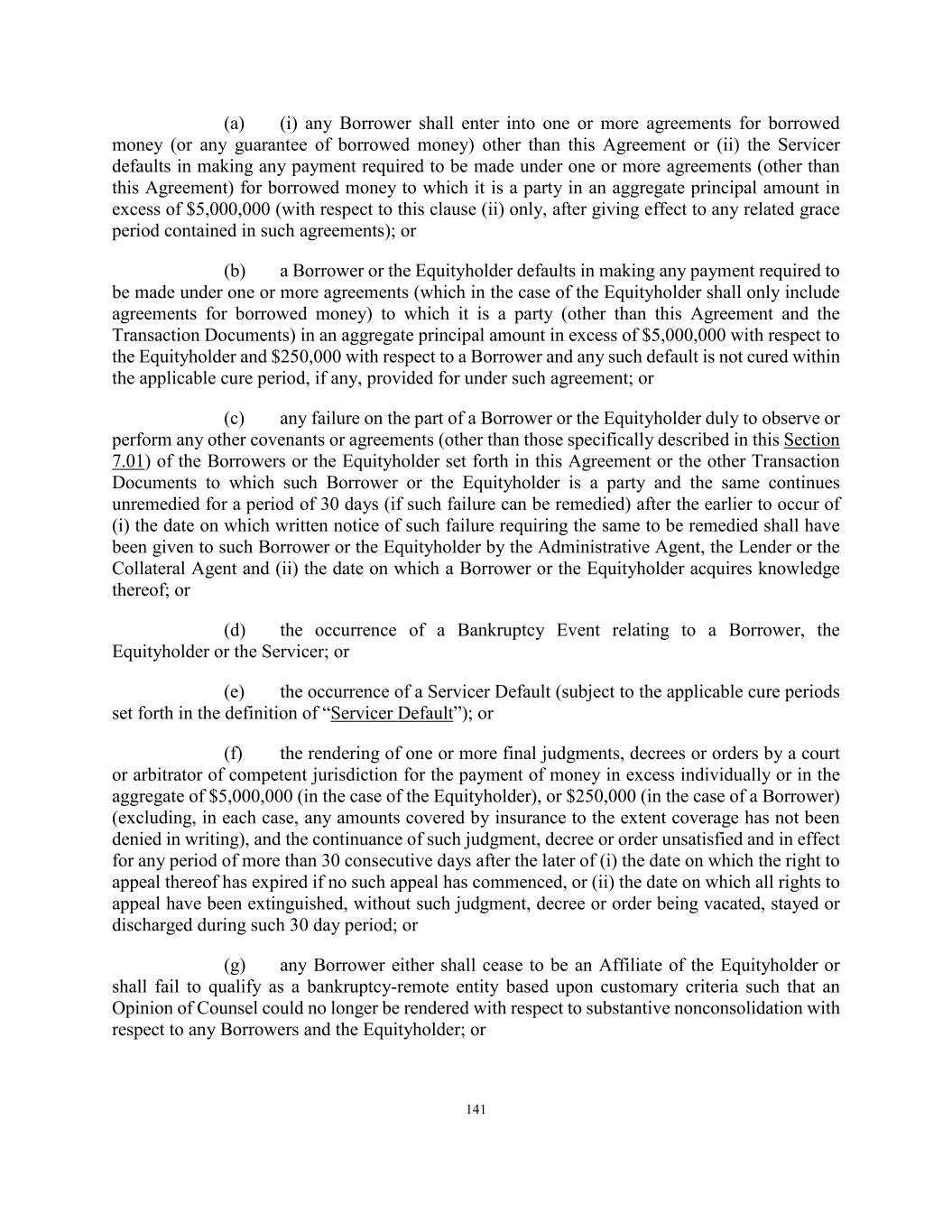 141 (a) (i) any Borrower shall enter into one or more agreements for borrowed money (or any guarantee of borrowed money) other than this Agreement or (ii) the Servicer defaults in making any payment required to be made under one or more agreements (other than this Agreement) for borrowed money to which it is a party in an aggregate principal amount in excess of $5,000,000 (with respect to this clause (ii) only, after giving effect to any related grace period contained in such agreements); or (b) a Borrower or the Equityholder defaults in making any payment required to be made under one or more agreements (which in the case of the Equityholder shall only include agreements for borrowed money) to which it is a party (other than this Agreement and the Transaction Documents) in an aggregate principal amount in excess of $5,000,000 with respect to the Equityholder and $250,000 with respect to a Borrower and any such default is not cured within the applicable cure period, if any, provided for under such agreement; or (c) any failure on the part of a Borrower or the Equityholder duly to observe or perform any other covenants or agreements (other than those specifically described in this Section 7.01) of the Borrowers or the Equityholder set forth in this Agreement or the other Transaction Documents to which such Borrower or the Equityholder is a party and the same continues unremedied for a period of 30 days (if such failure can be remedied) after the earlier to occur of (i) the date on which written notice of such failure requiring the same to be remedied shall have been given to such Borrower or the Equityholder by the Administrative Agent, the Lender or the Collateral Agent and (ii) the date on which a Borrower or the Equityholder acquires knowledge thereof; or (d) the occurrence of a Bankruptcy Event relating to a Borrower, the Equityholder or the Servicer; or (e) the occurrence of a Servicer Default (subject to the applicable cure periods set forth in the definition of “Servicer Default”); or (f) the rendering of one or more final judgments, decrees or orders by a court or arbitrator of competent jurisdiction for the payment of money in excess individually or in the aggregate of $5,000,000 (in the case of the Equityholder), or $250,000 (in the case of a Borrower) (excluding, in each case, any amounts covered by insurance to the extent coverage has not been denied in writing), and the continuance of such judgment, decree or order unsatisfied and in effect for any period of more than 30 consecutive days after the later of (i) the date on which the right to appeal thereof has expired if no such appeal has commenced, or (ii) the date on which all rights to appeal have been extinguished, without such judgment, decree or order being vacated, stayed or discharged during such 30 day period; or (g) any Borrower either shall cease to be an Affiliate of the Equityholder or shall fail to qualify as a bankruptcy-remote entity based upon customary criteria such that an Opinion of Counsel could no longer be rendered with respect to substantive nonconsolidation with respect to any Borrowers and the Equityholder; or