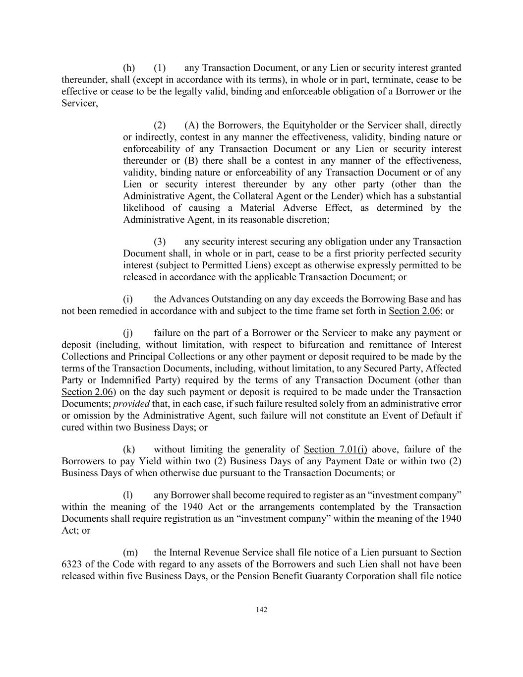 142 (h) (1) any Transaction Document, or any Lien or security interest granted thereunder, shall (except in accordance with its terms), in whole or in part, terminate, cease to be effective or cease to be the legally valid, binding and enforceable obligation of a Borrower or the Servicer, (2) (A) the Borrowers, the Equityholder or the Servicer shall, directly or indirectly, contest in any manner the effectiveness, validity, binding nature or enforceability of any Transaction Document or any Lien or security interest thereunder or (B) there shall be a contest in any manner of the effectiveness, validity, binding nature or enforceability of any Transaction Document or of any Lien or security interest thereunder by any other party (other than the Administrative Agent, the Collateral Agent or the Lender) which has a substantial likelihood of causing a Material Adverse Effect, as determined by the Administrative Agent, in its reasonable discretion; (3) any security interest securing any obligation under any Transaction Document shall, in whole or in part, cease to be a first priority perfected security interest (subject to Permitted Liens) except as otherwise expressly permitted to be released in accordance with the applicable Transaction Document; or (i) the Advances Outstanding on any day exceeds the Borrowing Base and has not been remedied in accordance with and subject to the time frame set forth in Section 2.06; or (j) failure on the part of a Borrower or the Servicer to make any payment or deposit (including, without limitation, with respect to bifurcation and remittance of Interest Collections and Principal Collections or any other payment or deposit required to be made by the terms of the Transaction Documents, including, without limitation, to any Secured Party, Affected Party or Indemnified Party) required by the terms of any Transaction Document (other than Section 2.06) on the day such payment or deposit is required to be made under the Transaction Documents; provided that, in each case, if such failure resulted solely from an administrative error or omission by the Administrative Agent, such failure will not constitute an Event of Default if cured within two Business Days; or (k) without limiting the generality of Section 7.01(i) above, failure of the Borrowers to pay Yield within two (2) Business Days of any Payment Date or within two (2) Business Days of when otherwise due pursuant to the Transaction Documents; or (l) any Borrower shall become required to register as an “investment company” within the meaning of the 1940 Act or the arrangements contemplated by the Transaction Documents shall require registration as an “investment company” within the meaning of the 1940 Act; or (m) the Internal Revenue Service shall file notice of a Lien pursuant to Section 6323 of the Code with regard to any assets of the Borrowers and such Lien shall not have been released within five Business Days, or the Pension Benefit Guaranty Corporation shall file notice