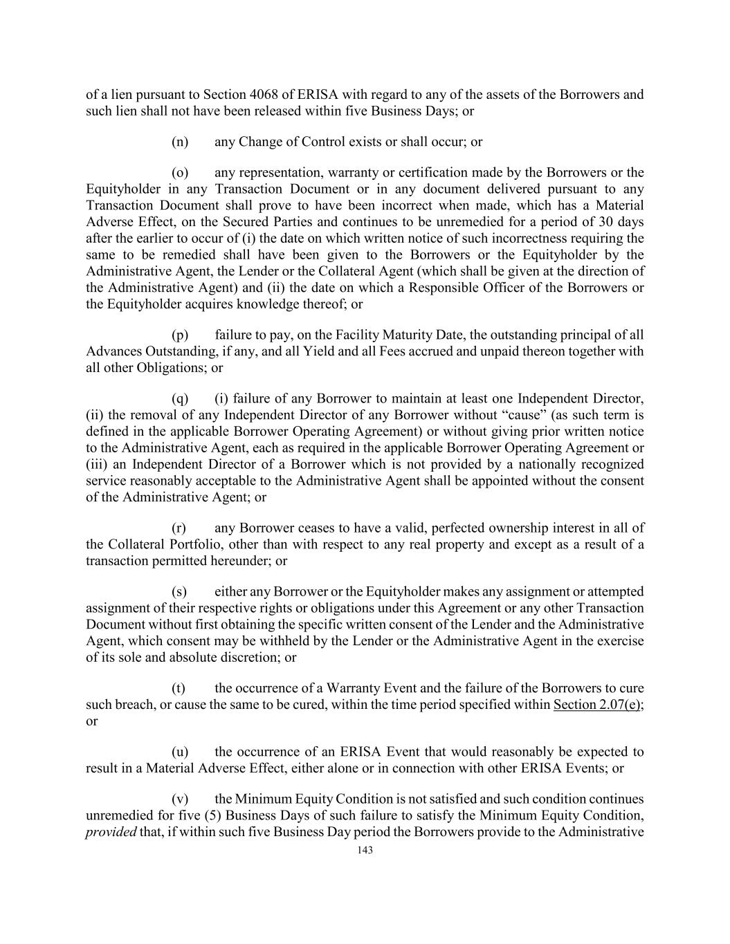 143 of a lien pursuant to Section 4068 of ERISA with regard to any of the assets of the Borrowers and such lien shall not have been released within five Business Days; or (n) any Change of Control exists or shall occur; or (o) any representation, warranty or certification made by the Borrowers or the Equityholder in any Transaction Document or in any document delivered pursuant to any Transaction Document shall prove to have been incorrect when made, which has a Material Adverse Effect, on the Secured Parties and continues to be unremedied for a period of 30 days after the earlier to occur of (i) the date on which written notice of such incorrectness requiring the same to be remedied shall have been given to the Borrowers or the Equityholder by the Administrative Agent, the Lender or the Collateral Agent (which shall be given at the direction of the Administrative Agent) and (ii) the date on which a Responsible Officer of the Borrowers or the Equityholder acquires knowledge thereof; or (p) failure to pay, on the Facility Maturity Date, the outstanding principal of all Advances Outstanding, if any, and all Yield and all Fees accrued and unpaid thereon together with all other Obligations; or (q) (i) failure of any Borrower to maintain at least one Independent Director, (ii) the removal of any Independent Director of any Borrower without “cause” (as such term is defined in the applicable Borrower Operating Agreement) or without giving prior written notice to the Administrative Agent, each as required in the applicable Borrower Operating Agreement or (iii) an Independent Director of a Borrower which is not provided by a nationally recognized service reasonably acceptable to the Administrative Agent shall be appointed without the consent of the Administrative Agent; or (r) any Borrower ceases to have a valid, perfected ownership interest in all of the Collateral Portfolio, other than with respect to any real property and except as a result of a transaction permitted hereunder; or (s) either any Borrower or the Equityholder makes any assignment or attempted assignment of their respective rights or obligations under this Agreement or any other Transaction Document without first obtaining the specific written consent of the Lender and the Administrative Agent, which consent may be withheld by the Lender or the Administrative Agent in the exercise of its sole and absolute discretion; or (t) the occurrence of a Warranty Event and the failure of the Borrowers to cure such breach, or cause the same to be cured, within the time period specified within Section 2.07(e); or (u) the occurrence of an ERISA Event that would reasonably be expected to result in a Material Adverse Effect, either alone or in connection with other ERISA Events; or (v) the Minimum Equity Condition is not satisfied and such condition continues unremedied for five (5) Business Days of such failure to satisfy the Minimum Equity Condition, provided that, if within such five Business Day period the Borrowers provide to the Administrative