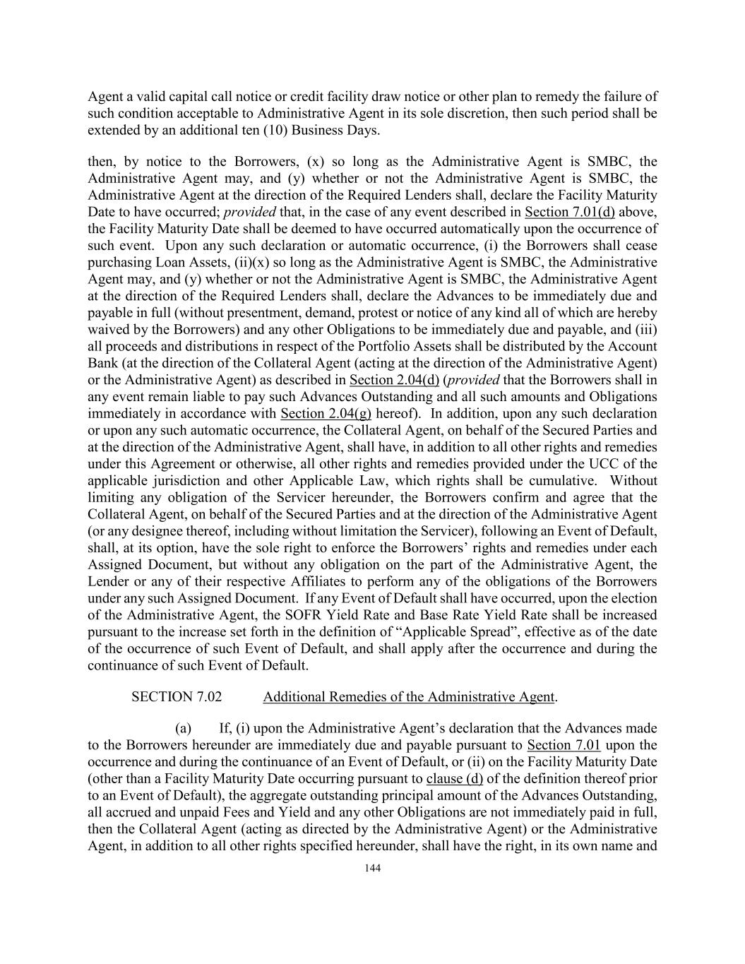 144 Agent a valid capital call notice or credit facility draw notice or other plan to remedy the failure of such condition acceptable to Administrative Agent in its sole discretion, then such period shall be extended by an additional ten (10) Business Days. then, by notice to the Borrowers, (x) so long as the Administrative Agent is SMBC, the Administrative Agent may, and (y) whether or not the Administrative Agent is SMBC, the Administrative Agent at the direction of the Required Lenders shall, declare the Facility Maturity Date to have occurred; provided that, in the case of any event described in Section 7.01(d) above, the Facility Maturity Date shall be deemed to have occurred automatically upon the occurrence of such event. Upon any such declaration or automatic occurrence, (i) the Borrowers shall cease purchasing Loan Assets, (ii)(x) so long as the Administrative Agent is SMBC, the Administrative Agent may, and (y) whether or not the Administrative Agent is SMBC, the Administrative Agent at the direction of the Required Lenders shall, declare the Advances to be immediately due and payable in full (without presentment, demand, protest or notice of any kind all of which are hereby waived by the Borrowers) and any other Obligations to be immediately due and payable, and (iii) all proceeds and distributions in respect of the Portfolio Assets shall be distributed by the Account Bank (at the direction of the Collateral Agent (acting at the direction of the Administrative Agent) or the Administrative Agent) as described in Section 2.04(d) (provided that the Borrowers shall in any event remain liable to pay such Advances Outstanding and all such amounts and Obligations immediately in accordance with Section 2.04(g) hereof). In addition, upon any such declaration or upon any such automatic occurrence, the Collateral Agent, on behalf of the Secured Parties and at the direction of the Administrative Agent, shall have, in addition to all other rights and remedies under this Agreement or otherwise, all other rights and remedies provided under the UCC of the applicable jurisdiction and other Applicable Law, which rights shall be cumulative. Without limiting any obligation of the Servicer hereunder, the Borrowers confirm and agree that the Collateral Agent, on behalf of the Secured Parties and at the direction of the Administrative Agent (or any designee thereof, including without limitation the Servicer), following an Event of Default, shall, at its option, have the sole right to enforce the Borrowers’ rights and remedies under each Assigned Document, but without any obligation on the part of the Administrative Agent, the Lender or any of their respective Affiliates to perform any of the obligations of the Borrowers under any such Assigned Document. If any Event of Default shall have occurred, upon the election of the Administrative Agent, the SOFR Yield Rate and Base Rate Yield Rate shall be increased pursuant to the increase set forth in the definition of “Applicable Spread”, effective as of the date of the occurrence of such Event of Default, and shall apply after the occurrence and during the continuance of such Event of Default. SECTION 7.02 Additional Remedies of the Administrative Agent. (a) If, (i) upon the Administrative Agent’s declaration that the Advances made to the Borrowers hereunder are immediately due and payable pursuant to Section 7.01 upon the occurrence and during the continuance of an Event of Default, or (ii) on the Facility Maturity Date (other than a Facility Maturity Date occurring pursuant to clause (d) of the definition thereof prior to an Event of Default), the aggregate outstanding principal amount of the Advances Outstanding, all accrued and unpaid Fees and Yield and any other Obligations are not immediately paid in full, then the Collateral Agent (acting as directed by the Administrative Agent) or the Administrative Agent, in addition to all other rights specified hereunder, shall have the right, in its own name and