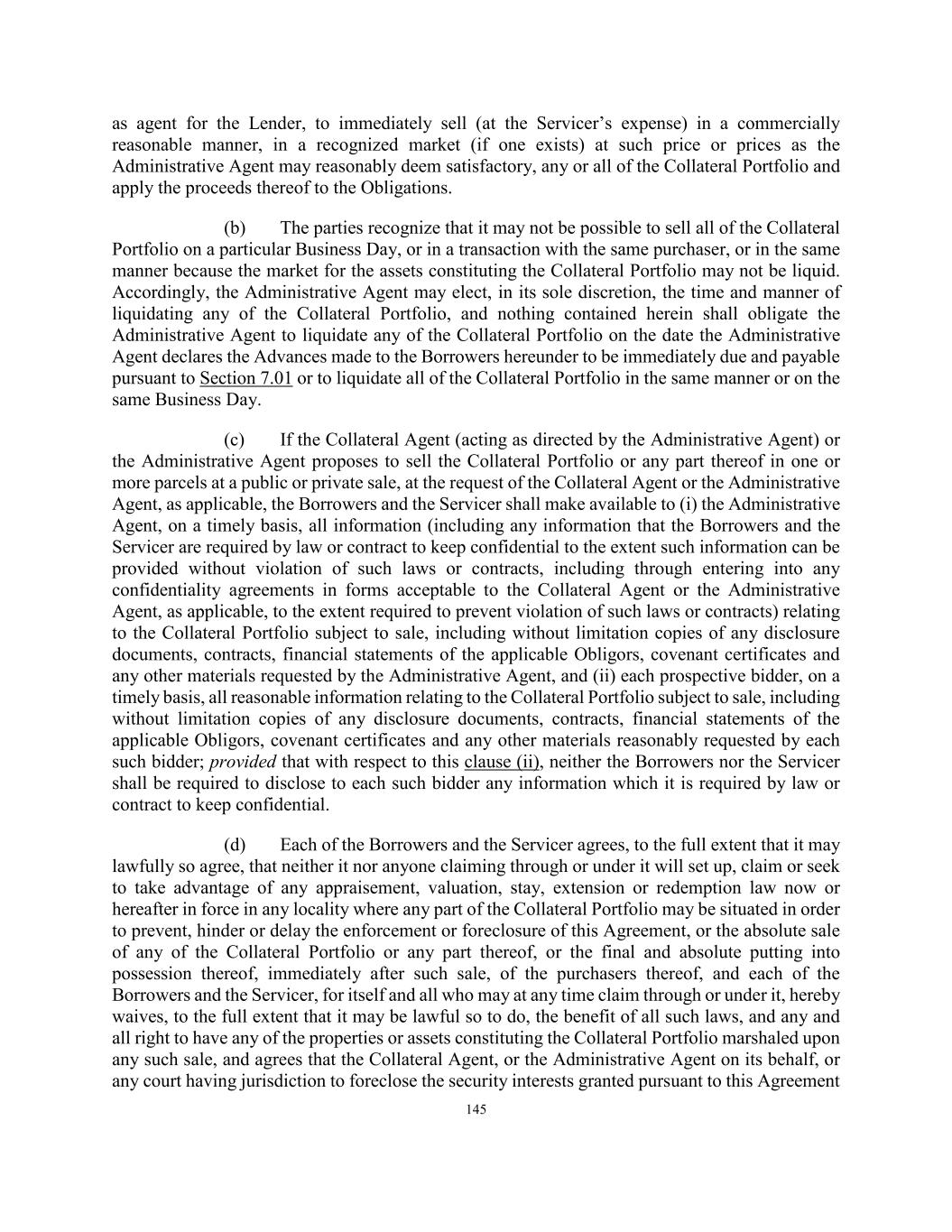 145 as agent for the Lender, to immediately sell (at the Servicer’s expense) in a commercially reasonable manner, in a recognized market (if one exists) at such price or prices as the Administrative Agent may reasonably deem satisfactory, any or all of the Collateral Portfolio and apply the proceeds thereof to the Obligations. (b) The parties recognize that it may not be possible to sell all of the Collateral Portfolio on a particular Business Day, or in a transaction with the same purchaser, or in the same manner because the market for the assets constituting the Collateral Portfolio may not be liquid. Accordingly, the Administrative Agent may elect, in its sole discretion, the time and manner of liquidating any of the Collateral Portfolio, and nothing contained herein shall obligate the Administrative Agent to liquidate any of the Collateral Portfolio on the date the Administrative Agent declares the Advances made to the Borrowers hereunder to be immediately due and payable pursuant to Section 7.01 or to liquidate all of the Collateral Portfolio in the same manner or on the same Business Day. (c) If the Collateral Agent (acting as directed by the Administrative Agent) or the Administrative Agent proposes to sell the Collateral Portfolio or any part thereof in one or more parcels at a public or private sale, at the request of the Collateral Agent or the Administrative Agent, as applicable, the Borrowers and the Servicer shall make available to (i) the Administrative Agent, on a timely basis, all information (including any information that the Borrowers and the Servicer are required by law or contract to keep confidential to the extent such information can be provided without violation of such laws or contracts, including through entering into any confidentiality agreements in forms acceptable to the Collateral Agent or the Administrative Agent, as applicable, to the extent required to prevent violation of such laws or contracts) relating to the Collateral Portfolio subject to sale, including without limitation copies of any disclosure documents, contracts, financial statements of the applicable Obligors, covenant certificates and any other materials requested by the Administrative Agent, and (ii) each prospective bidder, on a timely basis, all reasonable information relating to the Collateral Portfolio subject to sale, including without limitation copies of any disclosure documents, contracts, financial statements of the applicable Obligors, covenant certificates and any other materials reasonably requested by each such bidder; provided that with respect to this clause (ii), neither the Borrowers nor the Servicer shall be required to disclose to each such bidder any information which it is required by law or contract to keep confidential. (d) Each of the Borrowers and the Servicer agrees, to the full extent that it may lawfully so agree, that neither it nor anyone claiming through or under it will set up, claim or seek to take advantage of any appraisement, valuation, stay, extension or redemption law now or hereafter in force in any locality where any part of the Collateral Portfolio may be situated in order to prevent, hinder or delay the enforcement or foreclosure of this Agreement, or the absolute sale of any of the Collateral Portfolio or any part thereof, or the final and absolute putting into possession thereof, immediately after such sale, of the purchasers thereof, and each of the Borrowers and the Servicer, for itself and all who may at any time claim through or under it, hereby waives, to the full extent that it may be lawful so to do, the benefit of all such laws, and any and all right to have any of the properties or assets constituting the Collateral Portfolio marshaled upon any such sale, and agrees that the Collateral Agent, or the Administrative Agent on its behalf, or any court having jurisdiction to foreclose the security interests granted pursuant to this Agreement