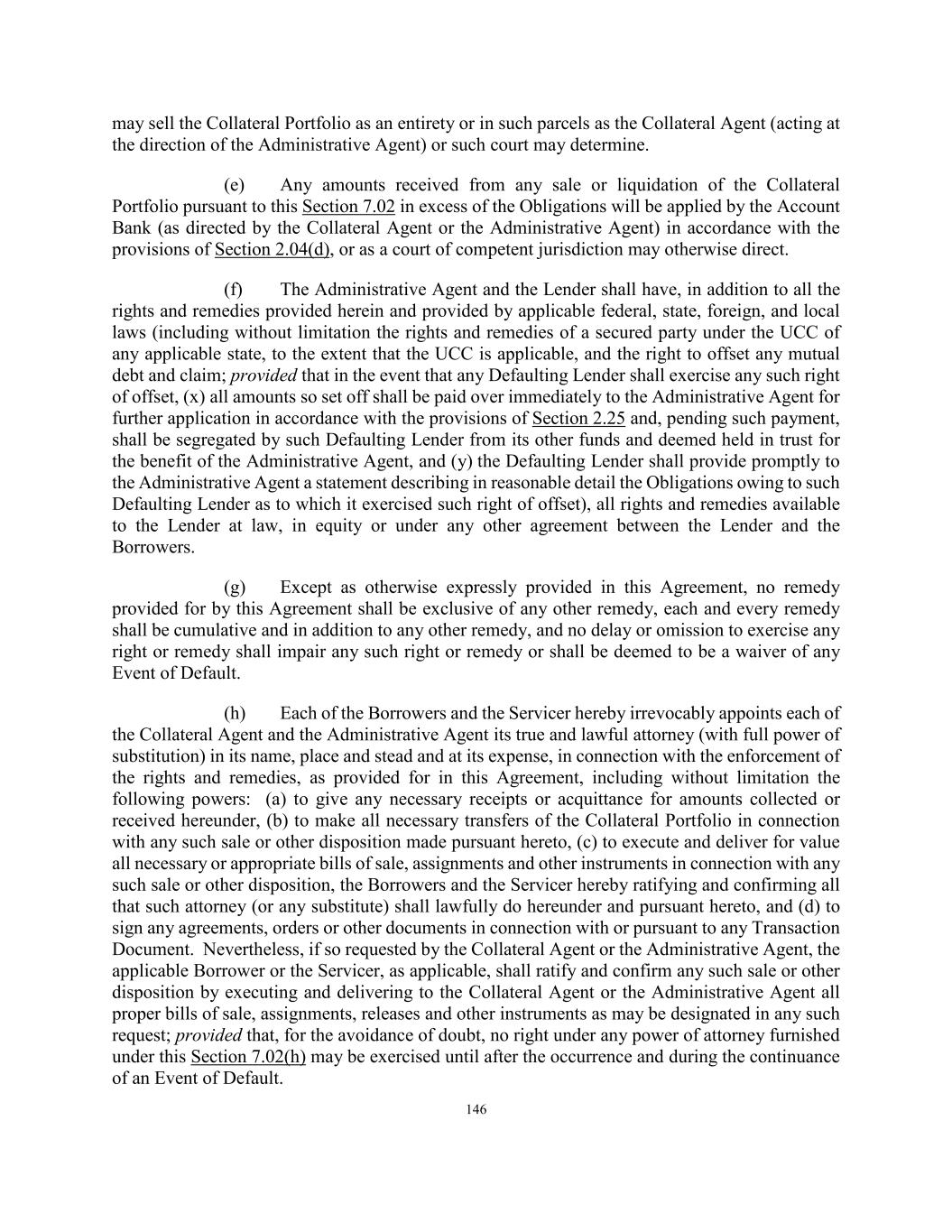 146 may sell the Collateral Portfolio as an entirety or in such parcels as the Collateral Agent (acting at the direction of the Administrative Agent) or such court may determine. (e) Any amounts received from any sale or liquidation of the Collateral Portfolio pursuant to this Section 7.02 in excess of the Obligations will be applied by the Account Bank (as directed by the Collateral Agent or the Administrative Agent) in accordance with the provisions of Section 2.04(d), or as a court of competent jurisdiction may otherwise direct. (f) The Administrative Agent and the Lender shall have, in addition to all the rights and remedies provided herein and provided by applicable federal, state, foreign, and local laws (including without limitation the rights and remedies of a secured party under the UCC of any applicable state, to the extent that the UCC is applicable, and the right to offset any mutual debt and claim; provided that in the event that any Defaulting Lender shall exercise any such right of offset, (x) all amounts so set off shall be paid over immediately to the Administrative Agent for further application in accordance with the provisions of Section 2.25 and, pending such payment, shall be segregated by such Defaulting Lender from its other funds and deemed held in trust for the benefit of the Administrative Agent, and (y) the Defaulting Lender shall provide promptly to the Administrative Agent a statement describing in reasonable detail the Obligations owing to such Defaulting Lender as to which it exercised such right of offset), all rights and remedies available to the Lender at law, in equity or under any other agreement between the Lender and the Borrowers. (g) Except as otherwise expressly provided in this Agreement, no remedy provided for by this Agreement shall be exclusive of any other remedy, each and every remedy shall be cumulative and in addition to any other remedy, and no delay or omission to exercise any right or remedy shall impair any such right or remedy or shall be deemed to be a waiver of any Event of Default. (h) Each of the Borrowers and the Servicer hereby irrevocably appoints each of the Collateral Agent and the Administrative Agent its true and lawful attorney (with full power of substitution) in its name, place and stead and at its expense, in connection with the enforcement of the rights and remedies, as provided for in this Agreement, including without limitation the following powers: (a) to give any necessary receipts or acquittance for amounts collected or received hereunder, (b) to make all necessary transfers of the Collateral Portfolio in connection with any such sale or other disposition made pursuant hereto, (c) to execute and deliver for value all necessary or appropriate bills of sale, assignments and other instruments in connection with any such sale or other disposition, the Borrowers and the Servicer hereby ratifying and confirming all that such attorney (or any substitute) shall lawfully do hereunder and pursuant hereto, and (d) to sign any agreements, orders or other documents in connection with or pursuant to any Transaction Document. Nevertheless, if so requested by the Collateral Agent or the Administrative Agent, the applicable Borrower or the Servicer, as applicable, shall ratify and confirm any such sale or other disposition by executing and delivering to the Collateral Agent or the Administrative Agent all proper bills of sale, assignments, releases and other instruments as may be designated in any such request; provided that, for the avoidance of doubt, no right under any power of attorney furnished under this Section 7.02(h) may be exercised until after the occurrence and during the continuance of an Event of Default.