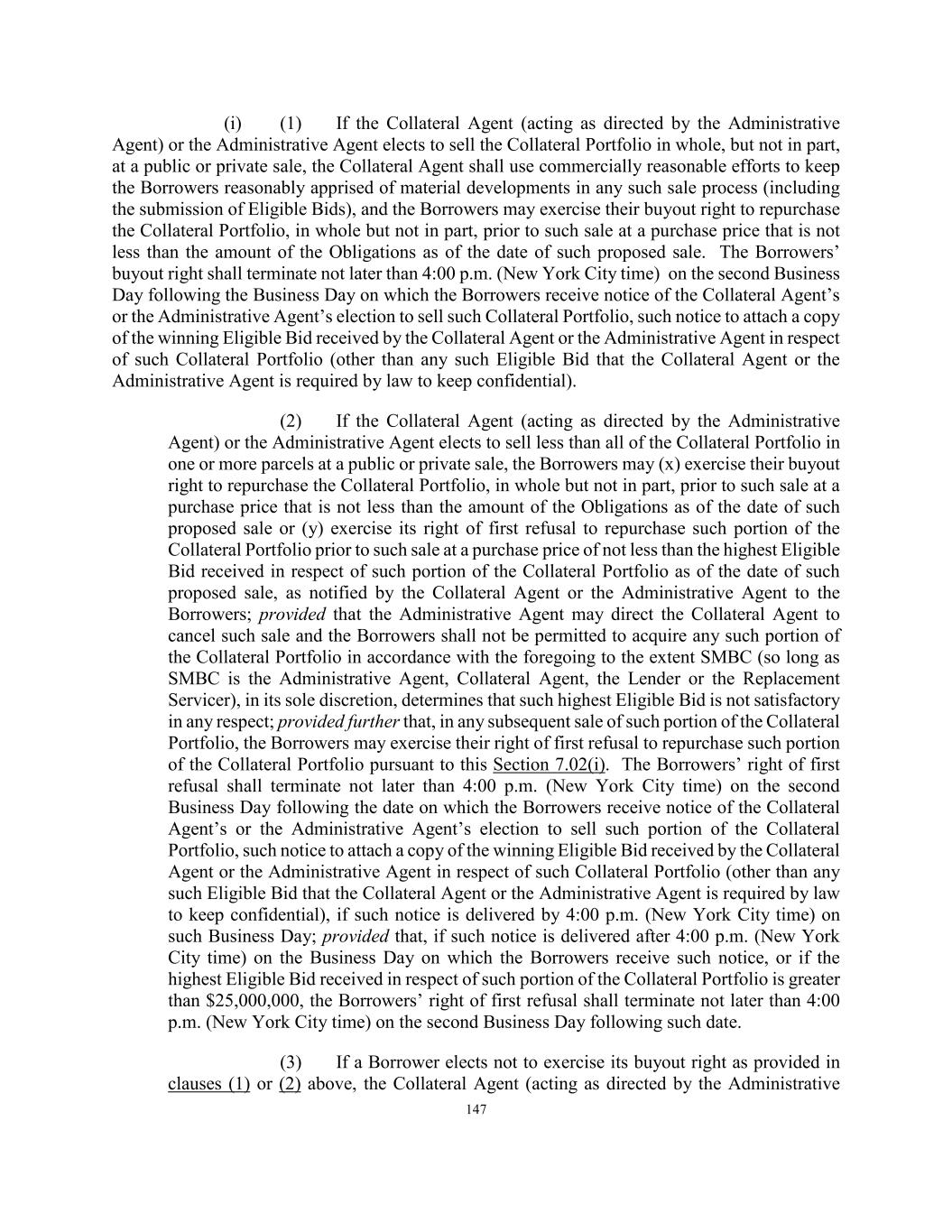 147 (i) (1) If the Collateral Agent (acting as directed by the Administrative Agent) or the Administrative Agent elects to sell the Collateral Portfolio in whole, but not in part, at a public or private sale, the Collateral Agent shall use commercially reasonable efforts to keep the Borrowers reasonably apprised of material developments in any such sale process (including the submission of Eligible Bids), and the Borrowers may exercise their buyout right to repurchase the Collateral Portfolio, in whole but not in part, prior to such sale at a purchase price that is not less than the amount of the Obligations as of the date of such proposed sale. The Borrowers’ buyout right shall terminate not later than 4:00 p.m. (New York City time) on the second Business Day following the Business Day on which the Borrowers receive notice of the Collateral Agent’s or the Administrative Agent’s election to sell such Collateral Portfolio, such notice to attach a copy of the winning Eligible Bid received by the Collateral Agent or the Administrative Agent in respect of such Collateral Portfolio (other than any such Eligible Bid that the Collateral Agent or the Administrative Agent is required by law to keep confidential). (2) If the Collateral Agent (acting as directed by the Administrative Agent) or the Administrative Agent elects to sell less than all of the Collateral Portfolio in one or more parcels at a public or private sale, the Borrowers may (x) exercise their buyout right to repurchase the Collateral Portfolio, in whole but not in part, prior to such sale at a purchase price that is not less than the amount of the Obligations as of the date of such proposed sale or (y) exercise its right of first refusal to repurchase such portion of the Collateral Portfolio prior to such sale at a purchase price of not less than the highest Eligible Bid received in respect of such portion of the Collateral Portfolio as of the date of such proposed sale, as notified by the Collateral Agent or the Administrative Agent to the Borrowers; provided that the Administrative Agent may direct the Collateral Agent to cancel such sale and the Borrowers shall not be permitted to acquire any such portion of the Collateral Portfolio in accordance with the foregoing to the extent SMBC (so long as SMBC is the Administrative Agent, Collateral Agent, the Lender or the Replacement Servicer), in its sole discretion, determines that such highest Eligible Bid is not satisfactory in any respect; provided further that, in any subsequent sale of such portion of the Collateral Portfolio, the Borrowers may exercise their right of first refusal to repurchase such portion of the Collateral Portfolio pursuant to this Section 7.02(i). The Borrowers’ right of first refusal shall terminate not later than 4:00 p.m. (New York City time) on the second Business Day following the date on which the Borrowers receive notice of the Collateral Agent’s or the Administrative Agent’s election to sell such portion of the Collateral Portfolio, such notice to attach a copy of the winning Eligible Bid received by the Collateral Agent or the Administrative Agent in respect of such Collateral Portfolio (other than any such Eligible Bid that the Collateral Agent or the Administrative Agent is required by law to keep confidential), if such notice is delivered by 4:00 p.m. (New York City time) on such Business Day; provided that, if such notice is delivered after 4:00 p.m. (New York City time) on the Business Day on which the Borrowers receive such notice, or if the highest Eligible Bid received in respect of such portion of the Collateral Portfolio is greater than $25,000,000, the Borrowers’ right of first refusal shall terminate not later than 4:00 p.m. (New York City time) on the second Business Day following such date. (3) If a Borrower elects not to exercise its buyout right as provided in clauses (1) or (2) above, the Collateral Agent (acting as directed by the Administrative