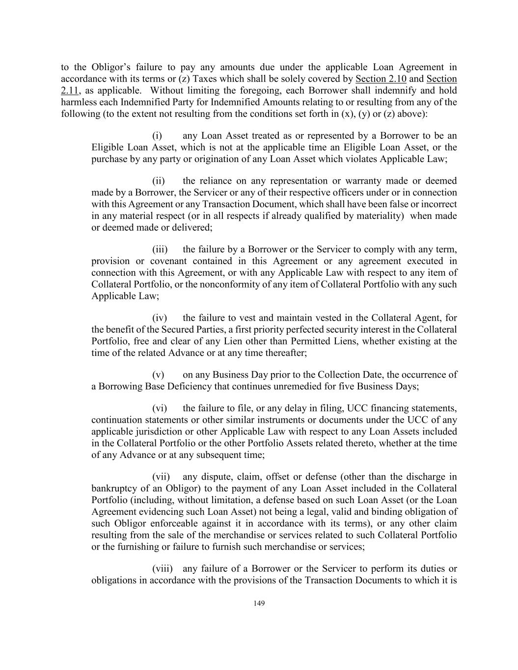 149 to the Obligor’s failure to pay any amounts due under the applicable Loan Agreement in accordance with its terms or (z) Taxes which shall be solely covered by Section 2.10 and Section 2.11, as applicable. Without limiting the foregoing, each Borrower shall indemnify and hold harmless each Indemnified Party for Indemnified Amounts relating to or resulting from any of the following (to the extent not resulting from the conditions set forth in (x), (y) or (z) above): (i) any Loan Asset treated as or represented by a Borrower to be an Eligible Loan Asset, which is not at the applicable time an Eligible Loan Asset, or the purchase by any party or origination of any Loan Asset which violates Applicable Law; (ii) the reliance on any representation or warranty made or deemed made by a Borrower, the Servicer or any of their respective officers under or in connection with this Agreement or any Transaction Document, which shall have been false or incorrect in any material respect (or in all respects if already qualified by materiality) when made or deemed made or delivered; (iii) the failure by a Borrower or the Servicer to comply with any term, provision or covenant contained in this Agreement or any agreement executed in connection with this Agreement, or with any Applicable Law with respect to any item of Collateral Portfolio, or the nonconformity of any item of Collateral Portfolio with any such Applicable Law; (iv) the failure to vest and maintain vested in the Collateral Agent, for the benefit of the Secured Parties, a first priority perfected security interest in the Collateral Portfolio, free and clear of any Lien other than Permitted Liens, whether existing at the time of the related Advance or at any time thereafter; (v) on any Business Day prior to the Collection Date, the occurrence of a Borrowing Base Deficiency that continues unremedied for five Business Days; (vi) the failure to file, or any delay in filing, UCC financing statements, continuation statements or other similar instruments or documents under the UCC of any applicable jurisdiction or other Applicable Law with respect to any Loan Assets included in the Collateral Portfolio or the other Portfolio Assets related thereto, whether at the time of any Advance or at any subsequent time; (vii) any dispute, claim, offset or defense (other than the discharge in bankruptcy of an Obligor) to the payment of any Loan Asset included in the Collateral Portfolio (including, without limitation, a defense based on such Loan Asset (or the Loan Agreement evidencing such Loan Asset) not being a legal, valid and binding obligation of such Obligor enforceable against it in accordance with its terms), or any other claim resulting from the sale of the merchandise or services related to such Collateral Portfolio or the furnishing or failure to furnish such merchandise or services; (viii) any failure of a Borrower or the Servicer to perform its duties or obligations in accordance with the provisions of the Transaction Documents to which it is