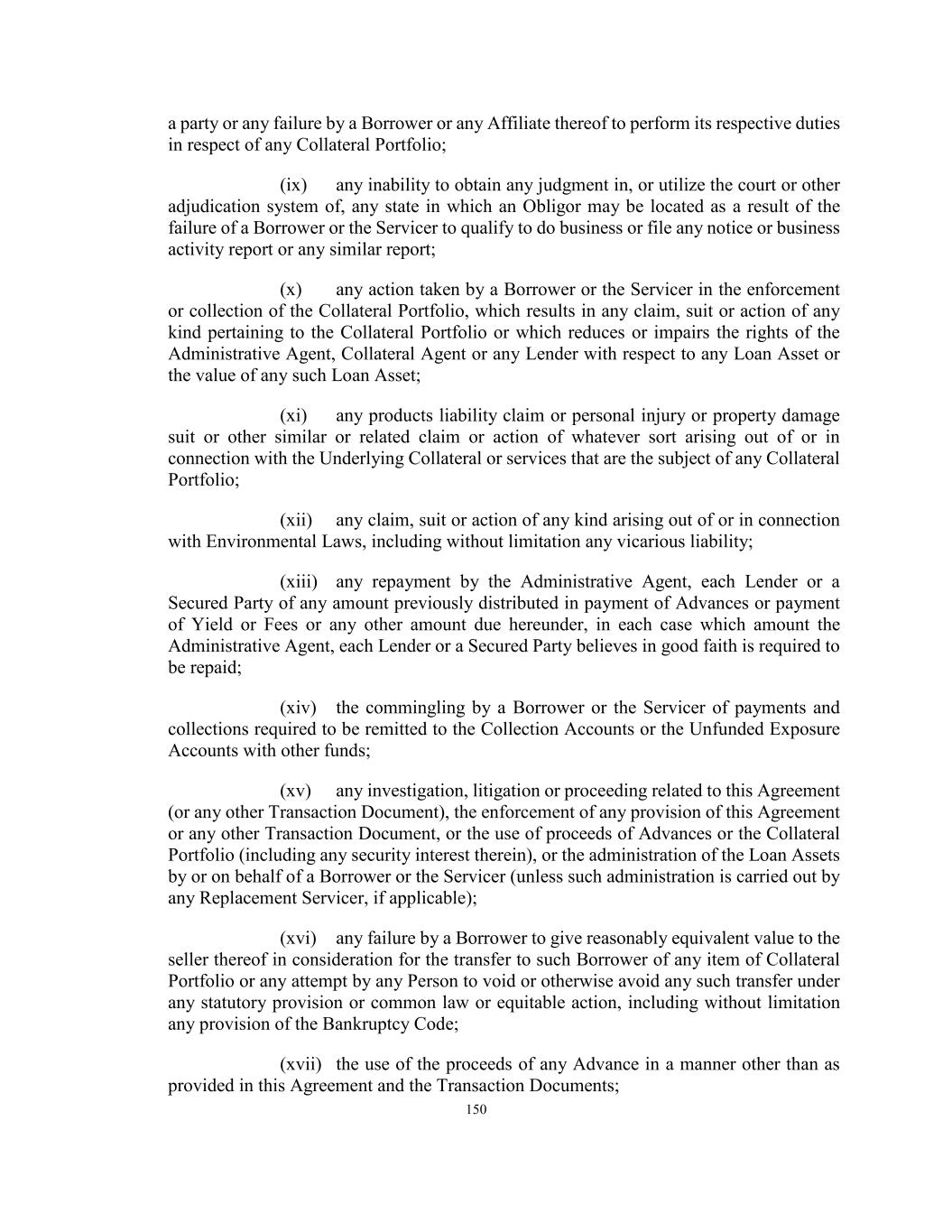 150 a party or any failure by a Borrower or any Affiliate thereof to perform its respective duties in respect of any Collateral Portfolio; (ix) any inability to obtain any judgment in, or utilize the court or other adjudication system of, any state in which an Obligor may be located as a result of the failure of a Borrower or the Servicer to qualify to do business or file any notice or business activity report or any similar report; (x) any action taken by a Borrower or the Servicer in the enforcement or collection of the Collateral Portfolio, which results in any claim, suit or action of any kind pertaining to the Collateral Portfolio or which reduces or impairs the rights of the Administrative Agent, Collateral Agent or any Lender with respect to any Loan Asset or the value of any such Loan Asset; (xi) any products liability claim or personal injury or property damage suit or other similar or related claim or action of whatever sort arising out of or in connection with the Underlying Collateral or services that are the subject of any Collateral Portfolio; (xii) any claim, suit or action of any kind arising out of or in connection with Environmental Laws, including without limitation any vicarious liability; (xiii) any repayment by the Administrative Agent, each Lender or a Secured Party of any amount previously distributed in payment of Advances or payment of Yield or Fees or any other amount due hereunder, in each case which amount the Administrative Agent, each Lender or a Secured Party believes in good faith is required to be repaid; (xiv) the commingling by a Borrower or the Servicer of payments and collections required to be remitted to the Collection Accounts or the Unfunded Exposure Accounts with other funds; (xv) any investigation, litigation or proceeding related to this Agreement (or any other Transaction Document), the enforcement of any provision of this Agreement or any other Transaction Document, or the use of proceeds of Advances or the Collateral Portfolio (including any security interest therein), or the administration of the Loan Assets by or on behalf of a Borrower or the Servicer (unless such administration is carried out by any Replacement Servicer, if applicable); (xvi) any failure by a Borrower to give reasonably equivalent value to the seller thereof in consideration for the transfer to such Borrower of any item of Collateral Portfolio or any attempt by any Person to void or otherwise avoid any such transfer under any statutory provision or common law or equitable action, including without limitation any provision of the Bankruptcy Code; (xvii) the use of the proceeds of any Advance in a manner other than as provided in this Agreement and the Transaction Documents;