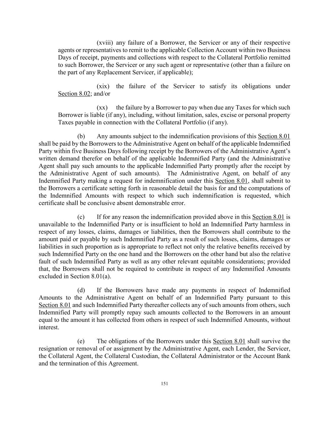 151 (xviii) any failure of a Borrower, the Servicer or any of their respective agents or representatives to remit to the applicable Collection Account within two Business Days of receipt, payments and collections with respect to the Collateral Portfolio remitted to such Borrower, the Servicer or any such agent or representative (other than a failure on the part of any Replacement Servicer, if applicable); (xix) the failure of the Servicer to satisfy its obligations under Section 8.02; and/or (xx) the failure by a Borrower to pay when due any Taxes for which such Borrower is liable (if any), including, without limitation, sales, excise or personal property Taxes payable in connection with the Collateral Portfolio (if any). (b) Any amounts subject to the indemnification provisions of this Section 8.01 shall be paid by the Borrowers to the Administrative Agent on behalf of the applicable Indemnified Party within five Business Days following receipt by the Borrowers of the Administrative Agent’s written demand therefor on behalf of the applicable Indemnified Party (and the Administrative Agent shall pay such amounts to the applicable Indemnified Party promptly after the receipt by the Administrative Agent of such amounts). The Administrative Agent, on behalf of any Indemnified Party making a request for indemnification under this Section 8.01, shall submit to the Borrowers a certificate setting forth in reasonable detail the basis for and the computations of the Indemnified Amounts with respect to which such indemnification is requested, which certificate shall be conclusive absent demonstrable error. (c) If for any reason the indemnification provided above in this Section 8.01 is unavailable to the Indemnified Party or is insufficient to hold an Indemnified Party harmless in respect of any losses, claims, damages or liabilities, then the Borrowers shall contribute to the amount paid or payable by such Indemnified Party as a result of such losses, claims, damages or liabilities in such proportion as is appropriate to reflect not only the relative benefits received by such Indemnified Party on the one hand and the Borrowers on the other hand but also the relative fault of such Indemnified Party as well as any other relevant equitable considerations; provided that, the Borrowers shall not be required to contribute in respect of any Indemnified Amounts excluded in Section 8.01(a). (d) If the Borrowers have made any payments in respect of Indemnified Amounts to the Administrative Agent on behalf of an Indemnified Party pursuant to this Section 8.01 and such Indemnified Party thereafter collects any of such amounts from others, such Indemnified Party will promptly repay such amounts collected to the Borrowers in an amount equal to the amount it has collected from others in respect of such Indemnified Amounts, without interest. (e) The obligations of the Borrowers under this Section 8.01 shall survive the resignation or removal of or assignment by the Administrative Agent, each Lender, the Servicer, the Collateral Agent, the Collateral Custodian, the Collateral Administrator or the Account Bank and the termination of this Agreement.