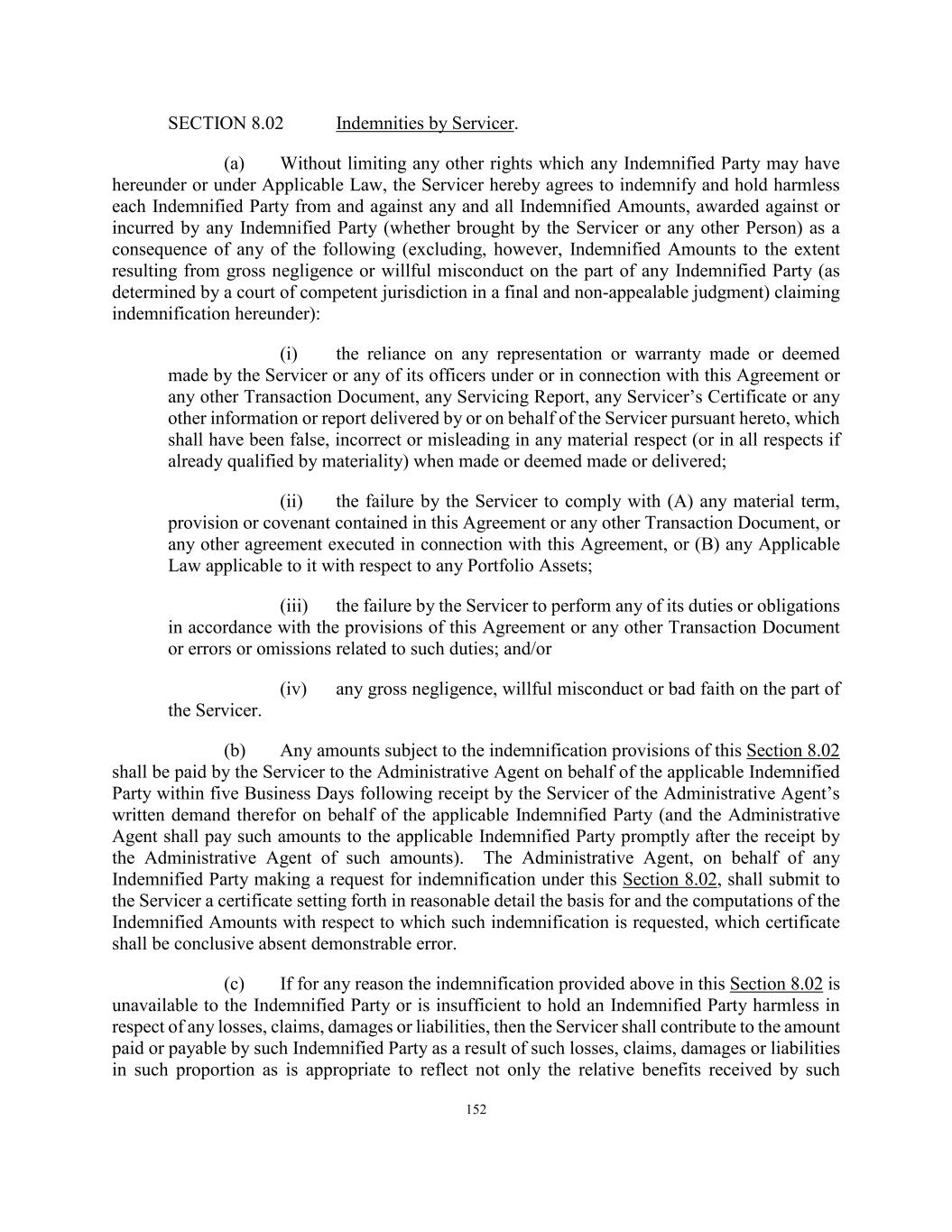 152 SECTION 8.02 Indemnities by Servicer. (a) Without limiting any other rights which any Indemnified Party may have hereunder or under Applicable Law, the Servicer hereby agrees to indemnify and hold harmless each Indemnified Party from and against any and all Indemnified Amounts, awarded against or incurred by any Indemnified Party (whether brought by the Servicer or any other Person) as a consequence of any of the following (excluding, however, Indemnified Amounts to the extent resulting from gross negligence or willful misconduct on the part of any Indemnified Party (as determined by a court of competent jurisdiction in a final and non-appealable judgment) claiming indemnification hereunder): (i) the reliance on any representation or warranty made or deemed made by the Servicer or any of its officers under or in connection with this Agreement or any other Transaction Document, any Servicing Report, any Servicer’s Certificate or any other information or report delivered by or on behalf of the Servicer pursuant hereto, which shall have been false, incorrect or misleading in any material respect (or in all respects if already qualified by materiality) when made or deemed made or delivered; (ii) the failure by the Servicer to comply with (A) any material term, provision or covenant contained in this Agreement or any other Transaction Document, or any other agreement executed in connection with this Agreement, or (B) any Applicable Law applicable to it with respect to any Portfolio Assets; (iii) the failure by the Servicer to perform any of its duties or obligations in accordance with the provisions of this Agreement or any other Transaction Document or errors or omissions related to such duties; and/or (iv) any gross negligence, willful misconduct or bad faith on the part of the Servicer. (b) Any amounts subject to the indemnification provisions of this Section 8.02 shall be paid by the Servicer to the Administrative Agent on behalf of the applicable Indemnified Party within five Business Days following receipt by the Servicer of the Administrative Agent’s written demand therefor on behalf of the applicable Indemnified Party (and the Administrative Agent shall pay such amounts to the applicable Indemnified Party promptly after the receipt by the Administrative Agent of such amounts). The Administrative Agent, on behalf of any Indemnified Party making a request for indemnification under this Section 8.02, shall submit to the Servicer a certificate setting forth in reasonable detail the basis for and the computations of the Indemnified Amounts with respect to which such indemnification is requested, which certificate shall be conclusive absent demonstrable error. (c) If for any reason the indemnification provided above in this Section 8.02 is unavailable to the Indemnified Party or is insufficient to hold an Indemnified Party harmless in respect of any losses, claims, damages or liabilities, then the Servicer shall contribute to the amount paid or payable by such Indemnified Party as a result of such losses, claims, damages or liabilities in such proportion as is appropriate to reflect not only the relative benefits received by such