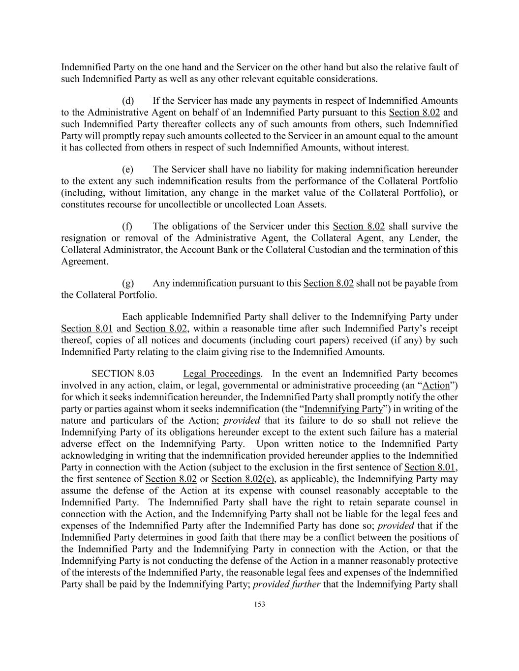 153 Indemnified Party on the one hand and the Servicer on the other hand but also the relative fault of such Indemnified Party as well as any other relevant equitable considerations. (d) If the Servicer has made any payments in respect of Indemnified Amounts to the Administrative Agent on behalf of an Indemnified Party pursuant to this Section 8.02 and such Indemnified Party thereafter collects any of such amounts from others, such Indemnified Party will promptly repay such amounts collected to the Servicer in an amount equal to the amount it has collected from others in respect of such Indemnified Amounts, without interest. (e) The Servicer shall have no liability for making indemnification hereunder to the extent any such indemnification results from the performance of the Collateral Portfolio (including, without limitation, any change in the market value of the Collateral Portfolio), or constitutes recourse for uncollectible or uncollected Loan Assets. (f) The obligations of the Servicer under this Section 8.02 shall survive the resignation or removal of the Administrative Agent, the Collateral Agent, any Lender, the Collateral Administrator, the Account Bank or the Collateral Custodian and the termination of this Agreement. (g) Any indemnification pursuant to this Section 8.02 shall not be payable from the Collateral Portfolio. Each applicable Indemnified Party shall deliver to the Indemnifying Party under Section 8.01 and Section 8.02, within a reasonable time after such Indemnified Party’s receipt thereof, copies of all notices and documents (including court papers) received (if any) by such Indemnified Party relating to the claim giving rise to the Indemnified Amounts. SECTION 8.03 Legal Proceedings. In the event an Indemnified Party becomes involved in any action, claim, or legal, governmental or administrative proceeding (an “Action”) for which it seeks indemnification hereunder, the Indemnified Party shall promptly notify the other party or parties against whom it seeks indemnification (the “Indemnifying Party”) in writing of the nature and particulars of the Action; provided that its failure to do so shall not relieve the Indemnifying Party of its obligations hereunder except to the extent such failure has a material adverse effect on the Indemnifying Party. Upon written notice to the Indemnified Party acknowledging in writing that the indemnification provided hereunder applies to the Indemnified Party in connection with the Action (subject to the exclusion in the first sentence of Section 8.01, the first sentence of Section 8.02 or Section 8.02(e), as applicable), the Indemnifying Party may assume the defense of the Action at its expense with counsel reasonably acceptable to the Indemnified Party. The Indemnified Party shall have the right to retain separate counsel in connection with the Action, and the Indemnifying Party shall not be liable for the legal fees and expenses of the Indemnified Party after the Indemnified Party has done so; provided that if the Indemnified Party determines in good faith that there may be a conflict between the positions of the Indemnified Party and the Indemnifying Party in connection with the Action, or that the Indemnifying Party is not conducting the defense of the Action in a manner reasonably protective of the interests of the Indemnified Party, the reasonable legal fees and expenses of the Indemnified Party shall be paid by the Indemnifying Party; provided further that the Indemnifying Party shall