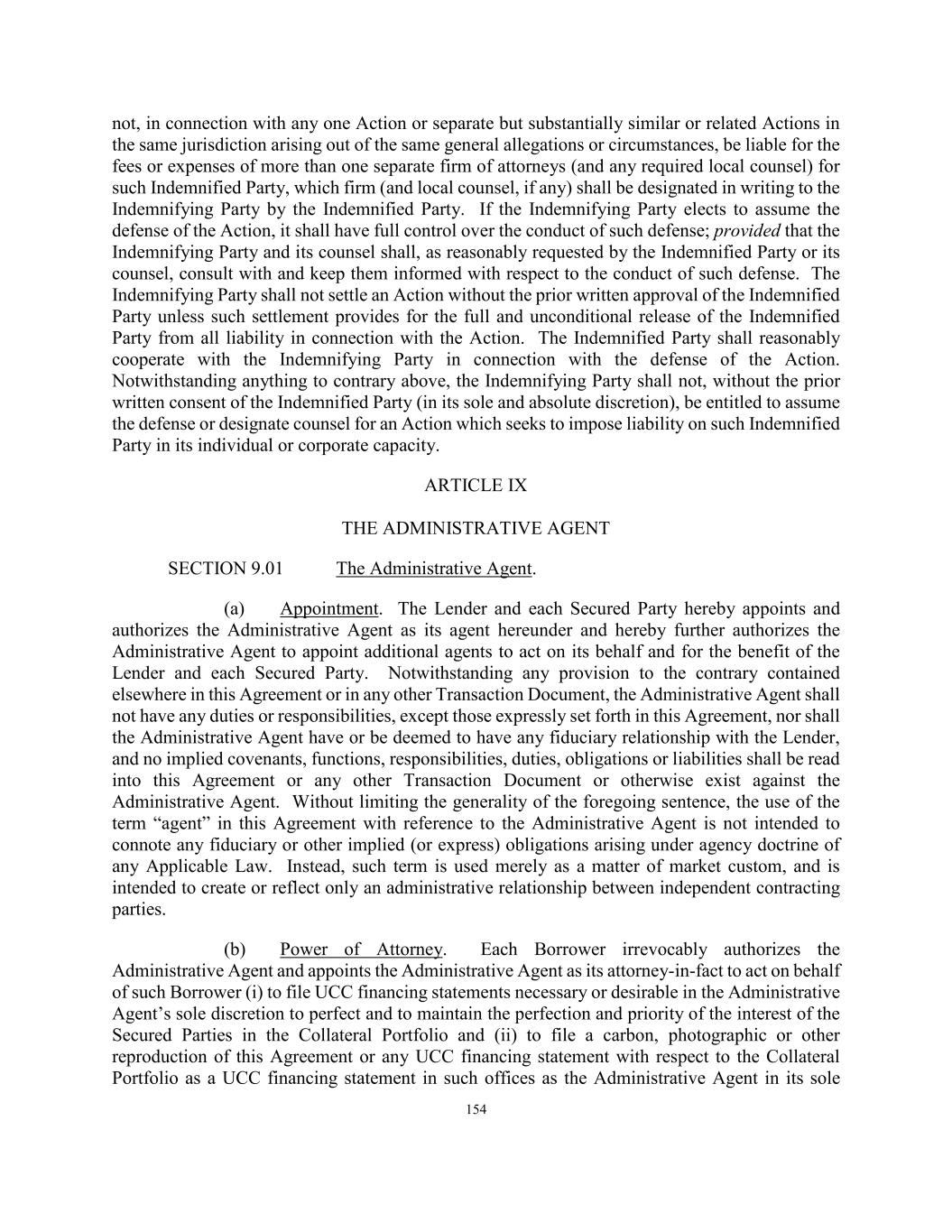 154 not, in connection with any one Action or separate but substantially similar or related Actions in the same jurisdiction arising out of the same general allegations or circumstances, be liable for the fees or expenses of more than one separate firm of attorneys (and any required local counsel) for such Indemnified Party, which firm (and local counsel, if any) shall be designated in writing to the Indemnifying Party by the Indemnified Party. If the Indemnifying Party elects to assume the defense of the Action, it shall have full control over the conduct of such defense; provided that the Indemnifying Party and its counsel shall, as reasonably requested by the Indemnified Party or its counsel, consult with and keep them informed with respect to the conduct of such defense. The Indemnifying Party shall not settle an Action without the prior written approval of the Indemnified Party unless such settlement provides for the full and unconditional release of the Indemnified Party from all liability in connection with the Action. The Indemnified Party shall reasonably cooperate with the Indemnifying Party in connection with the defense of the Action. Notwithstanding anything to contrary above, the Indemnifying Party shall not, without the prior written consent of the Indemnified Party (in its sole and absolute discretion), be entitled to assume the defense or designate counsel for an Action which seeks to impose liability on such Indemnified Party in its individual or corporate capacity. ARTICLE IX THE ADMINISTRATIVE AGENT SECTION 9.01 The Administrative Agent. (a) Appointment. The Lender and each Secured Party hereby appoints and authorizes the Administrative Agent as its agent hereunder and hereby further authorizes the Administrative Agent to appoint additional agents to act on its behalf and for the benefit of the Lender and each Secured Party. Notwithstanding any provision to the contrary contained elsewhere in this Agreement or in any other Transaction Document, the Administrative Agent shall not have any duties or responsibilities, except those expressly set forth in this Agreement, nor shall the Administrative Agent have or be deemed to have any fiduciary relationship with the Lender, and no implied covenants, functions, responsibilities, duties, obligations or liabilities shall be read into this Agreement or any other Transaction Document or otherwise exist against the Administrative Agent. Without limiting the generality of the foregoing sentence, the use of the term “agent” in this Agreement with reference to the Administrative Agent is not intended to connote any fiduciary or other implied (or express) obligations arising under agency doctrine of any Applicable Law. Instead, such term is used merely as a matter of market custom, and is intended to create or reflect only an administrative relationship between independent contracting parties. (b) Power of Attorney. Each Borrower irrevocably authorizes the Administrative Agent and appoints the Administrative Agent as its attorney-in-fact to act on behalf of such Borrower (i) to file UCC financing statements necessary or desirable in the Administrative Agent’s sole discretion to perfect and to maintain the perfection and priority of the interest of the Secured Parties in the Collateral Portfolio and (ii) to file a carbon, photographic or other reproduction of this Agreement or any UCC financing statement with respect to the Collateral Portfolio as a UCC financing statement in such offices as the Administrative Agent in its sole