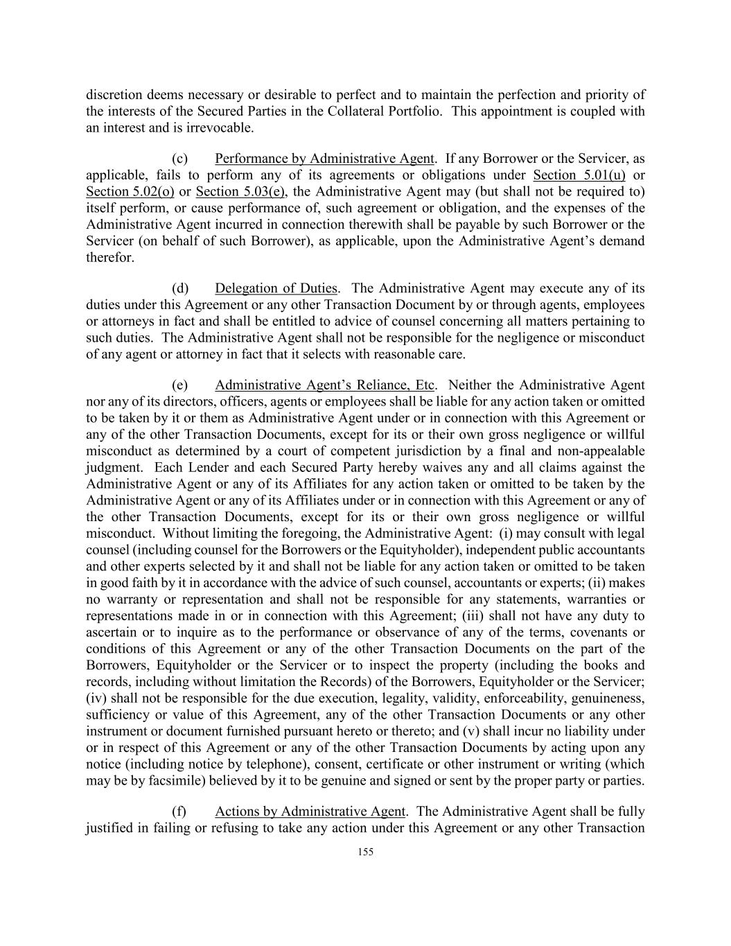 155 discretion deems necessary or desirable to perfect and to maintain the perfection and priority of the interests of the Secured Parties in the Collateral Portfolio. This appointment is coupled with an interest and is irrevocable. (c) Performance by Administrative Agent. If any Borrower or the Servicer, as applicable, fails to perform any of its agreements or obligations under Section 5.01(u) or Section 5.02(o) or Section 5.03(e), the Administrative Agent may (but shall not be required to) itself perform, or cause performance of, such agreement or obligation, and the expenses of the Administrative Agent incurred in connection therewith shall be payable by such Borrower or the Servicer (on behalf of such Borrower), as applicable, upon the Administrative Agent’s demand therefor. (d) Delegation of Duties. The Administrative Agent may execute any of its duties under this Agreement or any other Transaction Document by or through agents, employees or attorneys in fact and shall be entitled to advice of counsel concerning all matters pertaining to such duties. The Administrative Agent shall not be responsible for the negligence or misconduct of any agent or attorney in fact that it selects with reasonable care. (e) Administrative Agent’s Reliance, Etc. Neither the Administrative Agent nor any of its directors, officers, agents or employees shall be liable for any action taken or omitted to be taken by it or them as Administrative Agent under or in connection with this Agreement or any of the other Transaction Documents, except for its or their own gross negligence or willful misconduct as determined by a court of competent jurisdiction by a final and non-appealable judgment. Each Lender and each Secured Party hereby waives any and all claims against the Administrative Agent or any of its Affiliates for any action taken or omitted to be taken by the Administrative Agent or any of its Affiliates under or in connection with this Agreement or any of the other Transaction Documents, except for its or their own gross negligence or willful misconduct. Without limiting the foregoing, the Administrative Agent: (i) may consult with legal counsel (including counsel for the Borrowers or the Equityholder), independent public accountants and other experts selected by it and shall not be liable for any action taken or omitted to be taken in good faith by it in accordance with the advice of such counsel, accountants or experts; (ii) makes no warranty or representation and shall not be responsible for any statements, warranties or representations made in or in connection with this Agreement; (iii) shall not have any duty to ascertain or to inquire as to the performance or observance of any of the terms, covenants or conditions of this Agreement or any of the other Transaction Documents on the part of the Borrowers, Equityholder or the Servicer or to inspect the property (including the books and records, including without limitation the Records) of the Borrowers, Equityholder or the Servicer; (iv) shall not be responsible for the due execution, legality, validity, enforceability, genuineness, sufficiency or value of this Agreement, any of the other Transaction Documents or any other instrument or document furnished pursuant hereto or thereto; and (v) shall incur no liability under or in respect of this Agreement or any of the other Transaction Documents by acting upon any notice (including notice by telephone), consent, certificate or other instrument or writing (which may be by facsimile) believed by it to be genuine and signed or sent by the proper party or parties. (f) Actions by Administrative Agent. The Administrative Agent shall be fully justified in failing or refusing to take any action under this Agreement or any other Transaction