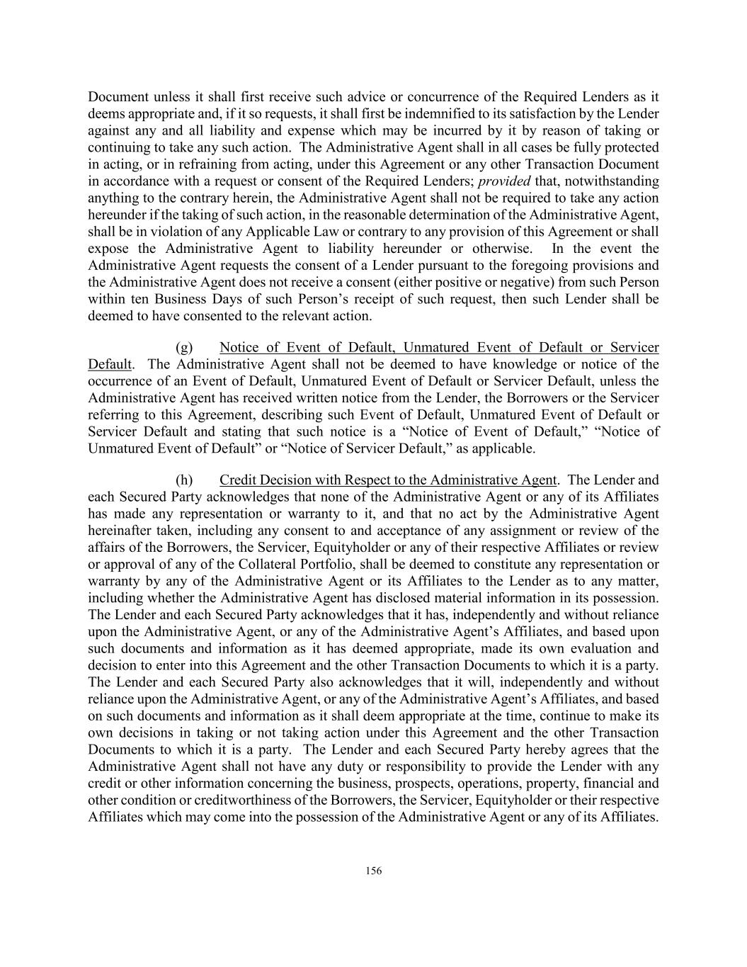 156 Document unless it shall first receive such advice or concurrence of the Required Lenders as it deems appropriate and, if it so requests, it shall first be indemnified to its satisfaction by the Lender against any and all liability and expense which may be incurred by it by reason of taking or continuing to take any such action. The Administrative Agent shall in all cases be fully protected in acting, or in refraining from acting, under this Agreement or any other Transaction Document in accordance with a request or consent of the Required Lenders; provided that, notwithstanding anything to the contrary herein, the Administrative Agent shall not be required to take any action hereunder if the taking of such action, in the reasonable determination of the Administrative Agent, shall be in violation of any Applicable Law or contrary to any provision of this Agreement or shall expose the Administrative Agent to liability hereunder or otherwise. In the event the Administrative Agent requests the consent of a Lender pursuant to the foregoing provisions and the Administrative Agent does not receive a consent (either positive or negative) from such Person within ten Business Days of such Person’s receipt of such request, then such Lender shall be deemed to have consented to the relevant action. (g) Notice of Event of Default, Unmatured Event of Default or Servicer Default. The Administrative Agent shall not be deemed to have knowledge or notice of the occurrence of an Event of Default, Unmatured Event of Default or Servicer Default, unless the Administrative Agent has received written notice from the Lender, the Borrowers or the Servicer referring to this Agreement, describing such Event of Default, Unmatured Event of Default or Servicer Default and stating that such notice is a “Notice of Event of Default,” “Notice of Unmatured Event of Default” or “Notice of Servicer Default,” as applicable. (h) Credit Decision with Respect to the Administrative Agent. The Lender and each Secured Party acknowledges that none of the Administrative Agent or any of its Affiliates has made any representation or warranty to it, and that no act by the Administrative Agent hereinafter taken, including any consent to and acceptance of any assignment or review of the affairs of the Borrowers, the Servicer, Equityholder or any of their respective Affiliates or review or approval of any of the Collateral Portfolio, shall be deemed to constitute any representation or warranty by any of the Administrative Agent or its Affiliates to the Lender as to any matter, including whether the Administrative Agent has disclosed material information in its possession. The Lender and each Secured Party acknowledges that it has, independently and without reliance upon the Administrative Agent, or any of the Administrative Agent’s Affiliates, and based upon such documents and information as it has deemed appropriate, made its own evaluation and decision to enter into this Agreement and the other Transaction Documents to which it is a party. The Lender and each Secured Party also acknowledges that it will, independently and without reliance upon the Administrative Agent, or any of the Administrative Agent’s Affiliates, and based on such documents and information as it shall deem appropriate at the time, continue to make its own decisions in taking or not taking action under this Agreement and the other Transaction Documents to which it is a party. The Lender and each Secured Party hereby agrees that the Administrative Agent shall not have any duty or responsibility to provide the Lender with any credit or other information concerning the business, prospects, operations, property, financial and other condition or creditworthiness of the Borrowers, the Servicer, Equityholder or their respective Affiliates which may come into the possession of the Administrative Agent or any of its Affiliates.