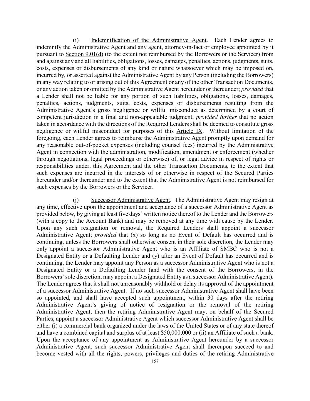 157 (i) Indemnification of the Administrative Agent. Each Lender agrees to indemnify the Administrative Agent and any agent, attorney-in-fact or employee appointed by it pursuant to Section 9.01(d) (to the extent not reimbursed by the Borrowers or the Servicer) from and against any and all liabilities, obligations, losses, damages, penalties, actions, judgments, suits, costs, expenses or disbursements of any kind or nature whatsoever which may be imposed on, incurred by, or asserted against the Administrative Agent by any Person (including the Borrowers) in any way relating to or arising out of this Agreement or any of the other Transaction Documents, or any action taken or omitted by the Administrative Agent hereunder or thereunder; provided that a Lender shall not be liable for any portion of such liabilities, obligations, losses, damages, penalties, actions, judgments, suits, costs, expenses or disbursements resulting from the Administrative Agent’s gross negligence or willful misconduct as determined by a court of competent jurisdiction in a final and non-appealable judgment; provided further that no action taken in accordance with the directions of the Required Lenders shall be deemed to constitute gross negligence or willful misconduct for purposes of this Article IX. Without limitation of the foregoing, each Lender agrees to reimburse the Administrative Agent promptly upon demand for any reasonable out-of-pocket expenses (including counsel fees) incurred by the Administrative Agent in connection with the administration, modification, amendment or enforcement (whether through negotiations, legal proceedings or otherwise) of, or legal advice in respect of rights or responsibilities under, this Agreement and the other Transaction Documents, to the extent that such expenses are incurred in the interests of or otherwise in respect of the Secured Parties hereunder and/or thereunder and to the extent that the Administrative Agent is not reimbursed for such expenses by the Borrowers or the Servicer. (j) Successor Administrative Agent. The Administrative Agent may resign at any time, effective upon the appointment and acceptance of a successor Administrative Agent as provided below, by giving at least five days’ written notice thereof to the Lender and the Borrowers (with a copy to the Account Bank) and may be removed at any time with cause by the Lender. Upon any such resignation or removal, the Required Lenders shall appoint a successor Administrative Agent; provided that (x) so long as no Event of Default has occurred and is continuing, unless the Borrowers shall otherwise consent in their sole discretion, the Lender may only appoint a successor Administrative Agent who is an Affiliate of SMBC who is not a Designated Entity or a Defaulting Lender and (y) after an Event of Default has occurred and is continuing, the Lender may appoint any Person as a successor Administrative Agent who is not a Designated Entity or a Defaulting Lender (and with the consent of the Borrowers, in the Borrowers’ sole discretion, may appoint a Designated Entity as a successor Administrative Agent). The Lender agrees that it shall not unreasonably withhold or delay its approval of the appointment of a successor Administrative Agent. If no such successor Administrative Agent shall have been so appointed, and shall have accepted such appointment, within 30 days after the retiring Administrative Agent’s giving of notice of resignation or the removal of the retiring Administrative Agent, then the retiring Administrative Agent may, on behalf of the Secured Parties, appoint a successor Administrative Agent which successor Administrative Agent shall be either (i) a commercial bank organized under the laws of the United States or of any state thereof and have a combined capital and surplus of at least $50,000,000 or (ii) an Affiliate of such a bank. Upon the acceptance of any appointment as Administrative Agent hereunder by a successor Administrative Agent, such successor Administrative Agent shall thereupon succeed to and become vested with all the rights, powers, privileges and duties of the retiring Administrative