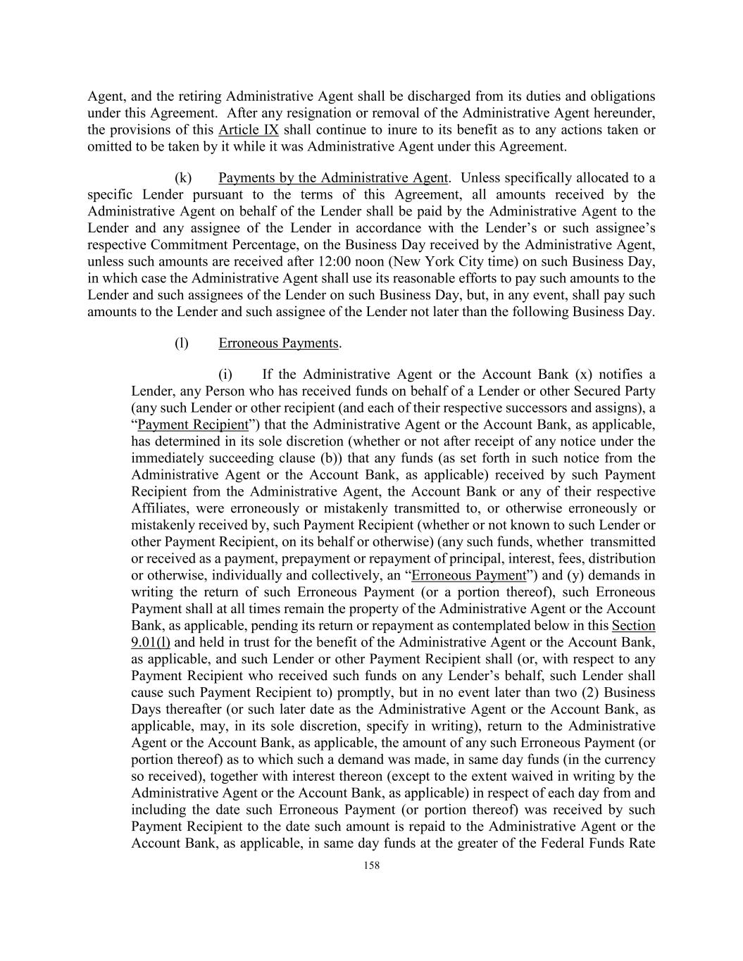 158 Agent, and the retiring Administrative Agent shall be discharged from its duties and obligations under this Agreement. After any resignation or removal of the Administrative Agent hereunder, the provisions of this Article IX shall continue to inure to its benefit as to any actions taken or omitted to be taken by it while it was Administrative Agent under this Agreement. (k) Payments by the Administrative Agent. Unless specifically allocated to a specific Lender pursuant to the terms of this Agreement, all amounts received by the Administrative Agent on behalf of the Lender shall be paid by the Administrative Agent to the Lender and any assignee of the Lender in accordance with the Lender’s or such assignee’s respective Commitment Percentage, on the Business Day received by the Administrative Agent, unless such amounts are received after 12:00 noon (New York City time) on such Business Day, in which case the Administrative Agent shall use its reasonable efforts to pay such amounts to the Lender and such assignees of the Lender on such Business Day, but, in any event, shall pay such amounts to the Lender and such assignee of the Lender not later than the following Business Day. (l) Erroneous Payments. (i) If the Administrative Agent or the Account Bank (x) notifies a Lender, any Person who has received funds on behalf of a Lender or other Secured Party (any such Lender or other recipient (and each of their respective successors and assigns), a “Payment Recipient”) that the Administrative Agent or the Account Bank, as applicable, has determined in its sole discretion (whether or not after receipt of any notice under the immediately succeeding clause (b)) that any funds (as set forth in such notice from the Administrative Agent or the Account Bank, as applicable) received by such Payment Recipient from the Administrative Agent, the Account Bank or any of their respective Affiliates, were erroneously or mistakenly transmitted to, or otherwise erroneously or mistakenly received by, such Payment Recipient (whether or not known to such Lender or other Payment Recipient, on its behalf or otherwise) (any such funds, whether transmitted or received as a payment, prepayment or repayment of principal, interest, fees, distribution or otherwise, individually and collectively, an “Erroneous Payment”) and (y) demands in writing the return of such Erroneous Payment (or a portion thereof), such Erroneous Payment shall at all times remain the property of the Administrative Agent or the Account Bank, as applicable, pending its return or repayment as contemplated below in this Section 9.01(l) and held in trust for the benefit of the Administrative Agent or the Account Bank, as applicable, and such Lender or other Payment Recipient shall (or, with respect to any Payment Recipient who received such funds on any Lender’s behalf, such Lender shall cause such Payment Recipient to) promptly, but in no event later than two (2) Business Days thereafter (or such later date as the Administrative Agent or the Account Bank, as applicable, may, in its sole discretion, specify in writing), return to the Administrative Agent or the Account Bank, as applicable, the amount of any such Erroneous Payment (or portion thereof) as to which such a demand was made, in same day funds (in the currency so received), together with interest thereon (except to the extent waived in writing by the Administrative Agent or the Account Bank, as applicable) in respect of each day from and including the date such Erroneous Payment (or portion thereof) was received by such Payment Recipient to the date such amount is repaid to the Administrative Agent or the Account Bank, as applicable, in same day funds at the greater of the Federal Funds Rate