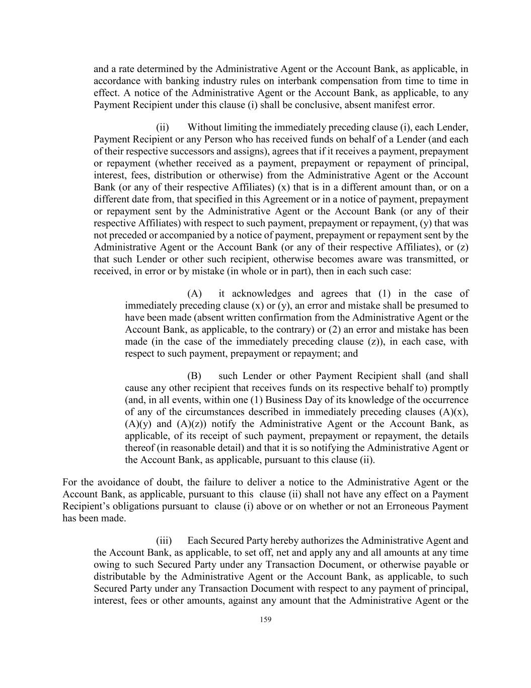 159 and a rate determined by the Administrative Agent or the Account Bank, as applicable, in accordance with banking industry rules on interbank compensation from time to time in effect. A notice of the Administrative Agent or the Account Bank, as applicable, to any Payment Recipient under this clause (i) shall be conclusive, absent manifest error. (ii) Without limiting the immediately preceding clause (i), each Lender, Payment Recipient or any Person who has received funds on behalf of a Lender (and each of their respective successors and assigns), agrees that if it receives a payment, prepayment or repayment (whether received as a payment, prepayment or repayment of principal, interest, fees, distribution or otherwise) from the Administrative Agent or the Account Bank (or any of their respective Affiliates) (x) that is in a different amount than, or on a different date from, that specified in this Agreement or in a notice of payment, prepayment or repayment sent by the Administrative Agent or the Account Bank (or any of their respective Affiliates) with respect to such payment, prepayment or repayment, (y) that was not preceded or accompanied by a notice of payment, prepayment or repayment sent by the Administrative Agent or the Account Bank (or any of their respective Affiliates), or (z) that such Lender or other such recipient, otherwise becomes aware was transmitted, or received, in error or by mistake (in whole or in part), then in each such case: (A) it acknowledges and agrees that (1) in the case of immediately preceding clause (x) or (y), an error and mistake shall be presumed to have been made (absent written confirmation from the Administrative Agent or the Account Bank, as applicable, to the contrary) or (2) an error and mistake has been made (in the case of the immediately preceding clause (z)), in each case, with respect to such payment, prepayment or repayment; and (B) such Lender or other Payment Recipient shall (and shall cause any other recipient that receives funds on its respective behalf to) promptly (and, in all events, within one (1) Business Day of its knowledge of the occurrence of any of the circumstances described in immediately preceding clauses (A)(x), (A)(y) and (A)(z)) notify the Administrative Agent or the Account Bank, as applicable, of its receipt of such payment, prepayment or repayment, the details thereof (in reasonable detail) and that it is so notifying the Administrative Agent or the Account Bank, as applicable, pursuant to this clause (ii). For the avoidance of doubt, the failure to deliver a notice to the Administrative Agent or the Account Bank, as applicable, pursuant to this clause (ii) shall not have any effect on a Payment Recipient’s obligations pursuant to clause (i) above or on whether or not an Erroneous Payment has been made. (iii) Each Secured Party hereby authorizes the Administrative Agent and the Account Bank, as applicable, to set off, net and apply any and all amounts at any time owing to such Secured Party under any Transaction Document, or otherwise payable or distributable by the Administrative Agent or the Account Bank, as applicable, to such Secured Party under any Transaction Document with respect to any payment of principal, interest, fees or other amounts, against any amount that the Administrative Agent or the