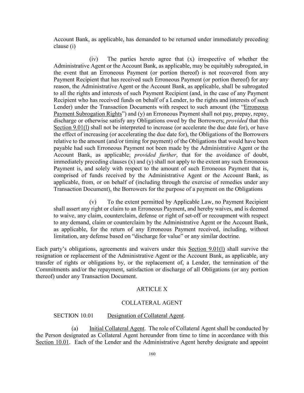 160 Account Bank, as applicable, has demanded to be returned under immediately preceding clause (i) (iv) The parties hereto agree that (x) irrespective of whether the Administrative Agent or the Account Bank, as applicable, may be equitably subrogated, in the event that an Erroneous Payment (or portion thereof) is not recovered from any Payment Recipient that has received such Erroneous Payment (or portion thereof) for any reason, the Administrative Agent or the Account Bank, as applicable, shall be subrogated to all the rights and interests of such Payment Recipient (and, in the case of any Payment Recipient who has received funds on behalf of a Lender, to the rights and interests of such Lender) under the Transaction Documents with respect to such amount (the “Erroneous Payment Subrogation Rights”) and (y) an Erroneous Payment shall not pay, prepay, repay, discharge or otherwise satisfy any Obligations owed by the Borrowers; provided that this Section 9.01(l) shall not be interpreted to increase (or accelerate the due date for), or have the effect of increasing (or accelerating the due date for), the Obligations of the Borrowers relative to the amount (and/or timing for payment) of the Obligations that would have been payable had such Erroneous Payment not been made by the Administrative Agent or the Account Bank, as applicable; provided further, that for the avoidance of doubt, immediately preceding clauses (x) and (y) shall not apply to the extent any such Erroneous Payment is, and solely with respect to the amount of such Erroneous Payment that is, comprised of funds received by the Administrative Agent or the Account Bank, as applicable, from, or on behalf of (including through the exercise of remedies under any Transaction Document), the Borrowers for the purpose of a payment on the Obligations (v) To the extent permitted by Applicable Law, no Payment Recipient shall assert any right or claim to an Erroneous Payment, and hereby waives, and is deemed to waive, any claim, counterclaim, defense or right of set-off or recoupment with respect to any demand, claim or counterclaim by the Administrative Agent or the Account Bank, as applicable, for the return of any Erroneous Payment received, including, without limitation, any defense based on “discharge for value” or any similar doctrine. Each party’s obligations, agreements and waivers under this Section 9.01(l) shall survive the resignation or replacement of the Administrative Agent or the Account Bank, as applicable, any transfer of rights or obligations by, or the replacement of, a Lender, the termination of the Commitments and/or the repayment, satisfaction or discharge of all Obligations (or any portion thereof) under any Transaction Document. ARTICLE X COLLATERAL AGENT SECTION 10.01 Designation of Collateral Agent. (a) Initial Collateral Agent. The role of Collateral Agent shall be conducted by the Person designated as Collateral Agent hereunder from time to time in accordance with this Section 10.01. Each of the Lender and the Administrative Agent hereby designate and appoint