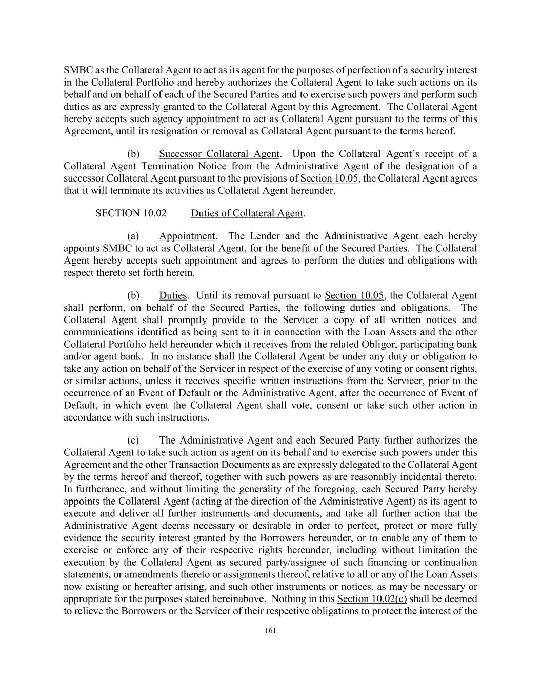 161 SMBC as the Collateral Agent to act as its agent for the purposes of perfection of a security interest in the Collateral Portfolio and hereby authorizes the Collateral Agent to take such actions on its behalf and on behalf of each of the Secured Parties and to exercise such powers and perform such duties as are expressly granted to the Collateral Agent by this Agreement. The Collateral Agent hereby accepts such agency appointment to act as Collateral Agent pursuant to the terms of this Agreement, until its resignation or removal as Collateral Agent pursuant to the terms hereof. (b) Successor Collateral Agent. Upon the Collateral Agent’s receipt of a Collateral Agent Termination Notice from the Administrative Agent of the designation of a successor Collateral Agent pursuant to the provisions of Section 10.05, the Collateral Agent agrees that it will terminate its activities as Collateral Agent hereunder. SECTION 10.02 Duties of Collateral Agent. (a) Appointment. The Lender and the Administrative Agent each hereby appoints SMBC to act as Collateral Agent, for the benefit of the Secured Parties. The Collateral Agent hereby accepts such appointment and agrees to perform the duties and obligations with respect thereto set forth herein. (b) Duties. Until its removal pursuant to Section 10.05, the Collateral Agent shall perform, on behalf of the Secured Parties, the following duties and obligations. The Collateral Agent shall promptly provide to the Servicer a copy of all written notices and communications identified as being sent to it in connection with the Loan Assets and the other Collateral Portfolio held hereunder which it receives from the related Obligor, participating bank and/or agent bank. In no instance shall the Collateral Agent be under any duty or obligation to take any action on behalf of the Servicer in respect of the exercise of any voting or consent rights, or similar actions, unless it receives specific written instructions from the Servicer, prior to the occurrence of an Event of Default or the Administrative Agent, after the occurrence of Event of Default, in which event the Collateral Agent shall vote, consent or take such other action in accordance with such instructions. (c) The Administrative Agent and each Secured Party further authorizes the Collateral Agent to take such action as agent on its behalf and to exercise such powers under this Agreement and the other Transaction Documents as are expressly delegated to the Collateral Agent by the terms hereof and thereof, together with such powers as are reasonably incidental thereto. In furtherance, and without limiting the generality of the foregoing, each Secured Party hereby appoints the Collateral Agent (acting at the direction of the Administrative Agent) as its agent to execute and deliver all further instruments and documents, and take all further action that the Administrative Agent deems necessary or desirable in order to perfect, protect or more fully evidence the security interest granted by the Borrowers hereunder, or to enable any of them to exercise or enforce any of their respective rights hereunder, including without limitation the execution by the Collateral Agent as secured party/assignee of such financing or continuation statements, or amendments thereto or assignments thereof, relative to all or any of the Loan Assets now existing or hereafter arising, and such other instruments or notices, as may be necessary or appropriate for the purposes stated hereinabove. Nothing in this Section 10.02(c) shall be deemed to relieve the Borrowers or the Servicer of their respective obligations to protect the interest of the