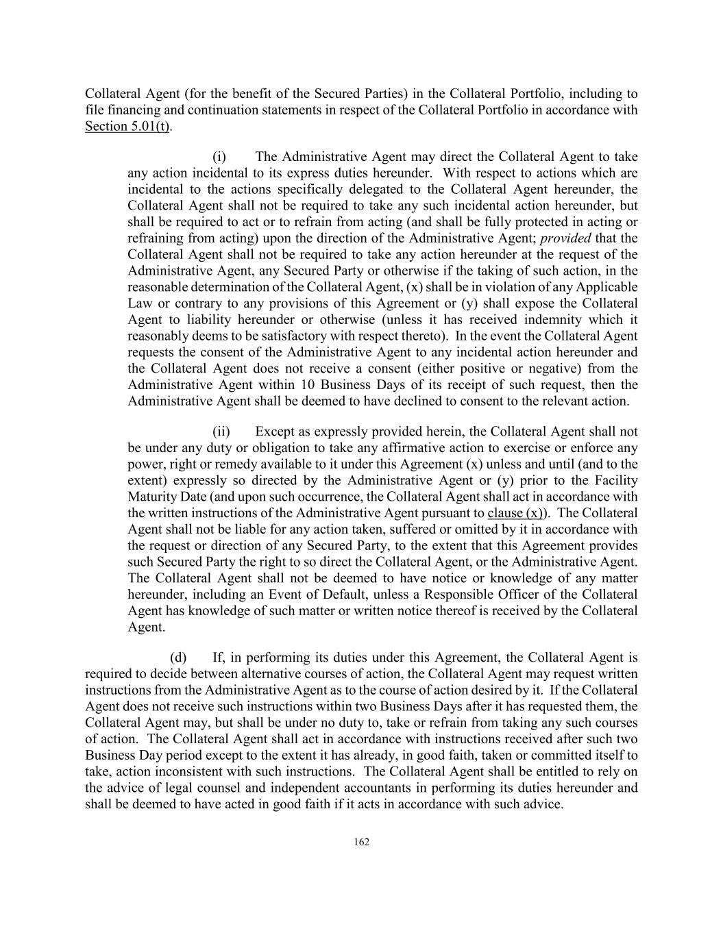 162 Collateral Agent (for the benefit of the Secured Parties) in the Collateral Portfolio, including to file financing and continuation statements in respect of the Collateral Portfolio in accordance with Section 5.01(t). (i) The Administrative Agent may direct the Collateral Agent to take any action incidental to its express duties hereunder. With respect to actions which are incidental to the actions specifically delegated to the Collateral Agent hereunder, the Collateral Agent shall not be required to take any such incidental action hereunder, but shall be required to act or to refrain from acting (and shall be fully protected in acting or refraining from acting) upon the direction of the Administrative Agent; provided that the Collateral Agent shall not be required to take any action hereunder at the request of the Administrative Agent, any Secured Party or otherwise if the taking of such action, in the reasonable determination of the Collateral Agent, (x) shall be in violation of any Applicable Law or contrary to any provisions of this Agreement or (y) shall expose the Collateral Agent to liability hereunder or otherwise (unless it has received indemnity which it reasonably deems to be satisfactory with respect thereto). In the event the Collateral Agent requests the consent of the Administrative Agent to any incidental action hereunder and the Collateral Agent does not receive a consent (either positive or negative) from the Administrative Agent within 10 Business Days of its receipt of such request, then the Administrative Agent shall be deemed to have declined to consent to the relevant action. (ii) Except as expressly provided herein, the Collateral Agent shall not be under any duty or obligation to take any affirmative action to exercise or enforce any power, right or remedy available to it under this Agreement (x) unless and until (and to the extent) expressly so directed by the Administrative Agent or (y) prior to the Facility Maturity Date (and upon such occurrence, the Collateral Agent shall act in accordance with the written instructions of the Administrative Agent pursuant to clause (x)). The Collateral Agent shall not be liable for any action taken, suffered or omitted by it in accordance with the request or direction of any Secured Party, to the extent that this Agreement provides such Secured Party the right to so direct the Collateral Agent, or the Administrative Agent. The Collateral Agent shall not be deemed to have notice or knowledge of any matter hereunder, including an Event of Default, unless a Responsible Officer of the Collateral Agent has knowledge of such matter or written notice thereof is received by the Collateral Agent. (d) If, in performing its duties under this Agreement, the Collateral Agent is required to decide between alternative courses of action, the Collateral Agent may request written instructions from the Administrative Agent as to the course of action desired by it. If the Collateral Agent does not receive such instructions within two Business Days after it has requested them, the Collateral Agent may, but shall be under no duty to, take or refrain from taking any such courses of action. The Collateral Agent shall act in accordance with instructions received after such two Business Day period except to the extent it has already, in good faith, taken or committed itself to take, action inconsistent with such instructions. The Collateral Agent shall be entitled to rely on the advice of legal counsel and independent accountants in performing its duties hereunder and shall be deemed to have acted in good faith if it acts in accordance with such advice.
